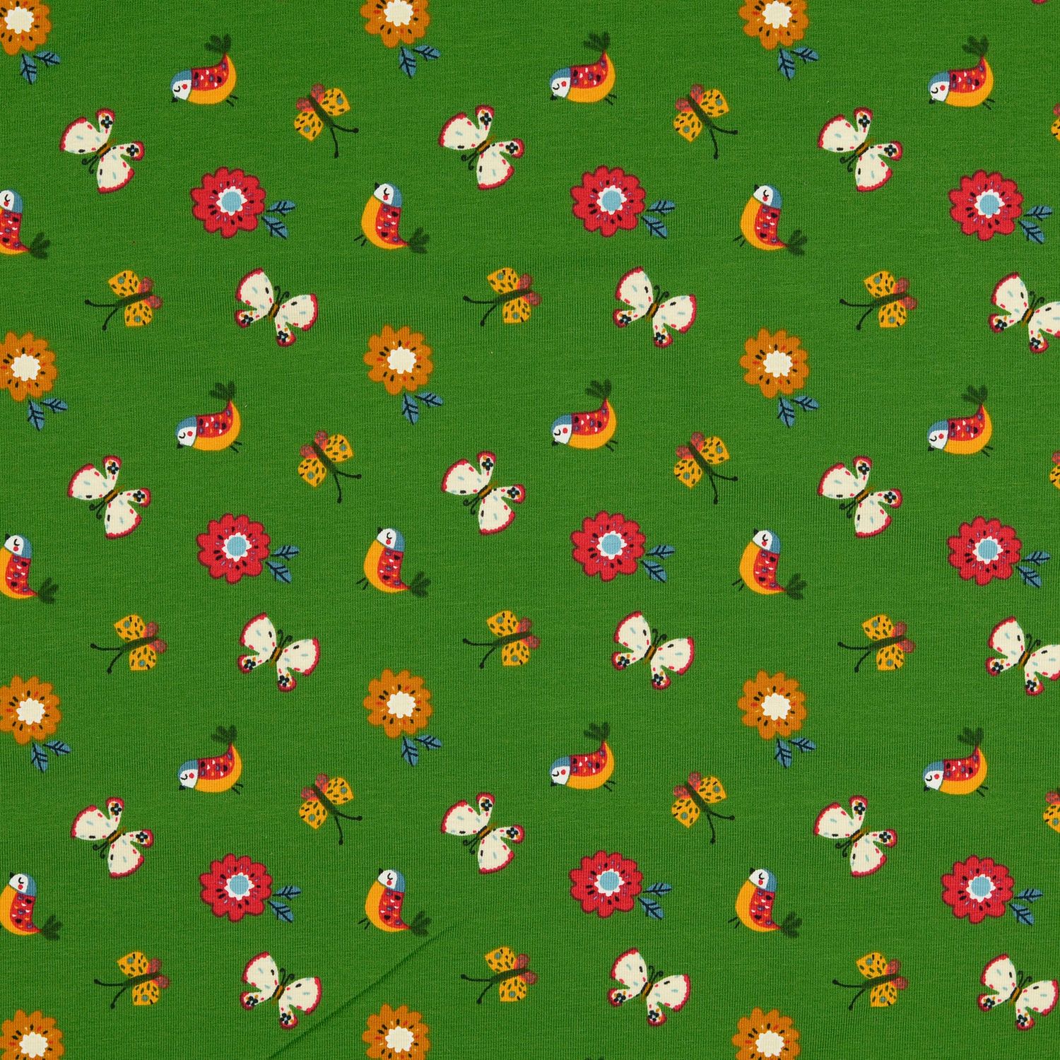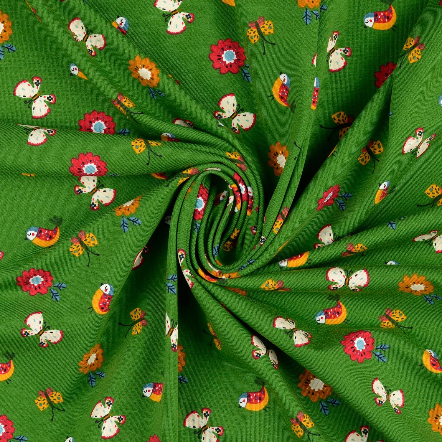 En lekfull vårhälsning som tyg: På en fräsch, djupgrön bakgrund myllrar det av ömtåliga blommor, filigranblad, små fåglar och eleganta fjärilar. De kärleksfullt tecknade motiven i harmoniska, glada färger ger denna jersey ett livfullt men samtidigt underbart mjukt uttryck.