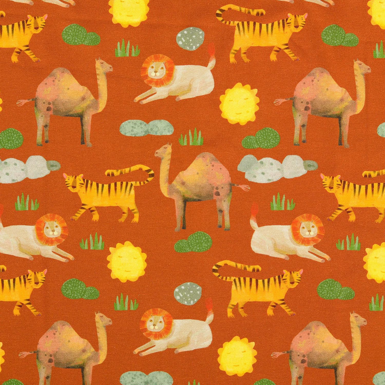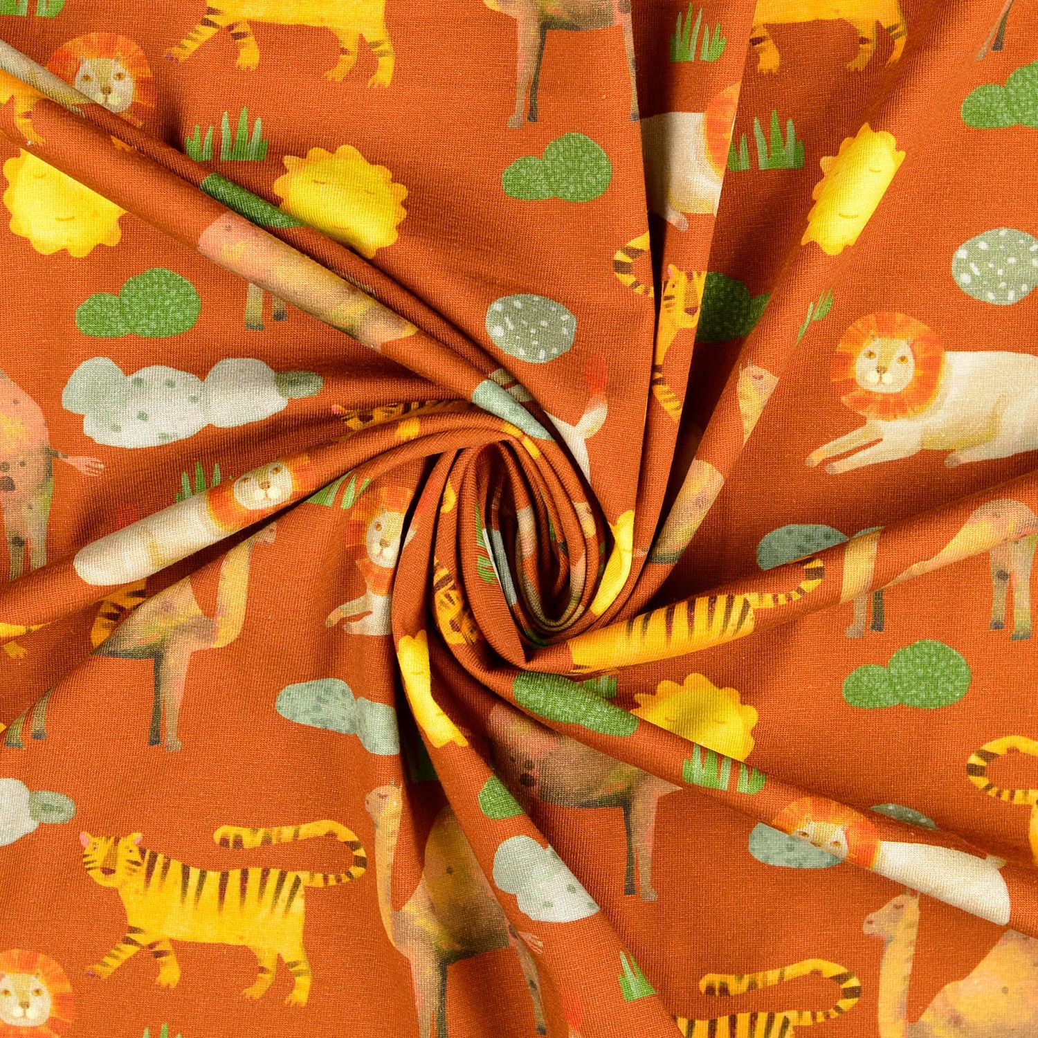 Med denna jersey tar du med savannens äventyr direkt till sybordet. Mot en mjukt melerad bakgrund leker kärleksfullt illustrerade safaridjur: eleganta giraffer, majestätiska elefanter, lejon, zebror och fler – alla i varma koppar- och jordtoner. Fina konturer och detaljerade teckningar ger designen en ädel, lätt nostalgisk look som påminner om handritade skisser.