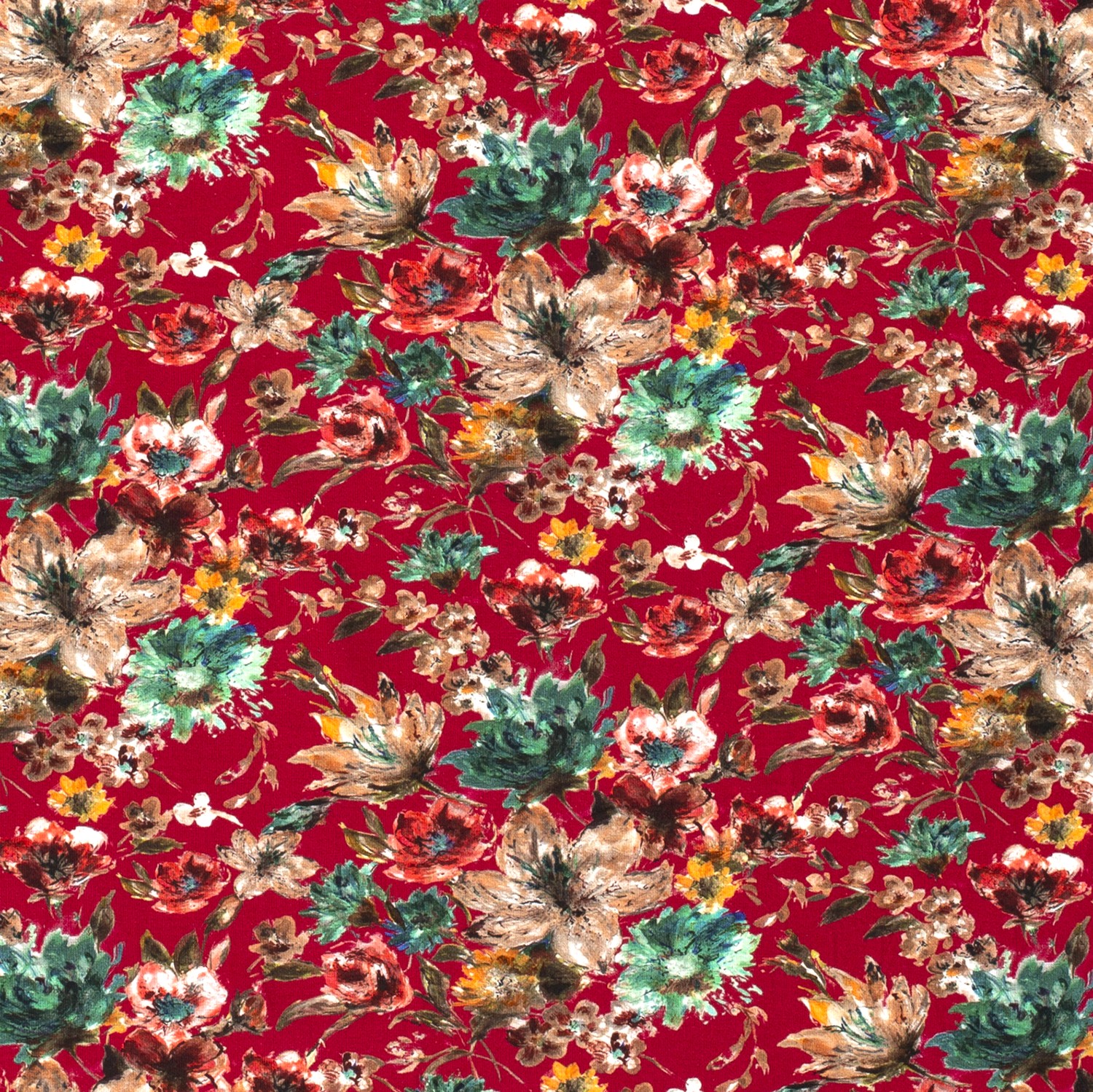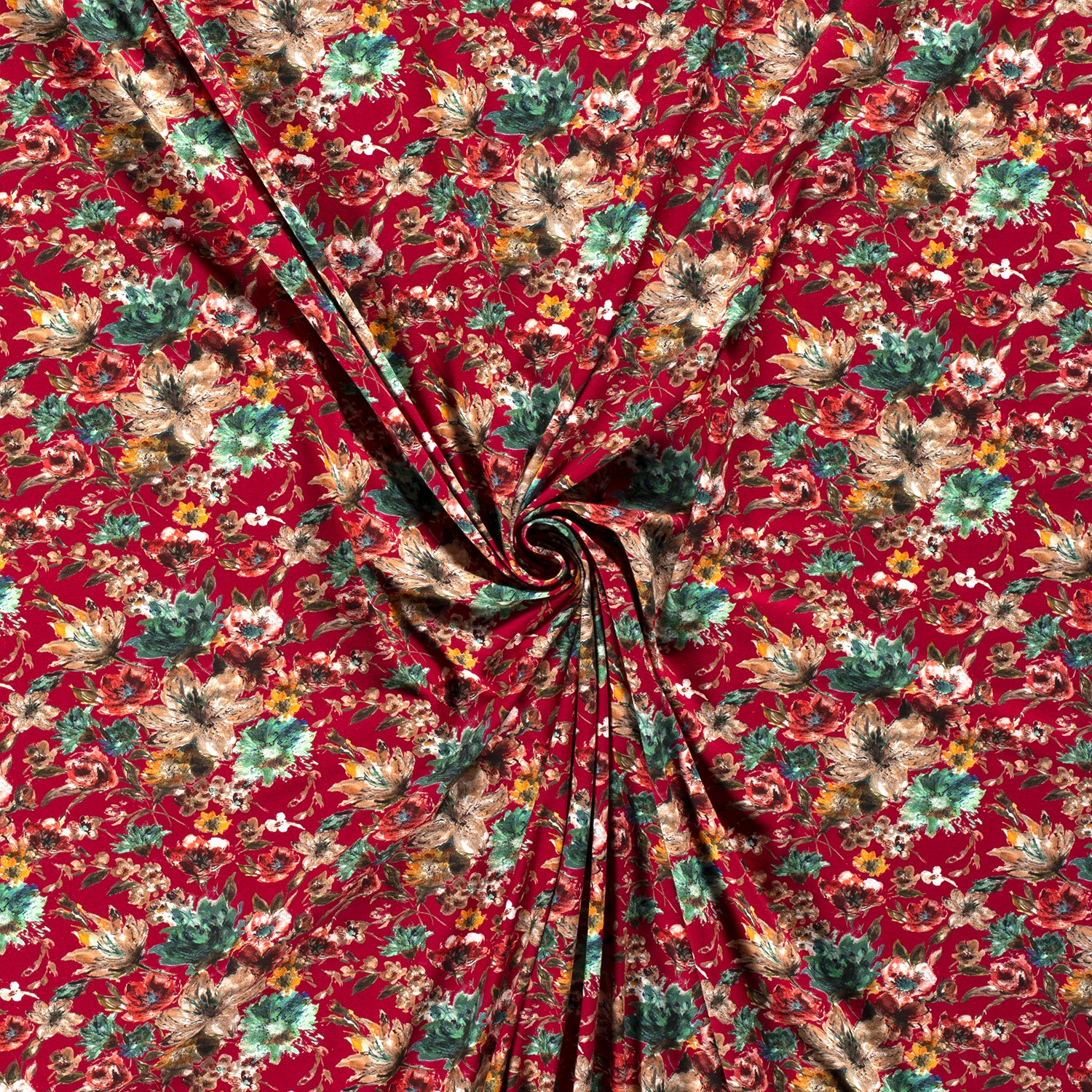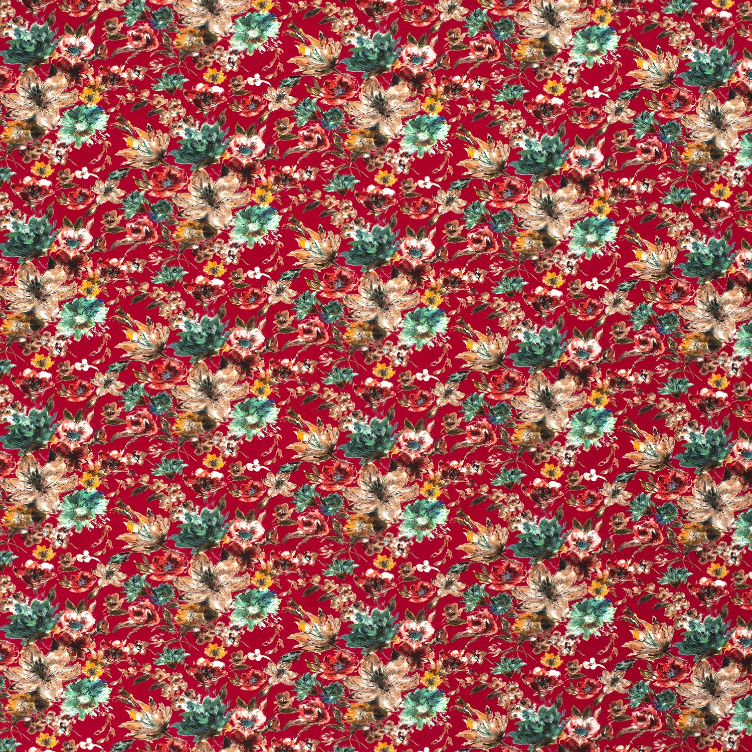 En djup, ädel mörkröd utgör bakgrunden för ett hav av ömtåliga blommor: fina, detaljerade blommor i ljusa rosa- och kremtoner, kompletterade med mjukt grönt, fördelar sig harmoniskt över tyget. Det florala mönstret känns romantiskt, feminint och samtidigt modernt – perfekt för dig som älskar lekfulla mönster utan att det blir för färgglatt.