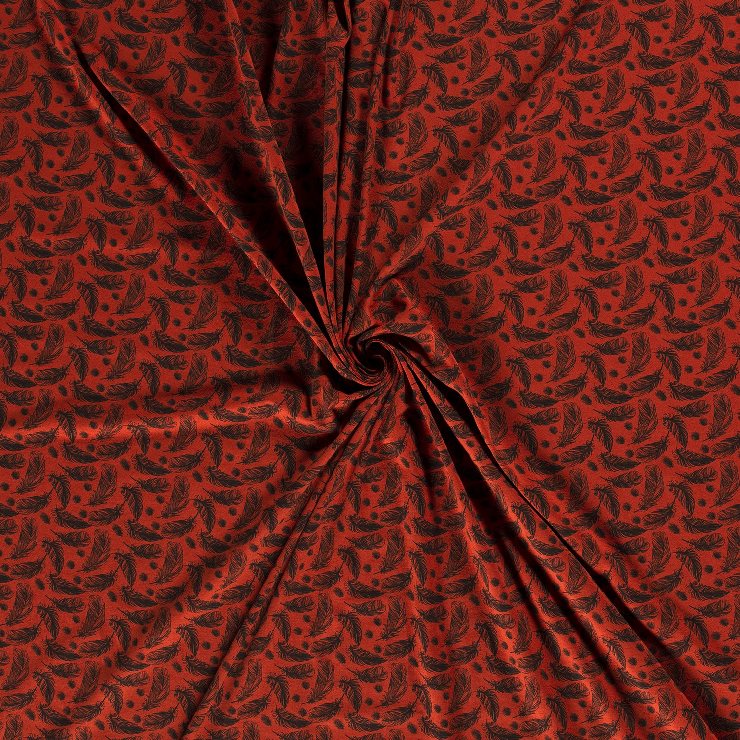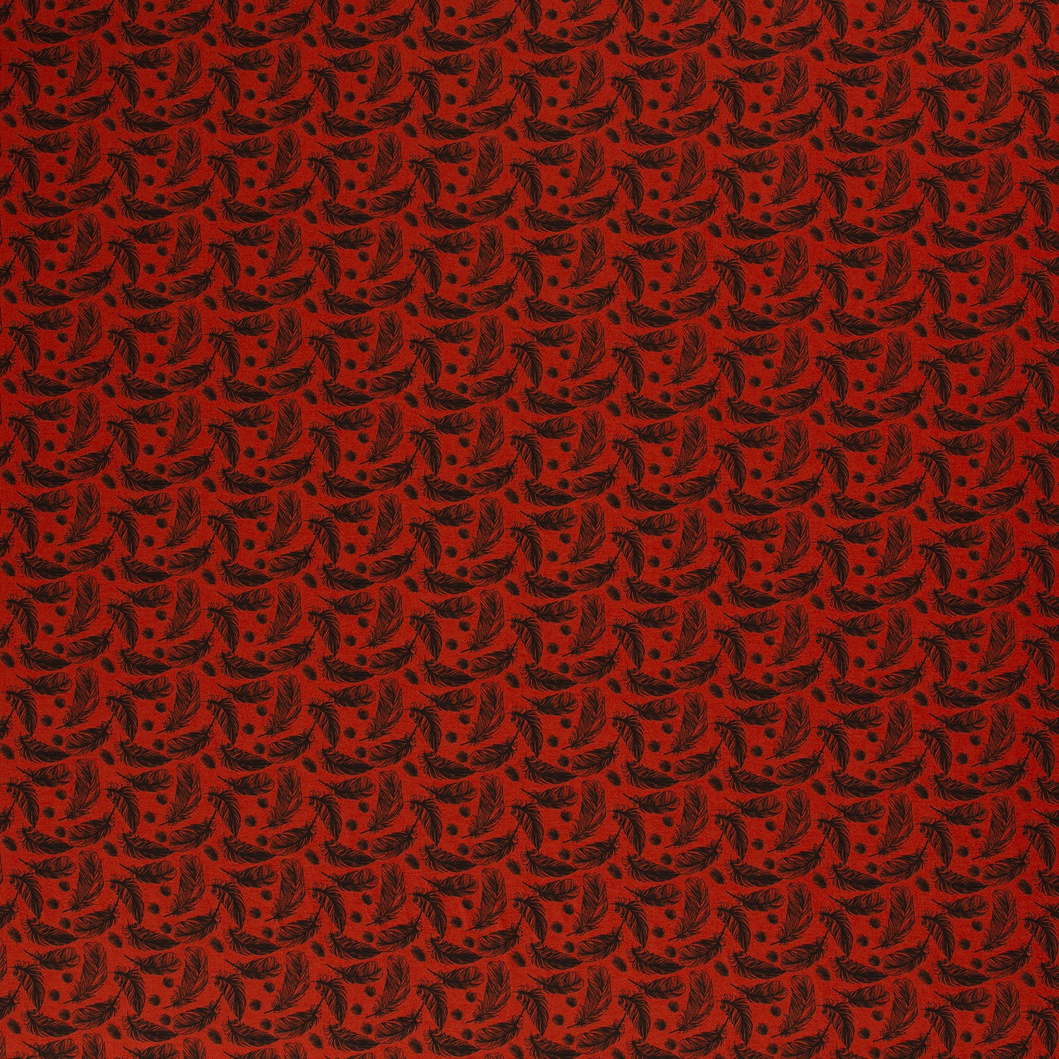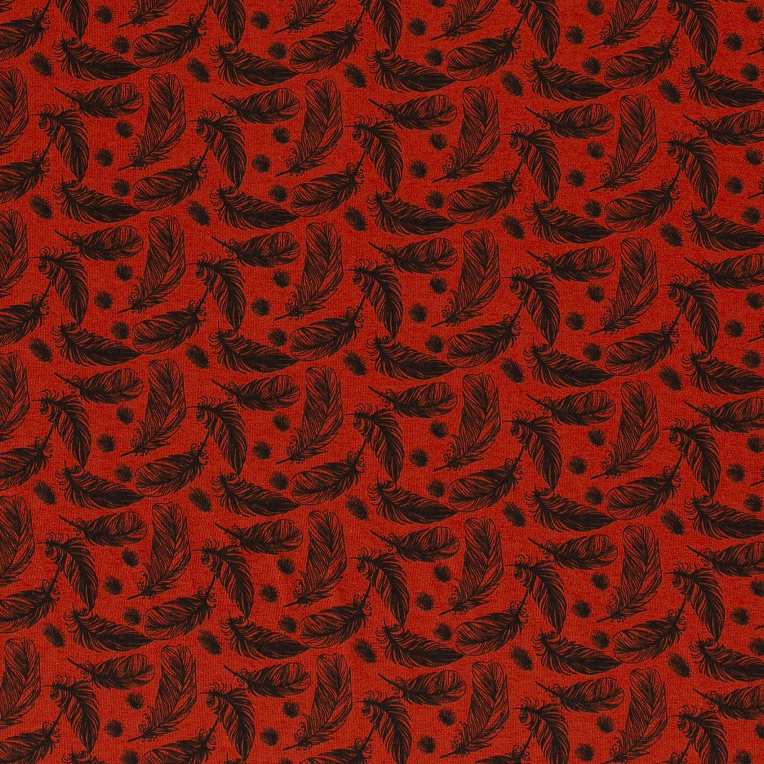 Lysande, varm och lite lekfull – denna jersey ger genast gott humör till varje syprojekt. Den intensiva blodapelsinfärgade bakgrunden ger ett strålande intryck, medan ömtåliga fjädrar i vitt, svart och mjuka beigetoner tycks dansa viktlöst över tyget.