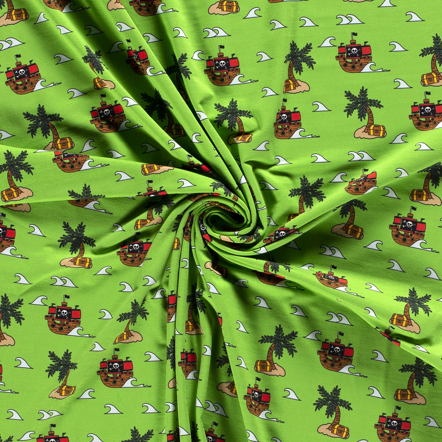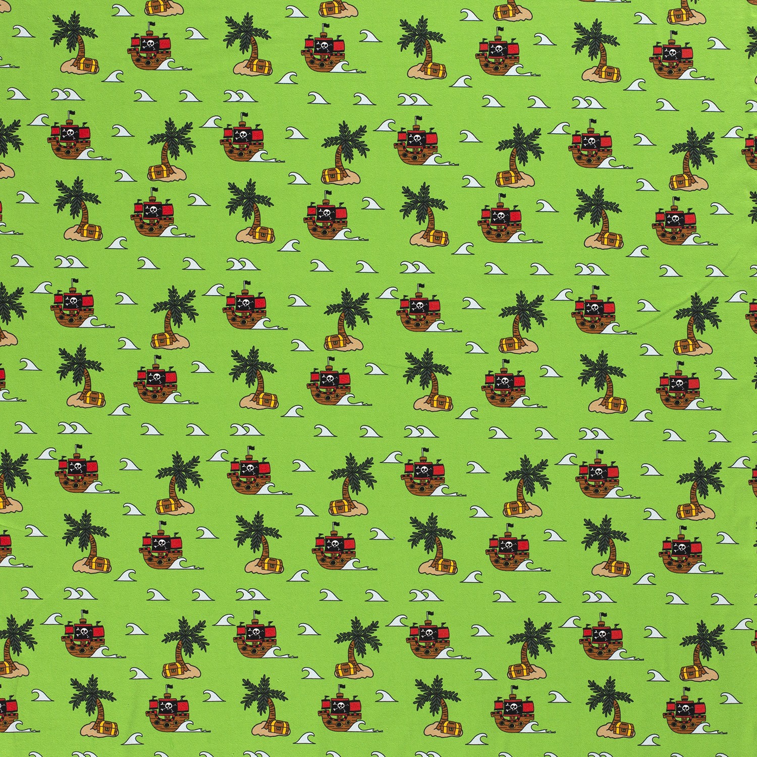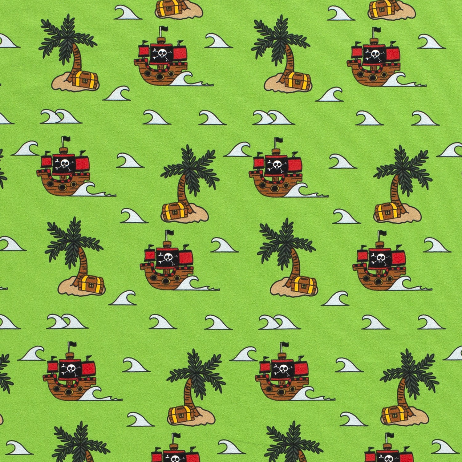 Denna jersey tar piratäventyr direkt till sybordet: På fräscht limegrönt leker små piratöar med dödskalleflaggor, skattkistor, ankare, palmer och skepp. Motiven är kärleksfullt ritade, tydligt konturerade och i harmoniska färger som svart, vitt, rött och diskreta blå nyanser – perfekt för alla små och stora sjörövare.