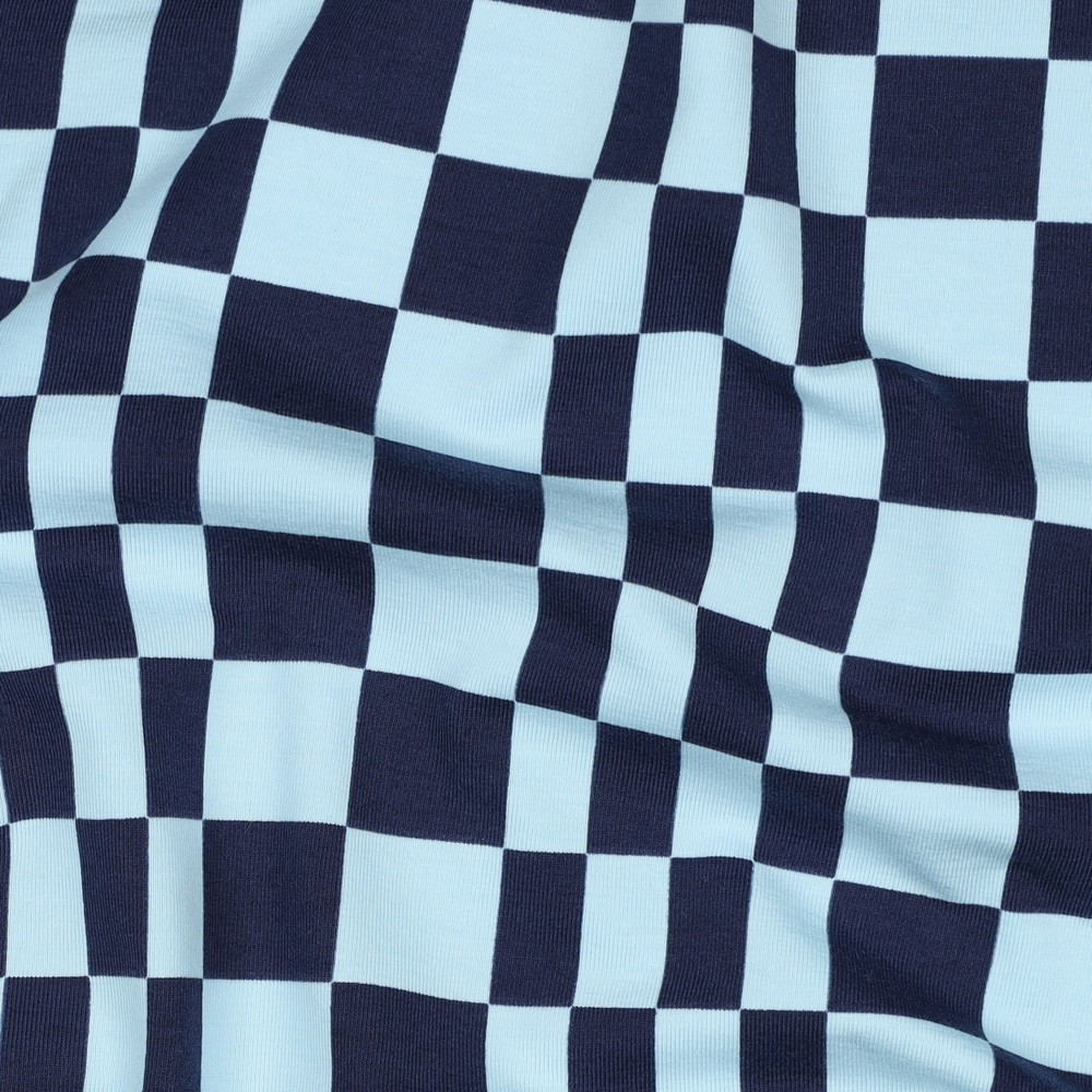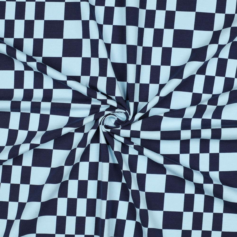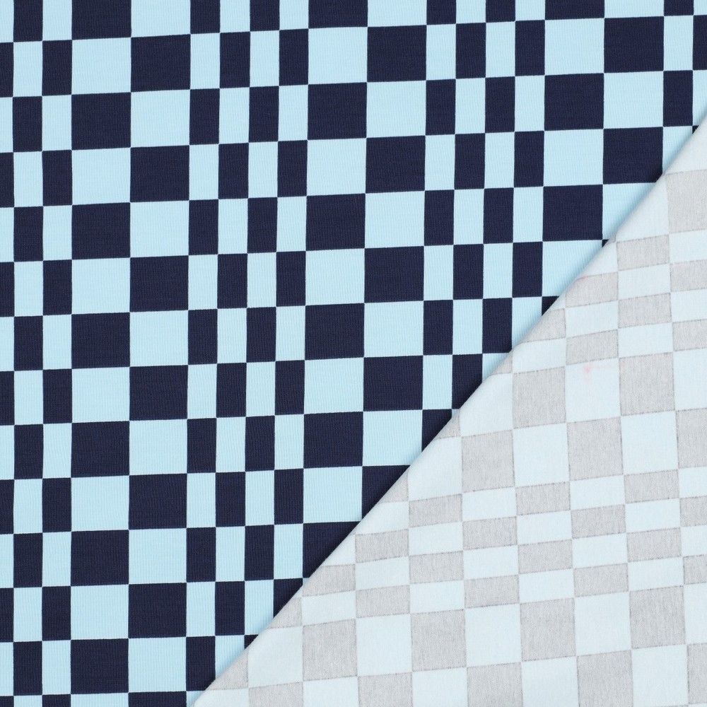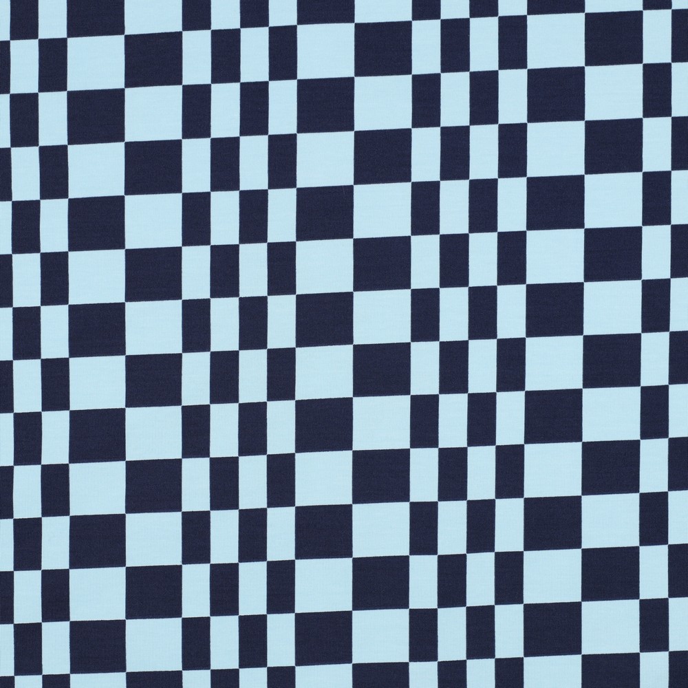 Ett modernt kombityg som utstrålar lugn och coolhet: På denna jersey radas små, jämna fyrkanter upp i fräscht ljusblått och svalt blått. Det diskreta, grafiska mönstret känns klart och ordnat – perfekt för att stilfullt komplettera andra mönstrade tyger eller som en nedtonad detalj på egen hand.
