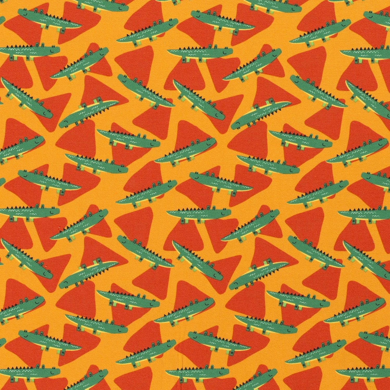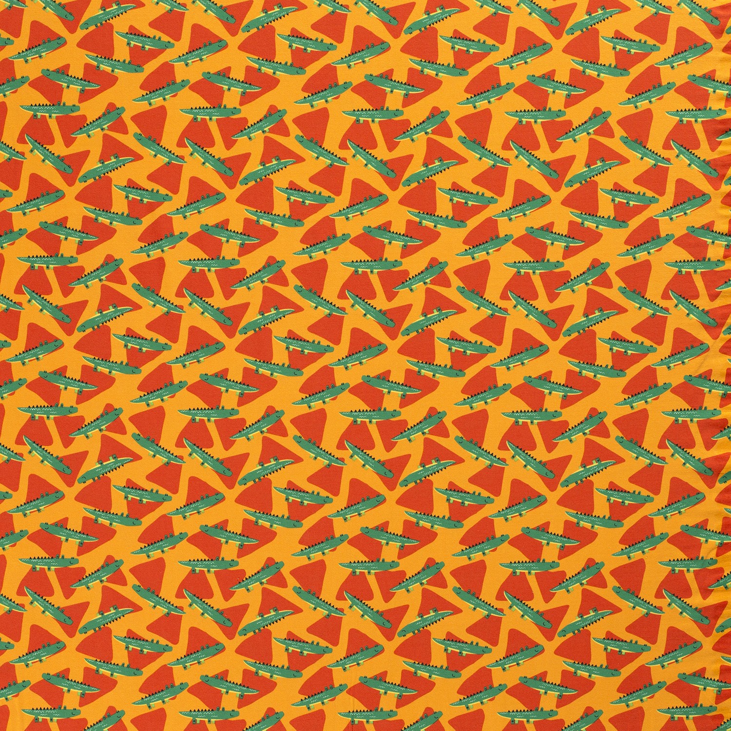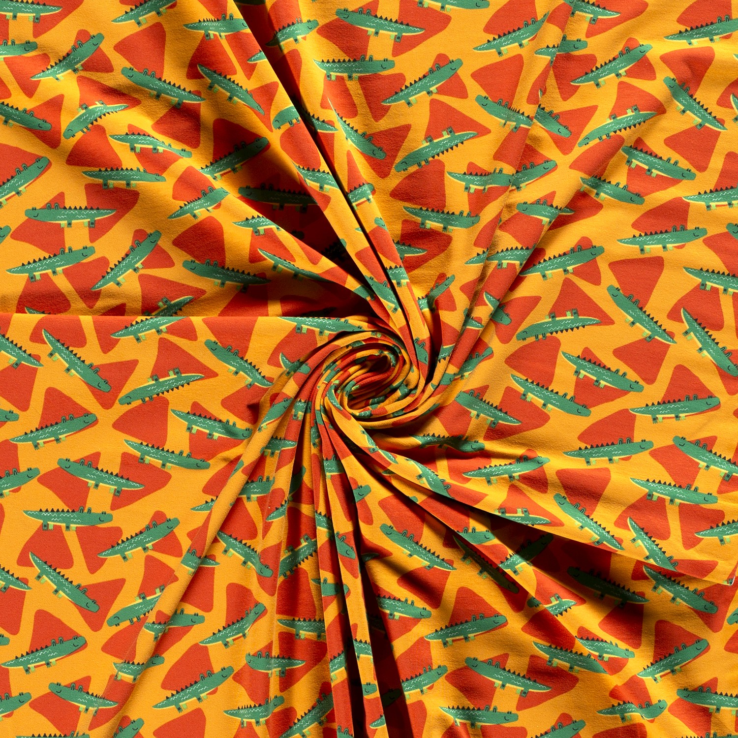 Ett busigt krokodiläventyr på lys orange: Denna jersey sprider genast glädje i varje sömnadsprojekt. På den varma, djupa orange tonen leker glada gröna krokodiler, ibland med öppen mun, ibland avslappnat liggande, tillsammans med små grafiska trianglar i diskreta färger. Den moderna, barnvänliga designen är lekfull utan att vara överlastad – perfekt för små upptäckare.
