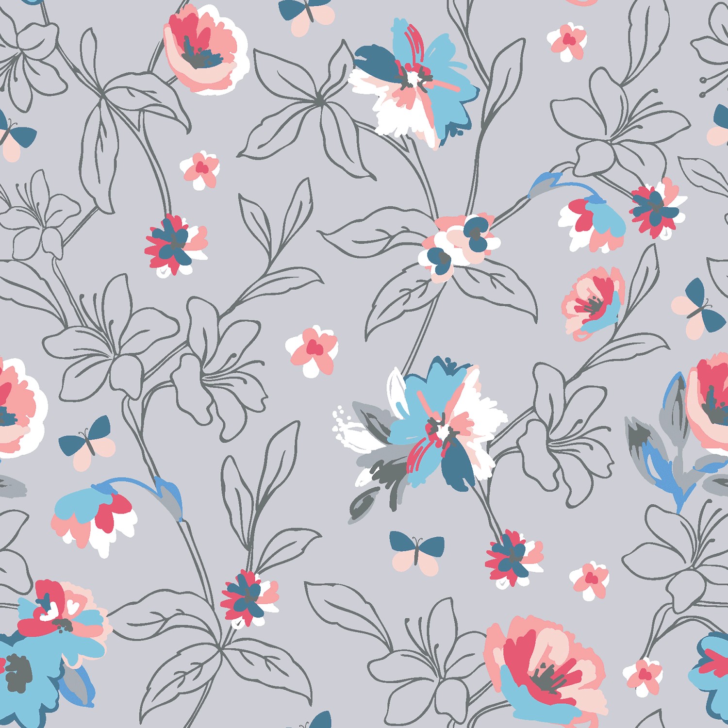 Mjuka liljor och lekfulla fjärilar dansar över en mjuk ljusgrå bakgrund – denna jersey känns som en liten vårträdgård på tyg. De detaljrika blommorna och fina bladen harmonierar vackert med de graciösa fjärilarna och skapar en romantisk och lekfull design som ändå förblir diskret.