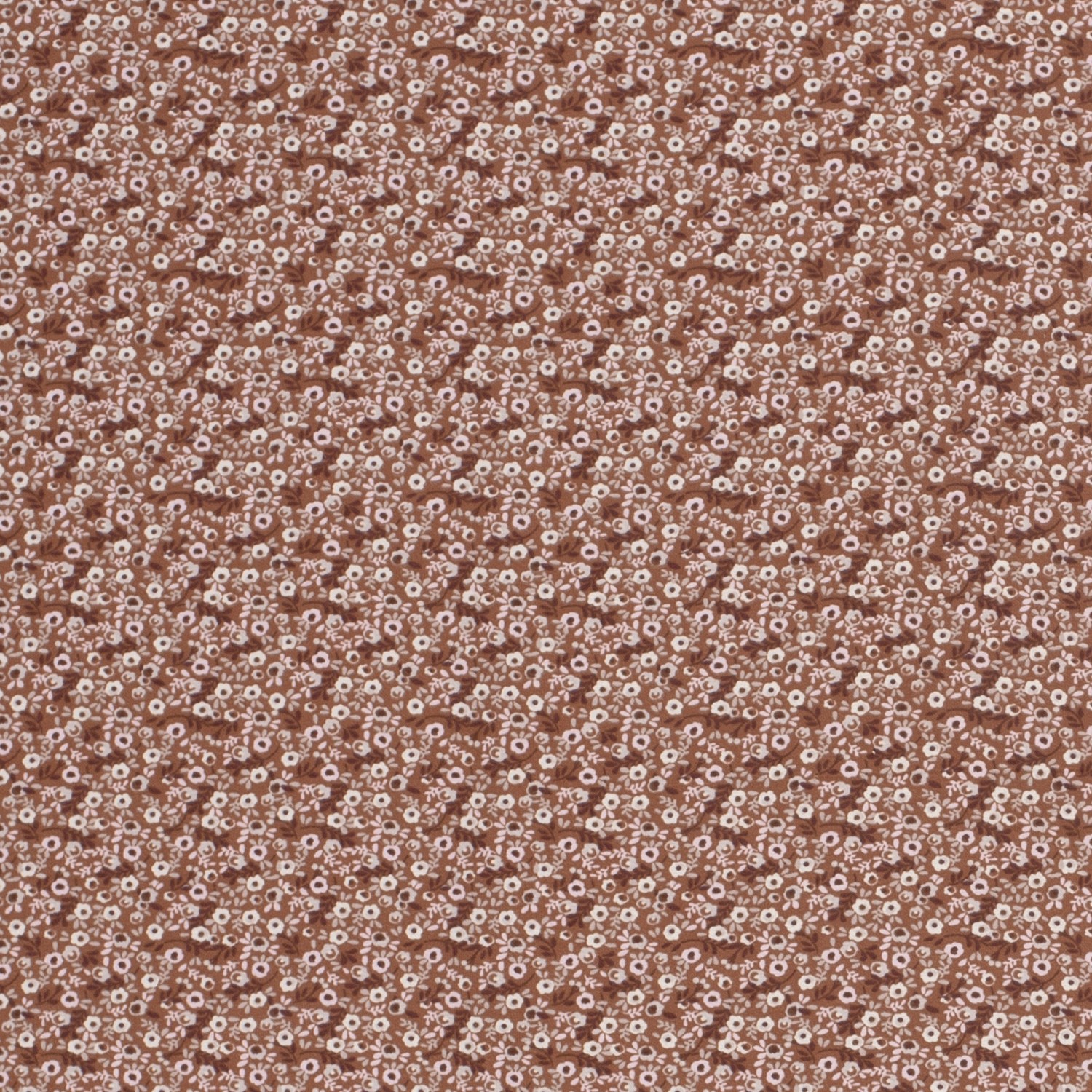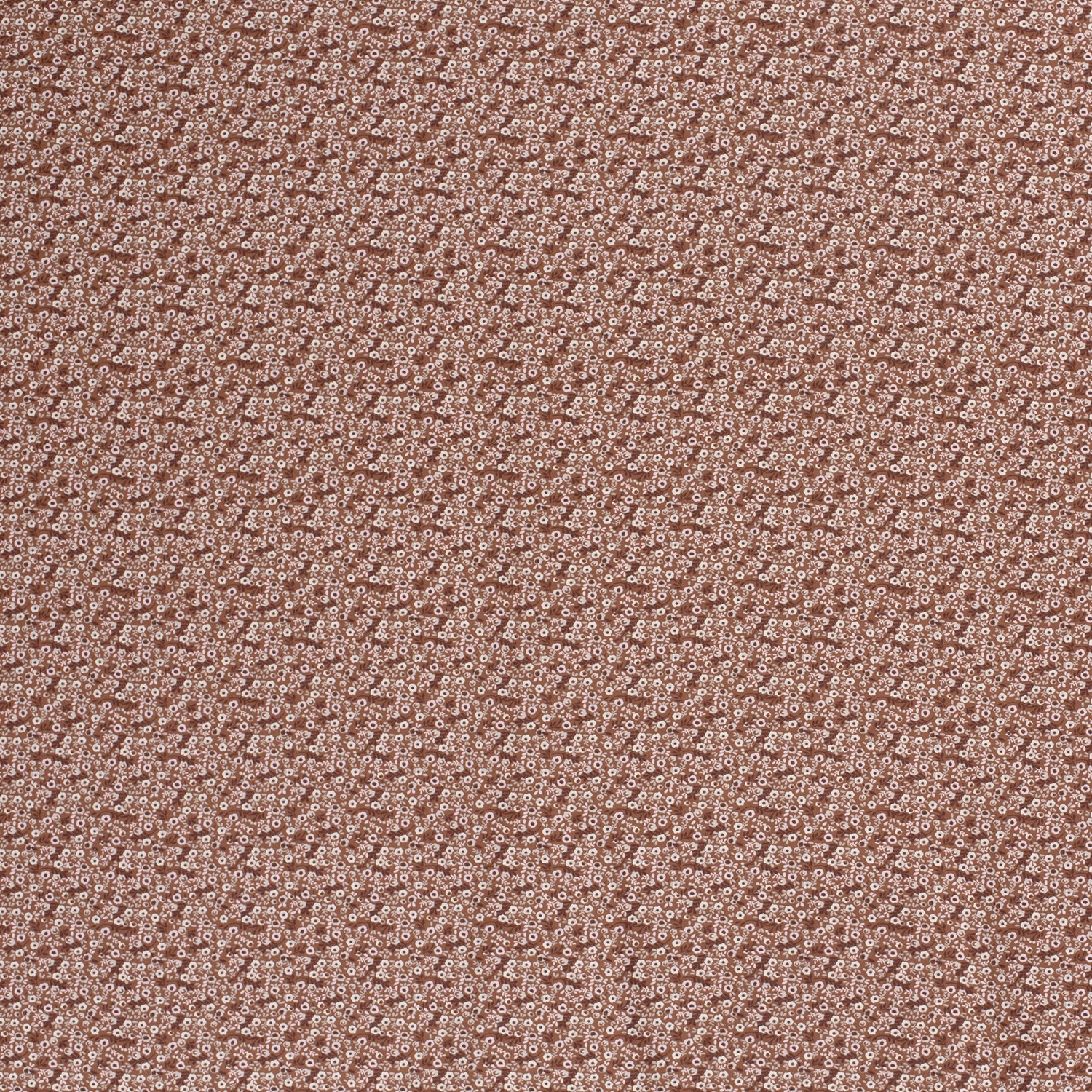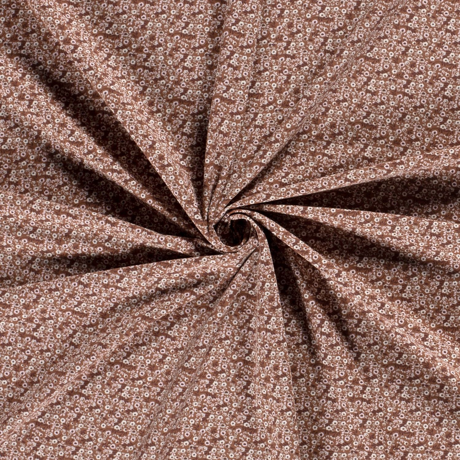 En skir blomsterprakt på varm terrakotta: Denna jersey förför med en kärleksfull design av små blommor i harmoniska naturtoner. Fina, ljusrosa och cremefärgade blommor, små knoppar och ömtåliga blad sprider sig jämnt över tyget och liknar en blomstrande äng i kvällssolen.