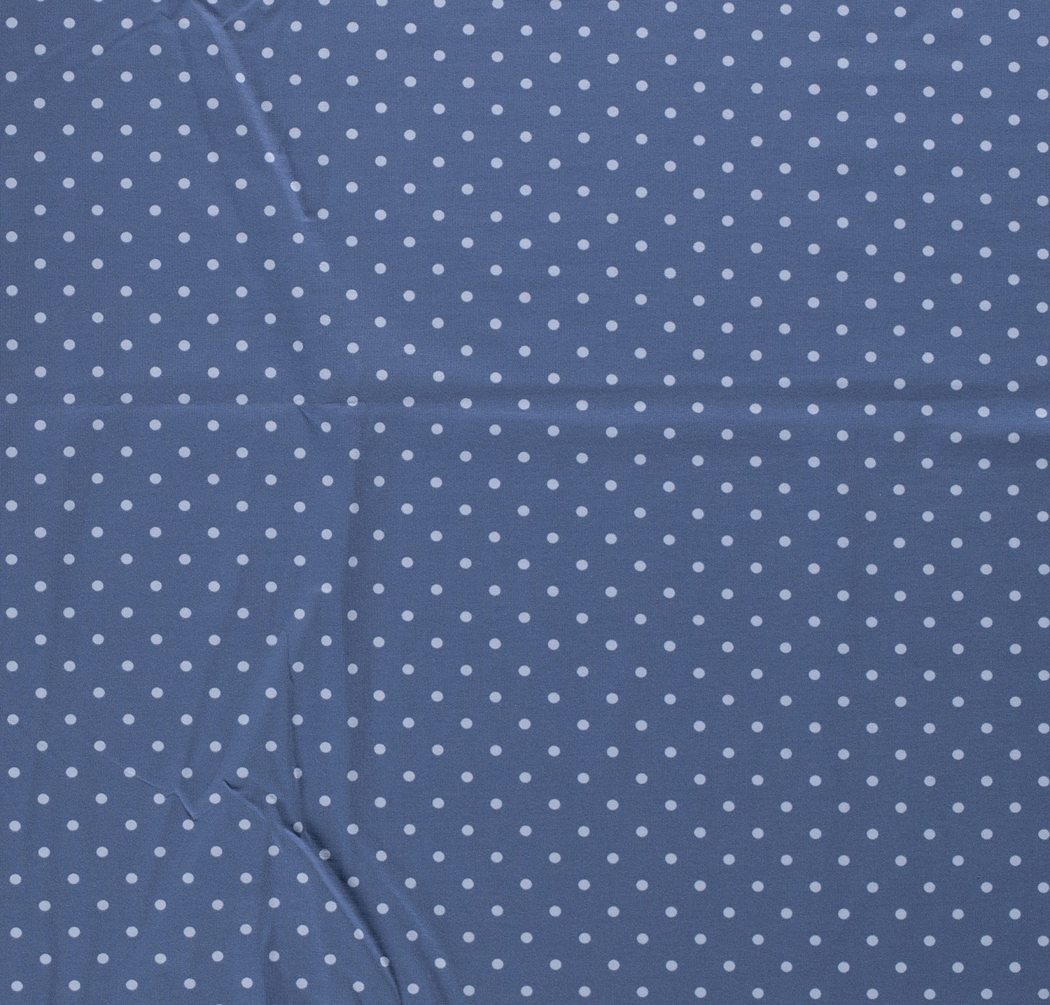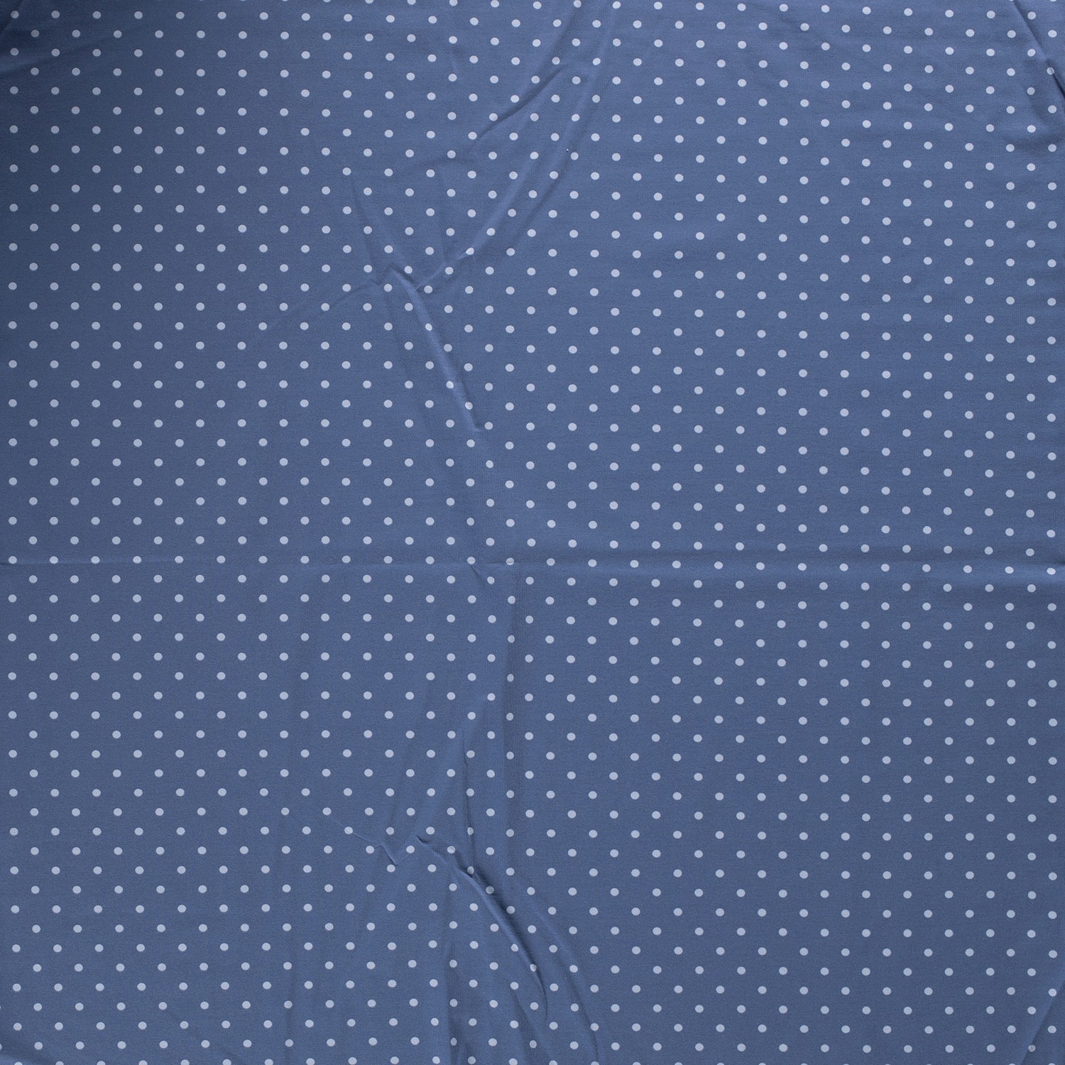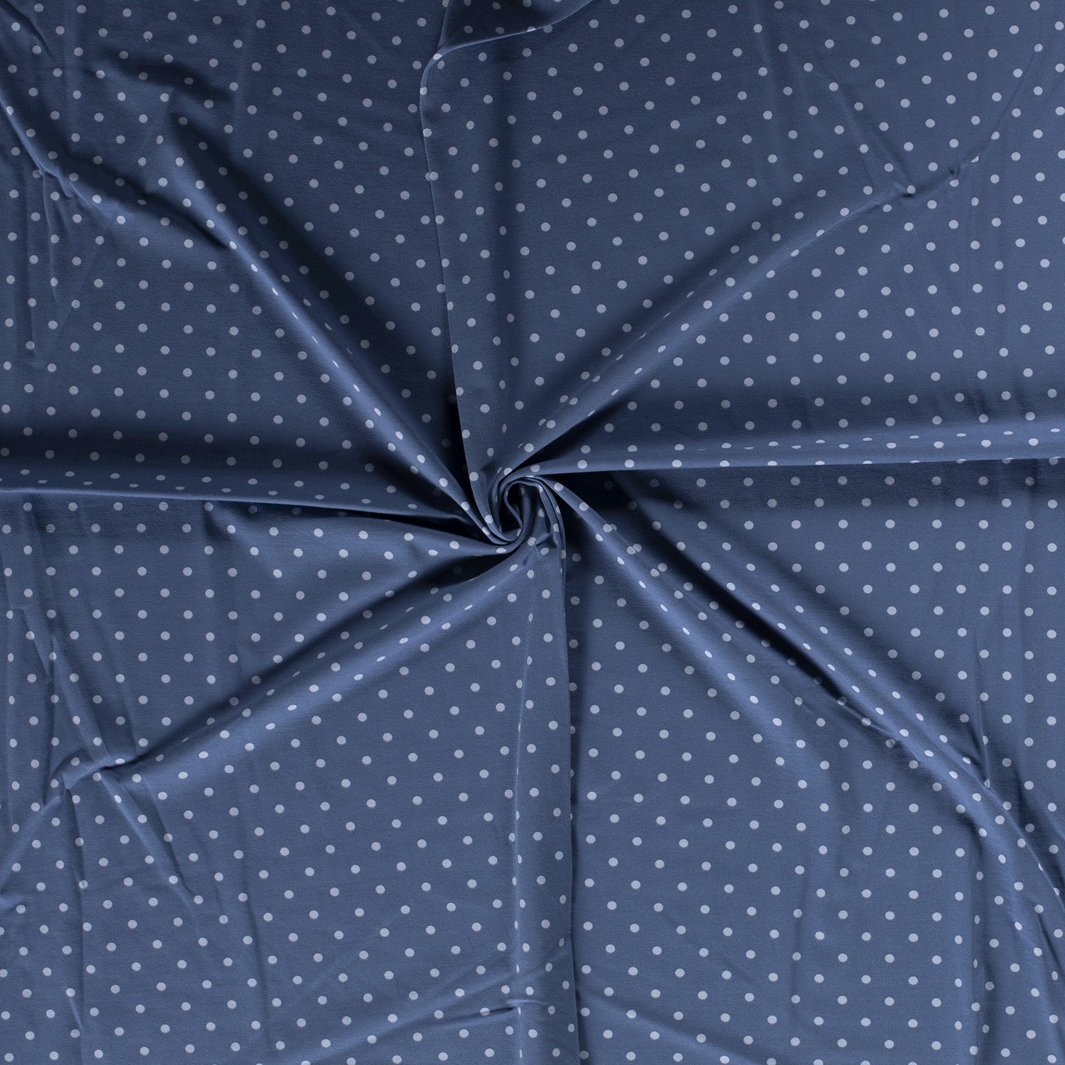 Ett mjukt prickhav på mjuk rökblå: Denna jersey förtrollar med små, jämnt fördelade prickar som ger tyget ett fräscht och lekfullt utseende. Den lugna, rökblå färgen är både modern och tidlös och passar utmärkt att kombinera – både med enfärgade tyger och andra favoritmönster.
