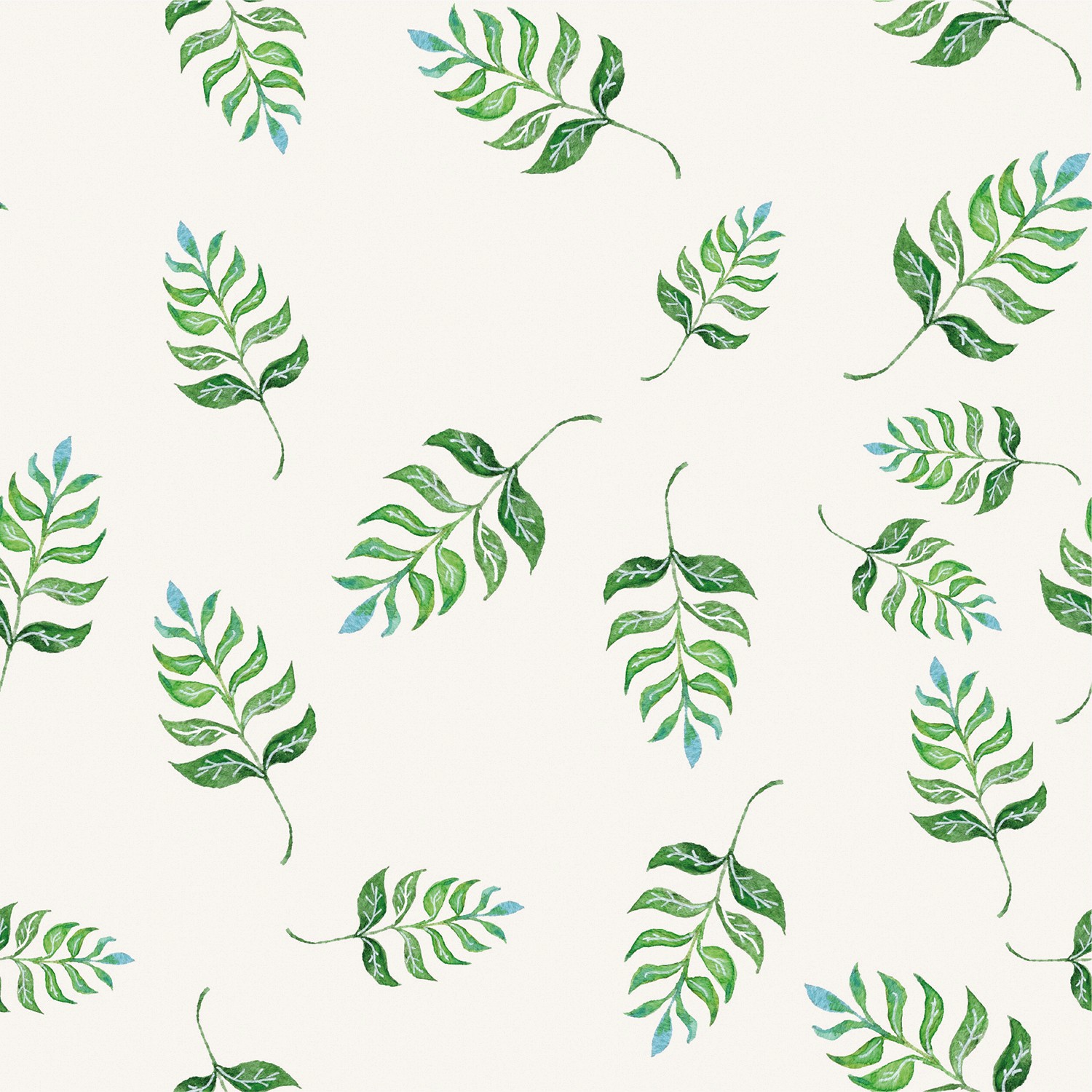 Mjukt som en promenad i morgondagg: På en ljus, krämvit bakgrund slingrar sig fina ormbunksgrenar och gräs i mjuka naturtoner. Fina blad i dämpat grönt, varmt brunt och diskreta beige nyanser ger tyget ett lugnt, naturligt uttryck – perfekt för alla som älskar det botaniska utseendet.