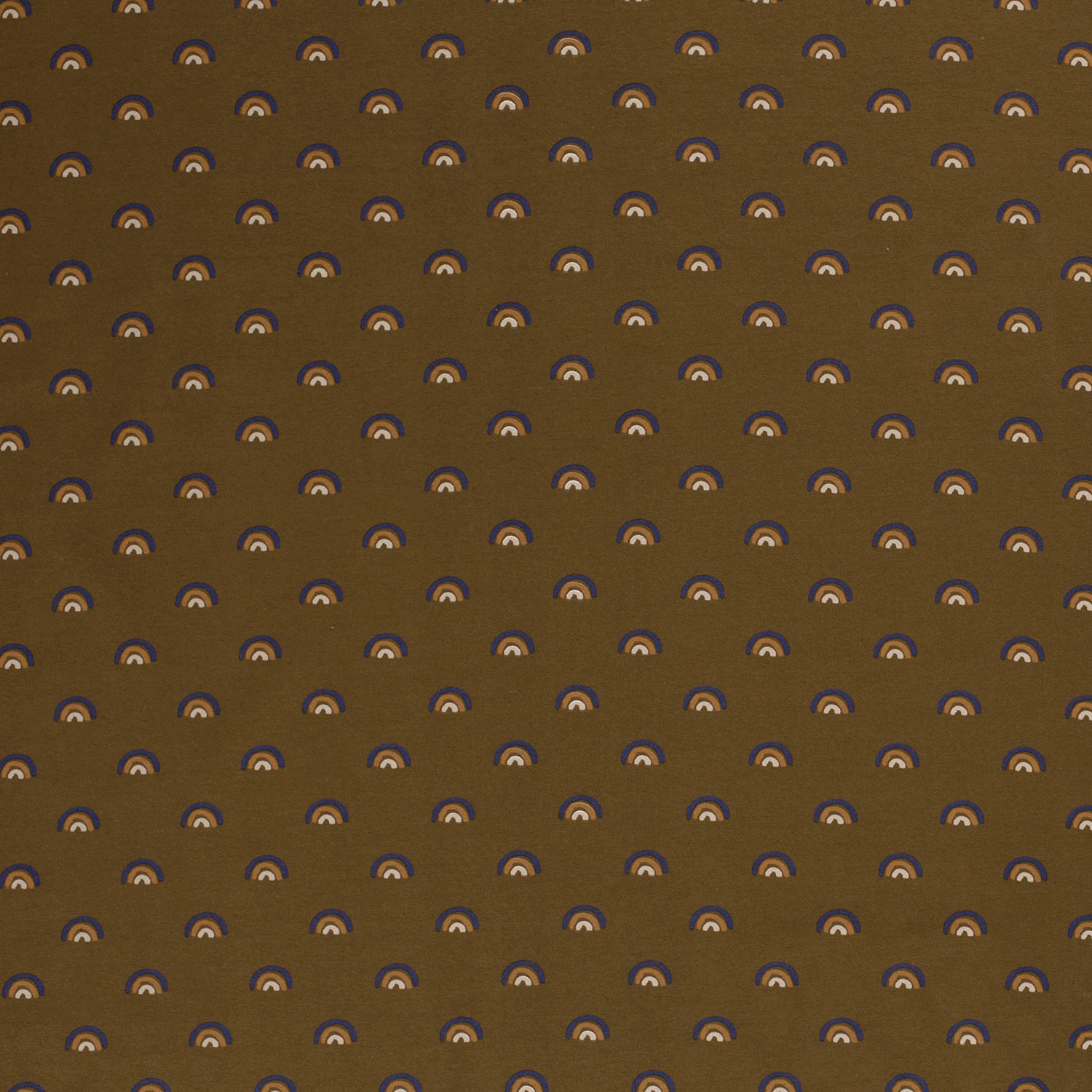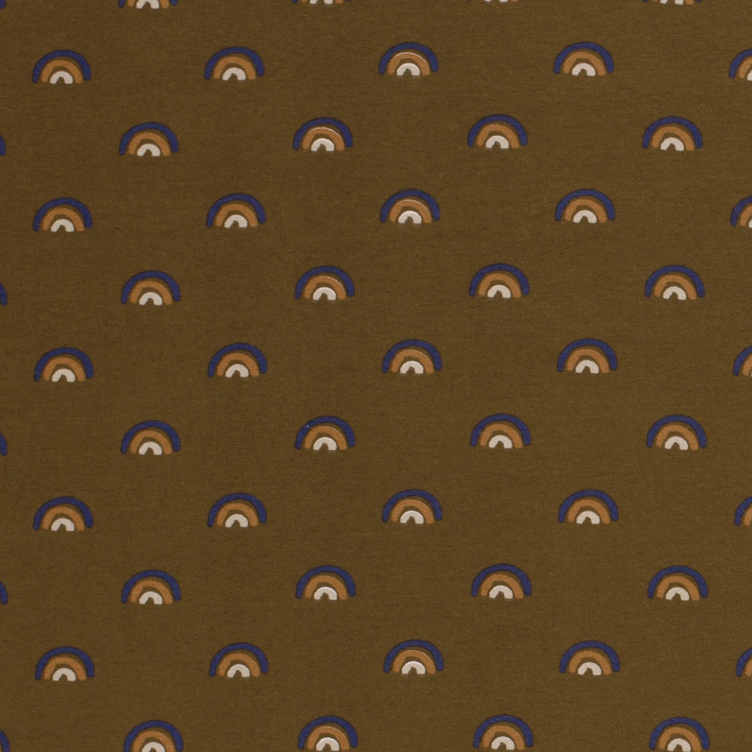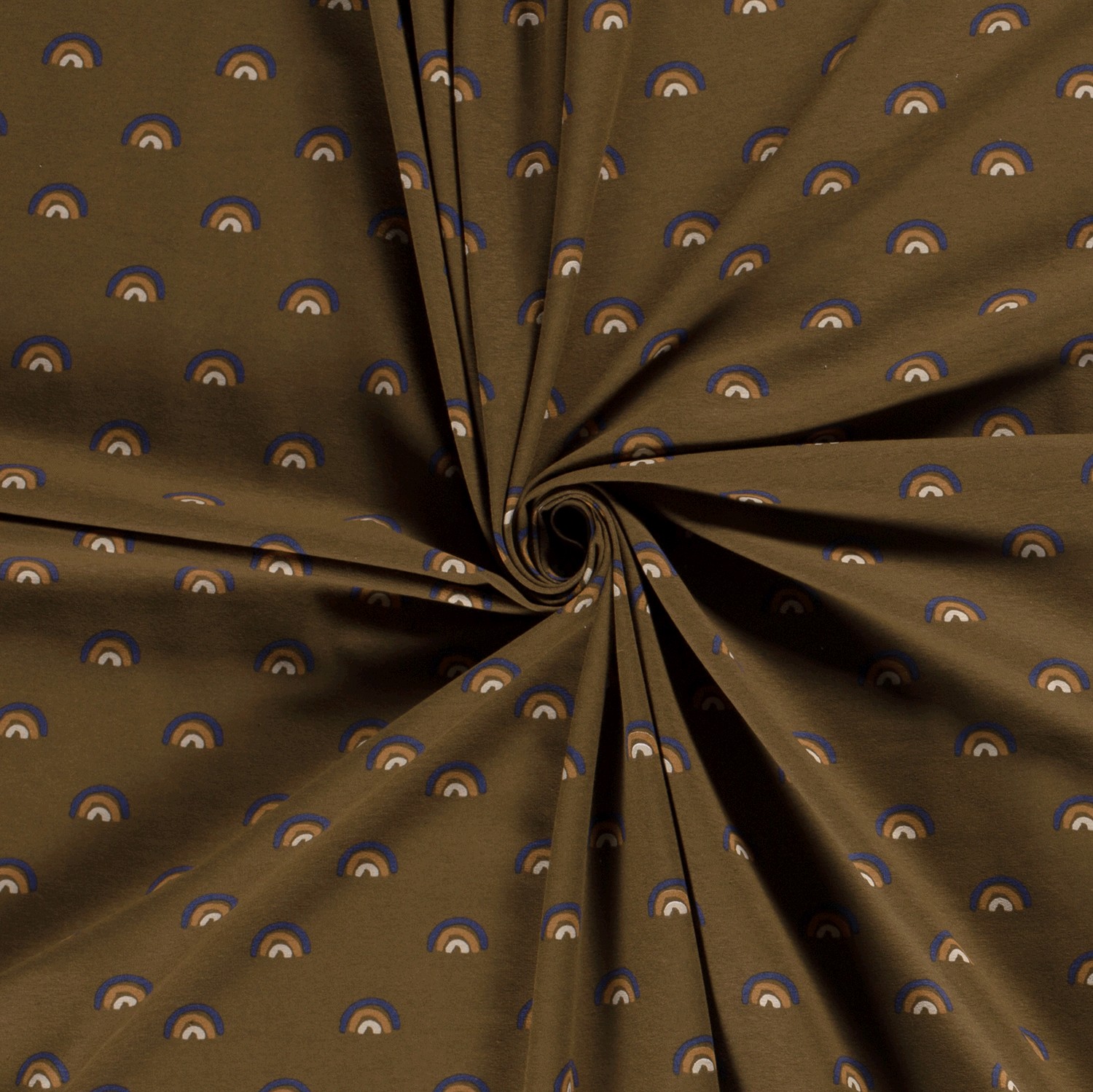 Mjuka regnbågar på varm mellanmörk brun – denna jersey förtrollar med sin kärleksfulla, moderna design. De små, jämnt placerade regnbågarna i mjuka naturtoner som beige, creme, rost och en aning gammalrosa ger ett harmoniskt och lugnt intryck utan att vara för färgglada.