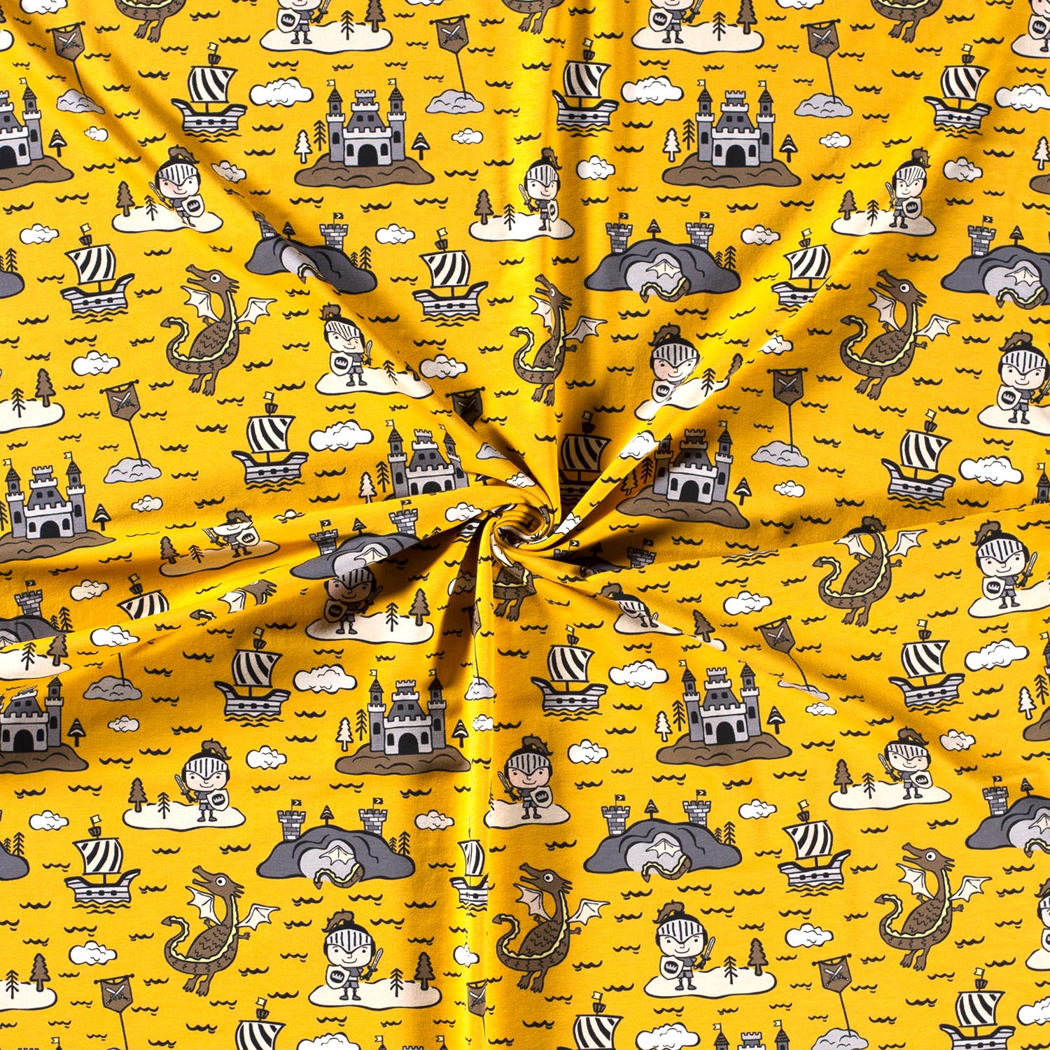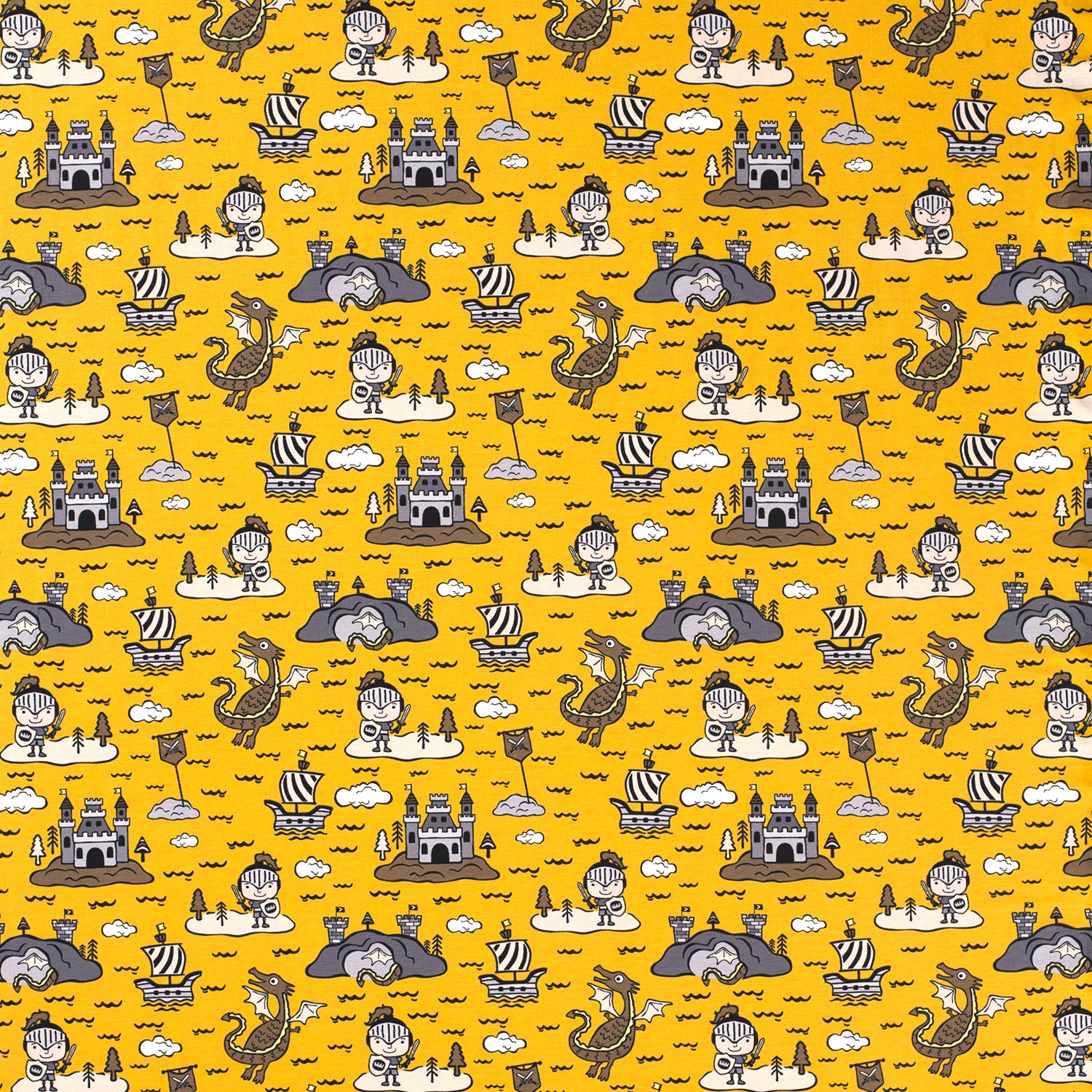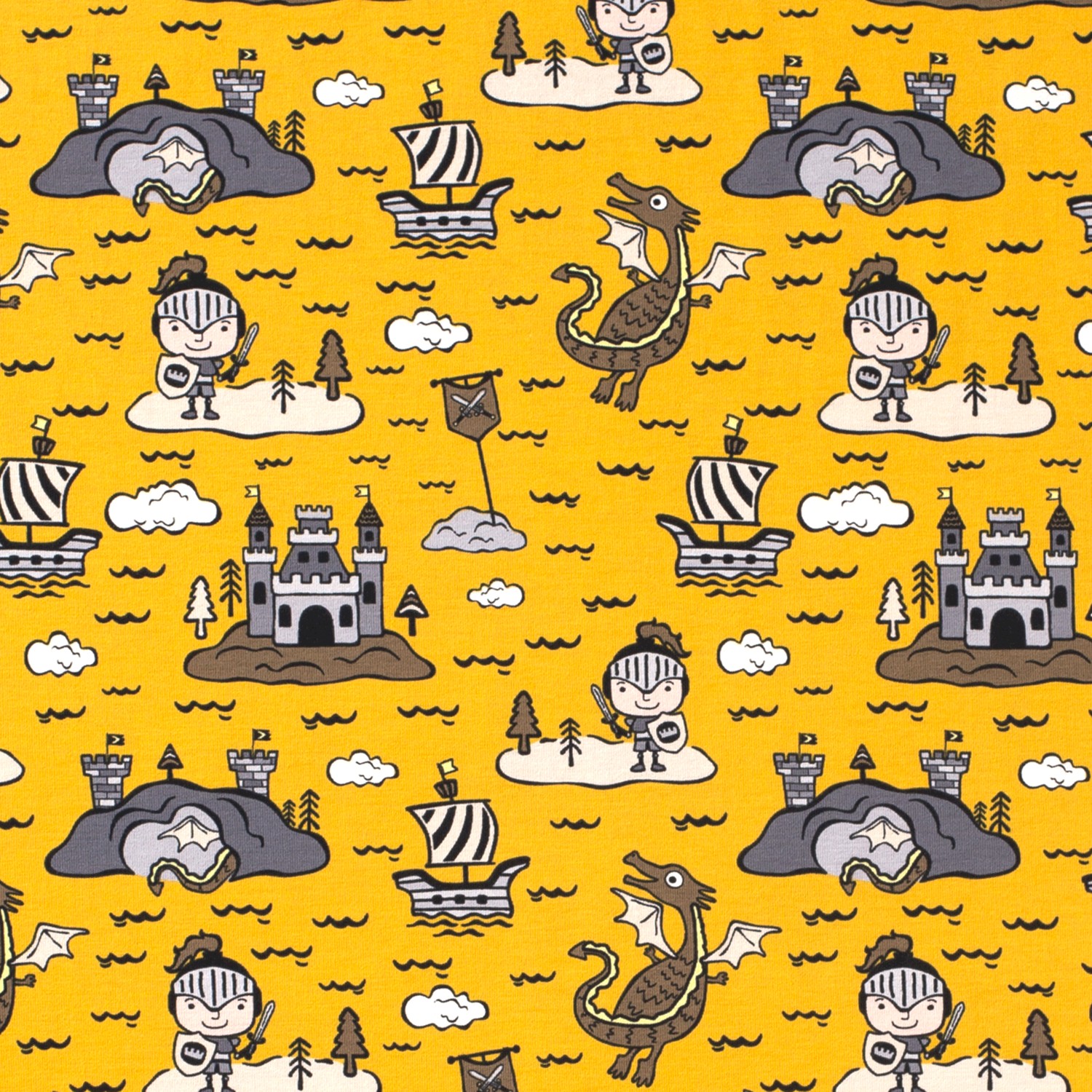 Ett fantasifullt undervattensäventyr på tyg: Mot en lysande gul bakgrund leker modiga riddare, eldsprutande drakar, stolta slott och små båtar mellan vågor, sjöstjärnor och fiskar. De kärleksfullt ritade figurerna i blå, turkosa och röda toner är glada, lekfulla och ändå tydligt konturerade – perfekt för små upptäckare som älskar riddarberättelser och havsvärldar.