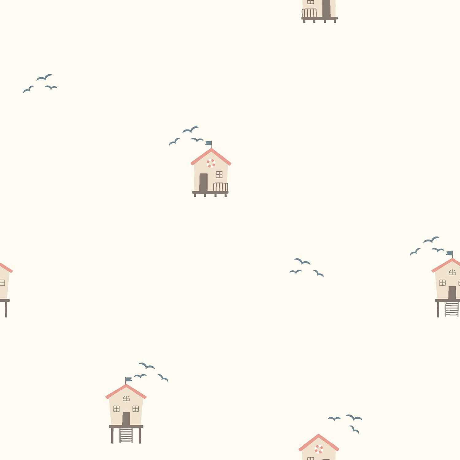 Med denna jersey får du maritim semesterkänsla direkt till symaskinen. På en mjuk offwhite bakgrund står kärleksfullt illustrerade strandhus på rad – varje hus med små detaljer som fönster, dörrar och tak i harmoniska blå och mjuka röda toner. Däremellan ger fina accenter i sand- och grå nyanser den typiska kustlooken.
