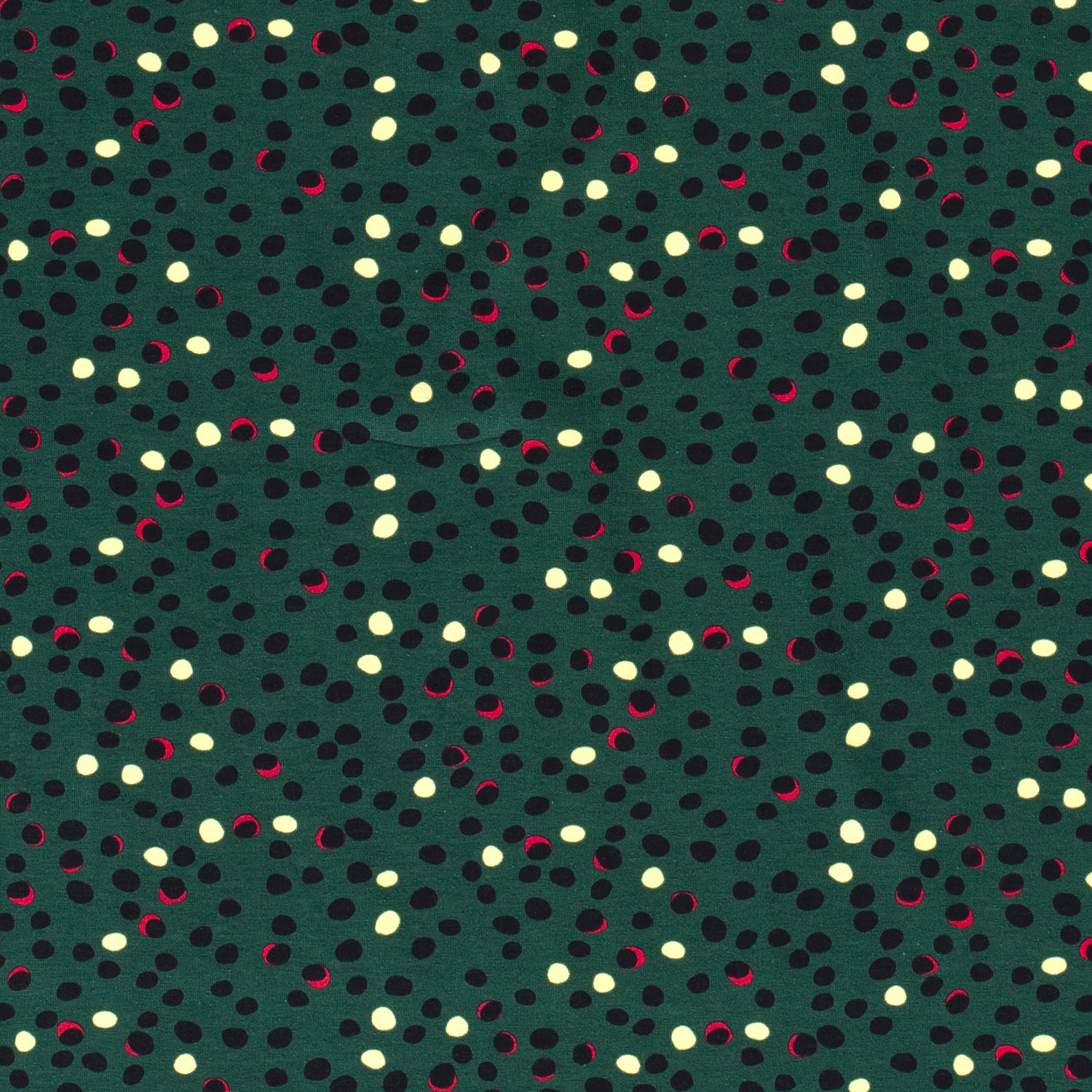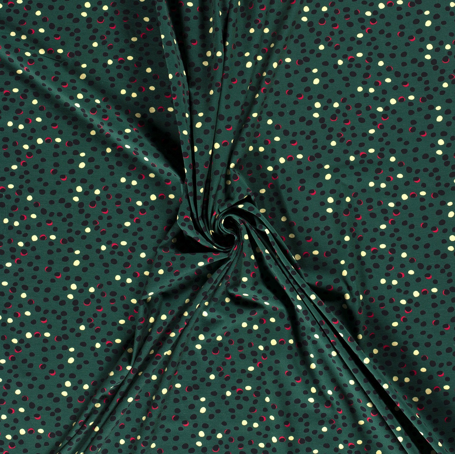 Tack vare sitt släta grepp och lättskötta kvalitet passar tyget även utmärkt för baby- och barnkläder samt projekt som sängkläder eller gosiga kuddar. Det tidlösa prickmönstret på mörkgrönt är mångsidigt och kan kombineras på många sätt – avslappnat, lekfullt eller enkelt elegant.