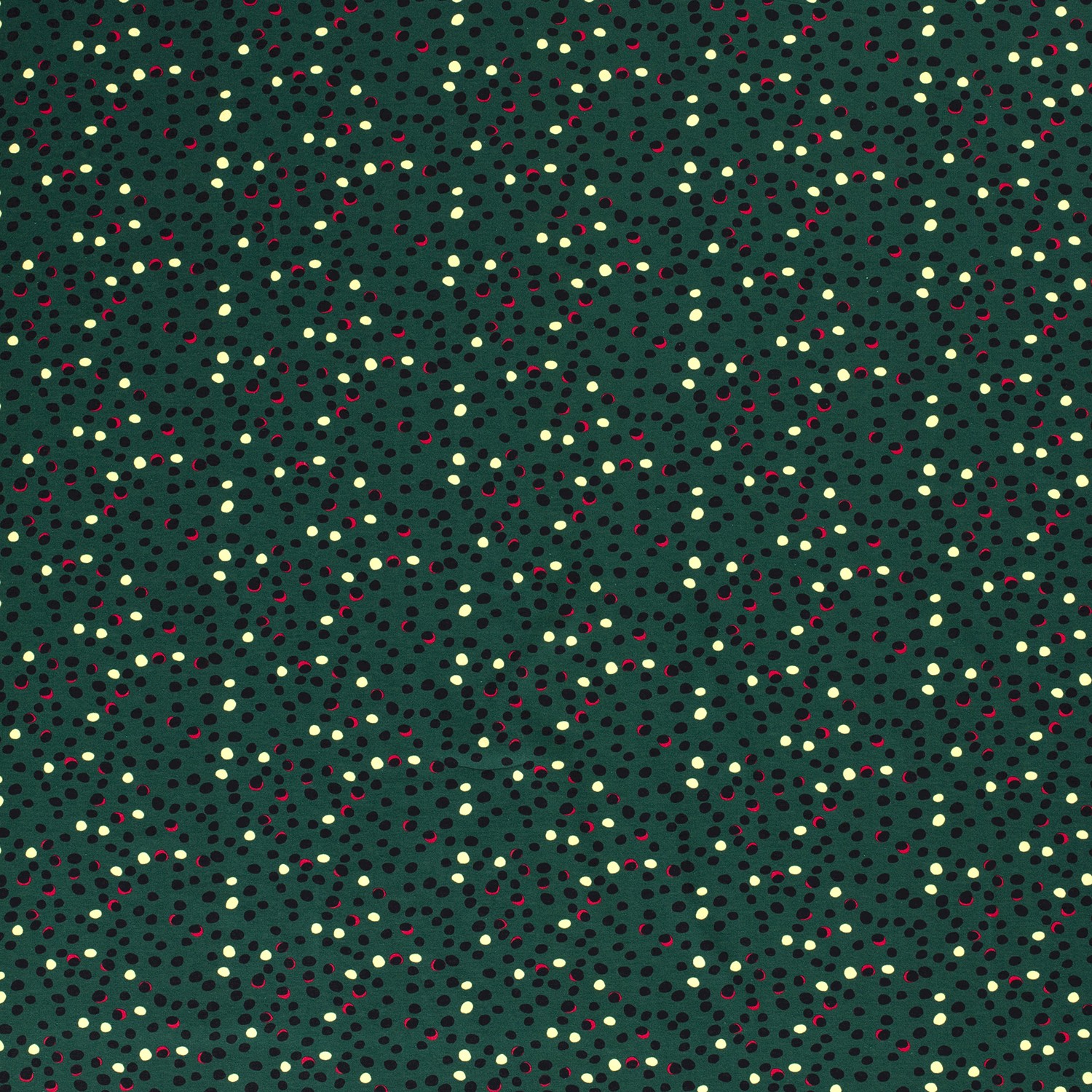 En modern klassiker med en lekfull twist: På djup mörkgrön dansar små, jämnt fördelade prickar i tre färger över tyget – mjuka naturtoner, fräscht ljusgrönt och ett diskret offwhite ger glada accenter utan att bli för färgglatt. Det fina prickmönstret är jämnt fördelat och ger ett lugnt och harmoniskt intryck, perfekt för dig som söker en diskret design med kärleksfulla detaljer.