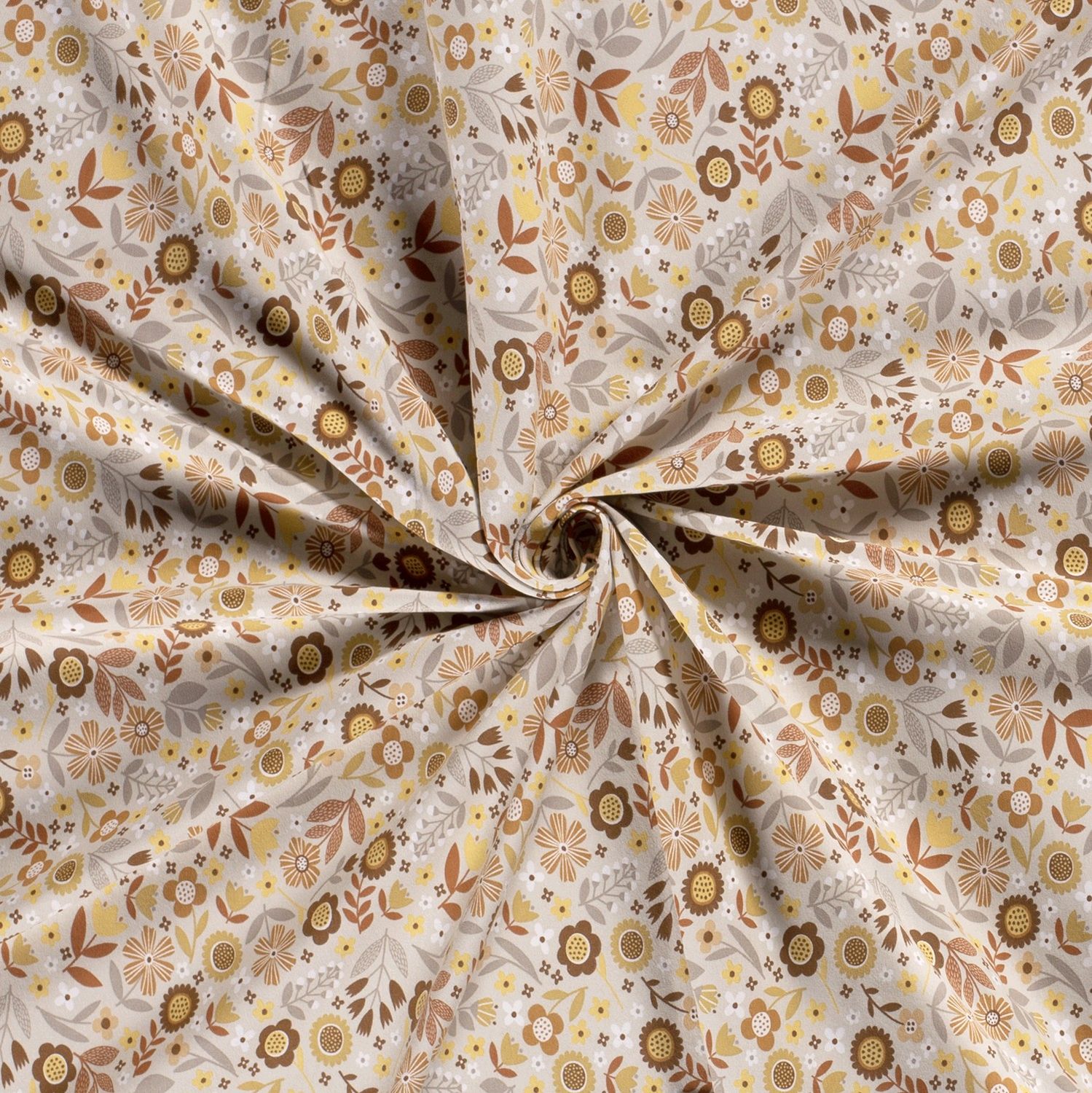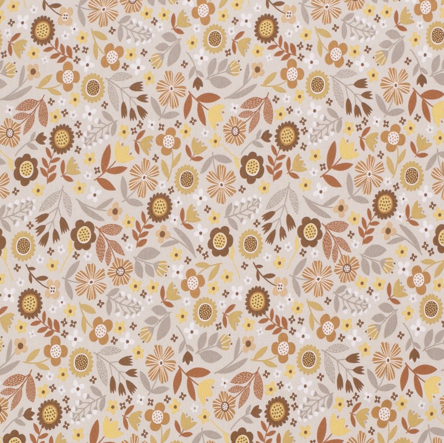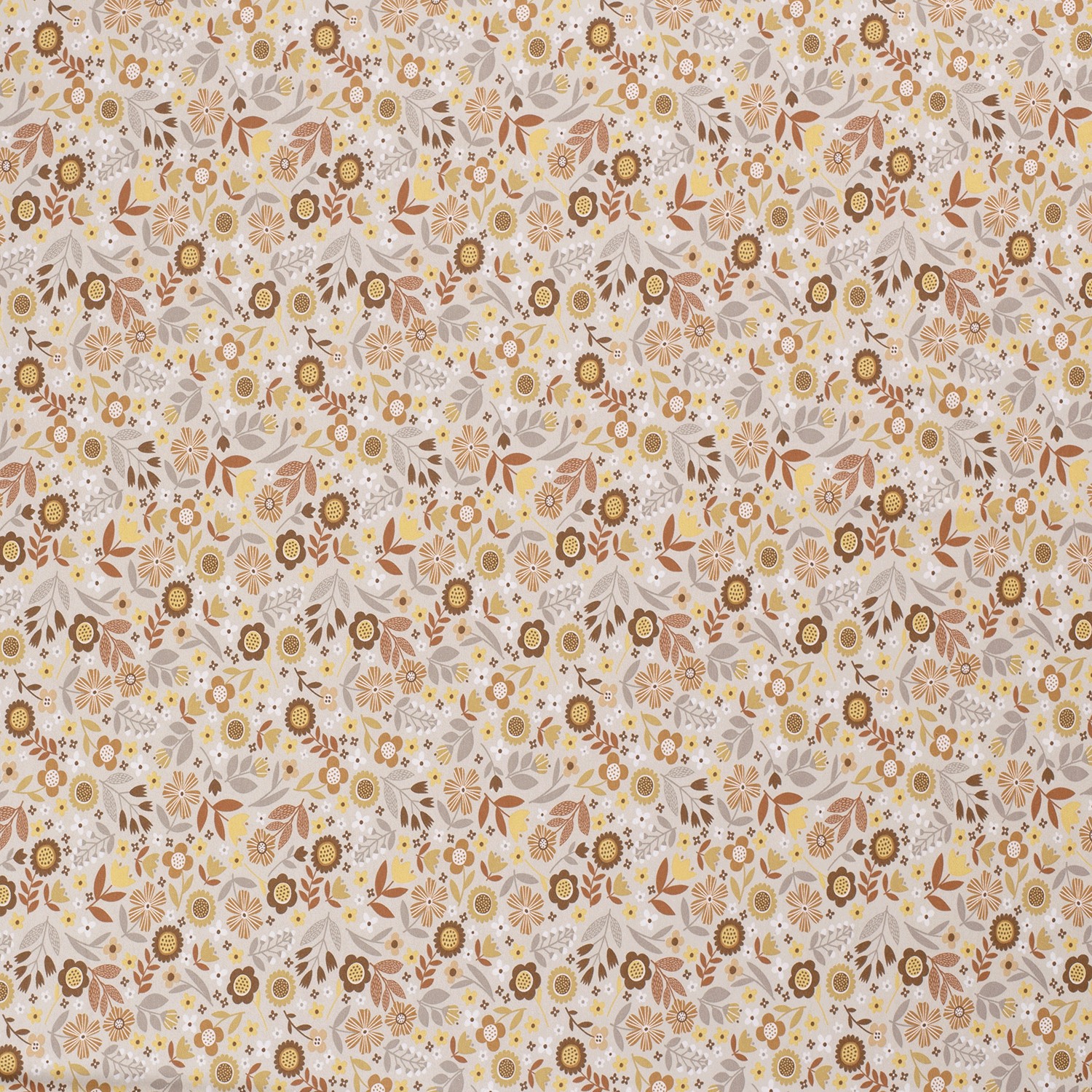 En skonsam promenad över en sommaräng: På den varma beige bakgrunden blommar ett glatt blomsterprakt i harmoniska naturtoner. Fina blommor i rosa, gammalrosa och korall möter små, detaljrika blad i fräscht grönt och mjuka bruna nyanser. Däremellan sätter små, mörkare accenter det florala mönstret levande utan att det känns överlastat.
