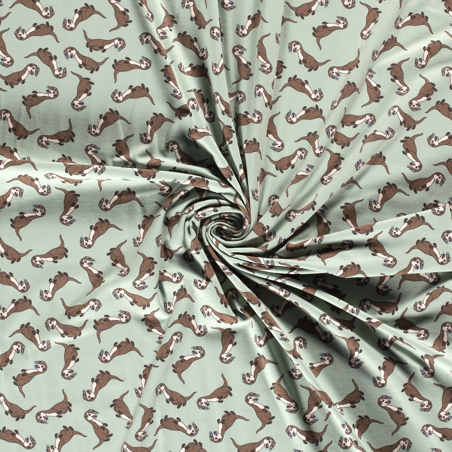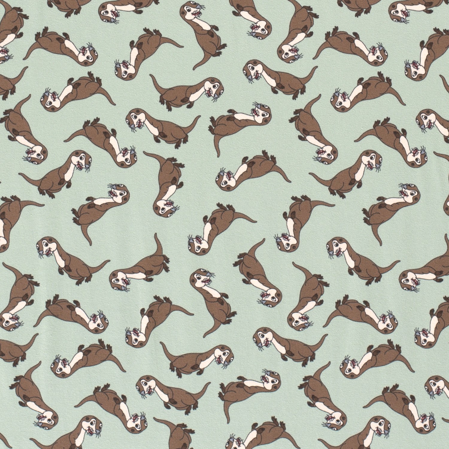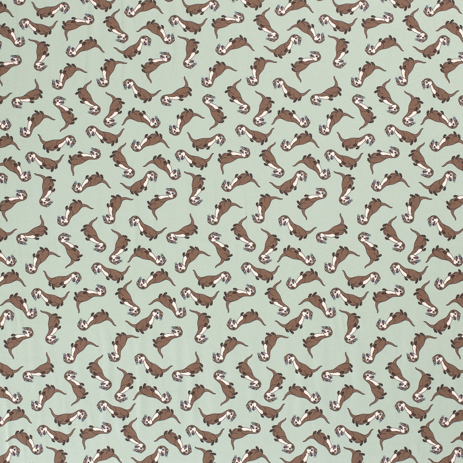 Gulliga uttrar simmar avslappnat i vattnet och skapar en äkta mysstämning på denna jersey. Mot en mjuk mintfärgad bakgrund leker de små vatteninvånarna – ibland flytande på rygg, ibland lekfullt paddlande, omgivna av diskreta vågor och vattenväxter. Den mjuka färgpaletten i mint, varma bruna och beige toner med fina accenter ger en lugnande och samtidigt glad känsla – perfekt för alla små och stora vattenälskare.