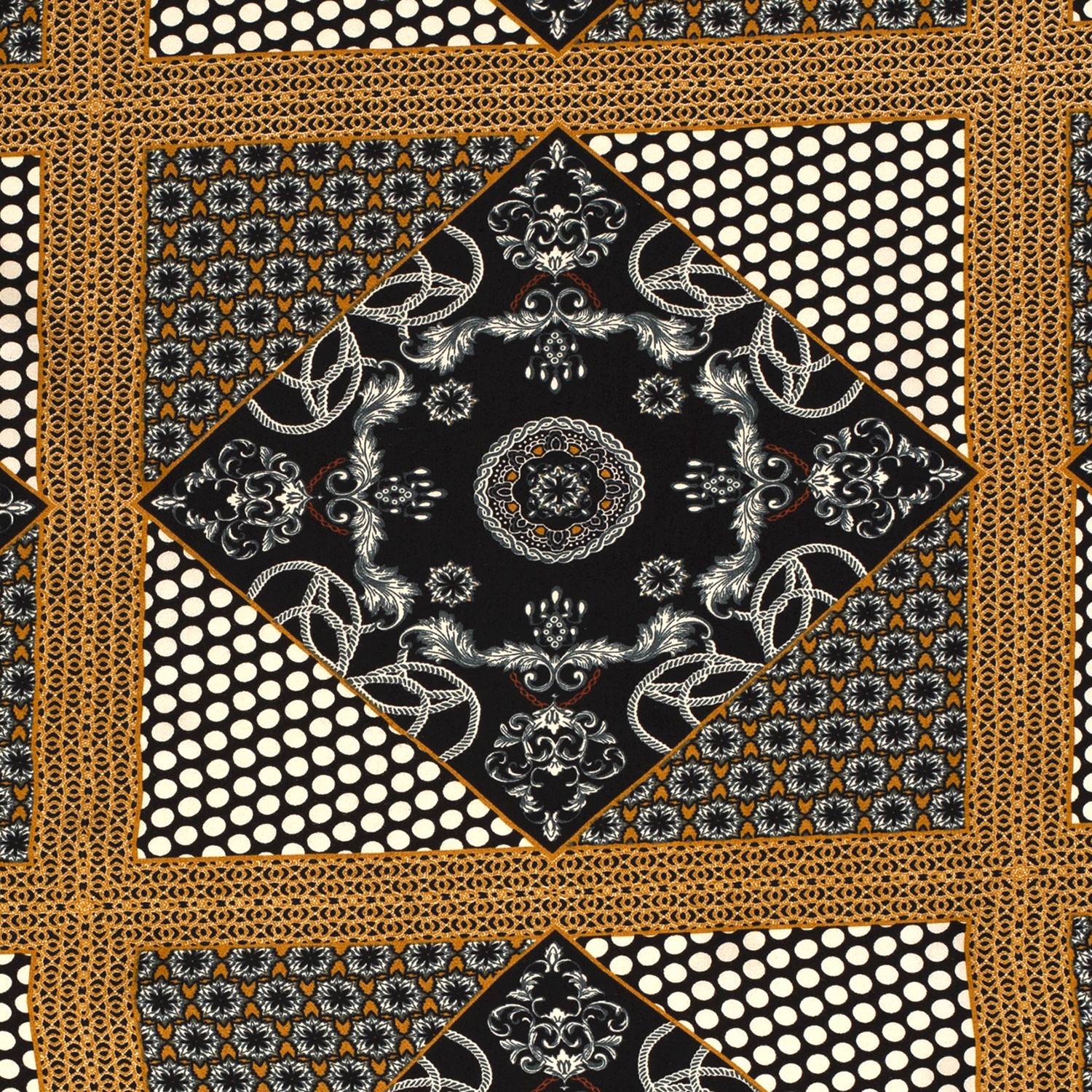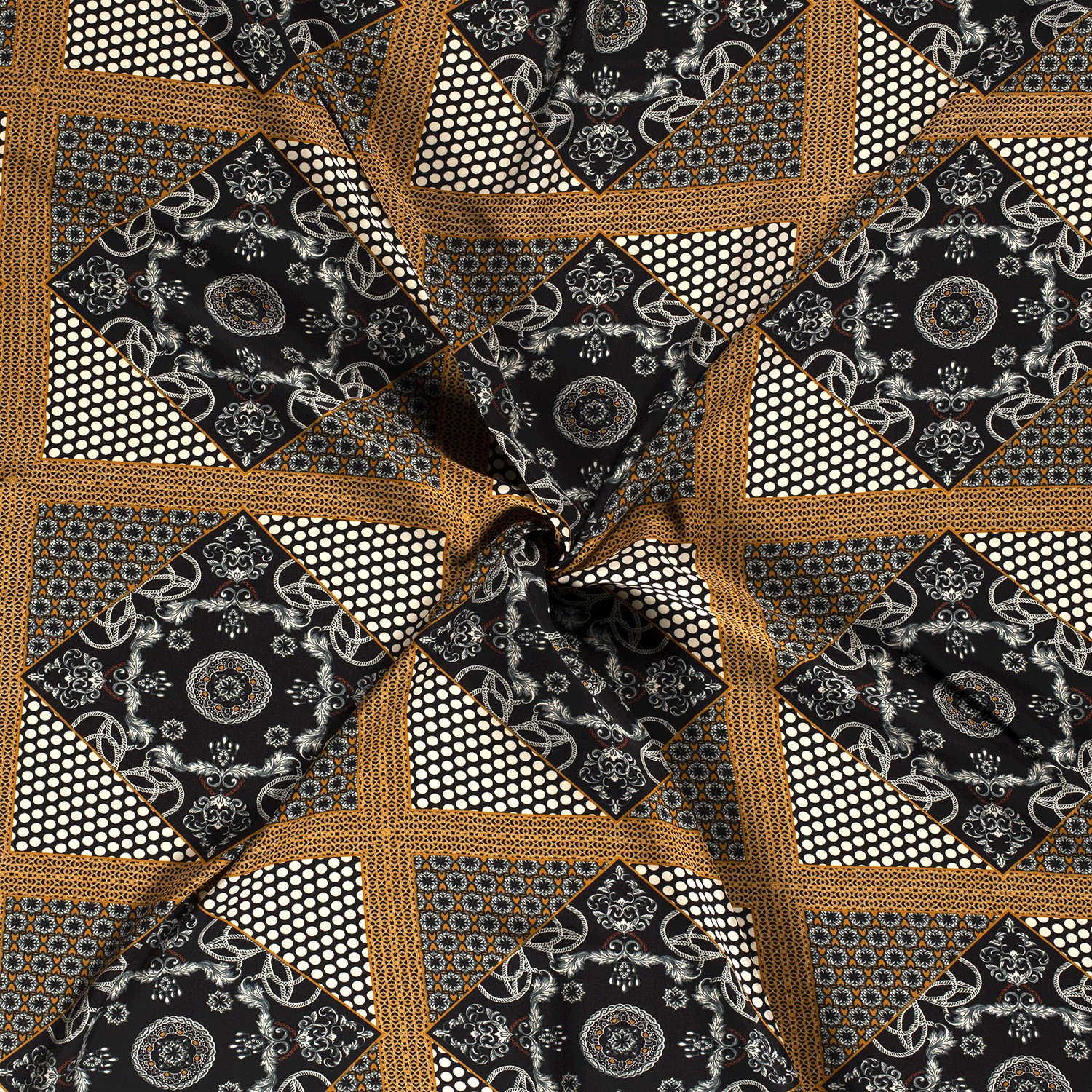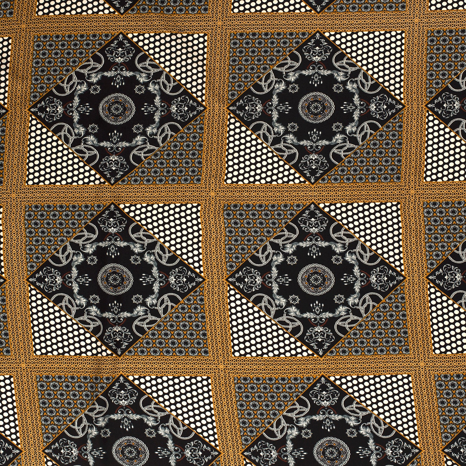 Detta eleganta klädtyg imponerar med en uttrycksfull retrodesign i senapsgult och svart. Fina grafiska element som prickar, små fyrkanter, romber och ornamentala slingor bildar ett stilfullt, lätt orientaliskt mönster. Den senapsgula grundfärgen ger värme och vintagecharm, medan det djupa svarta skapar tydliga konturer och en elegant kontrast.