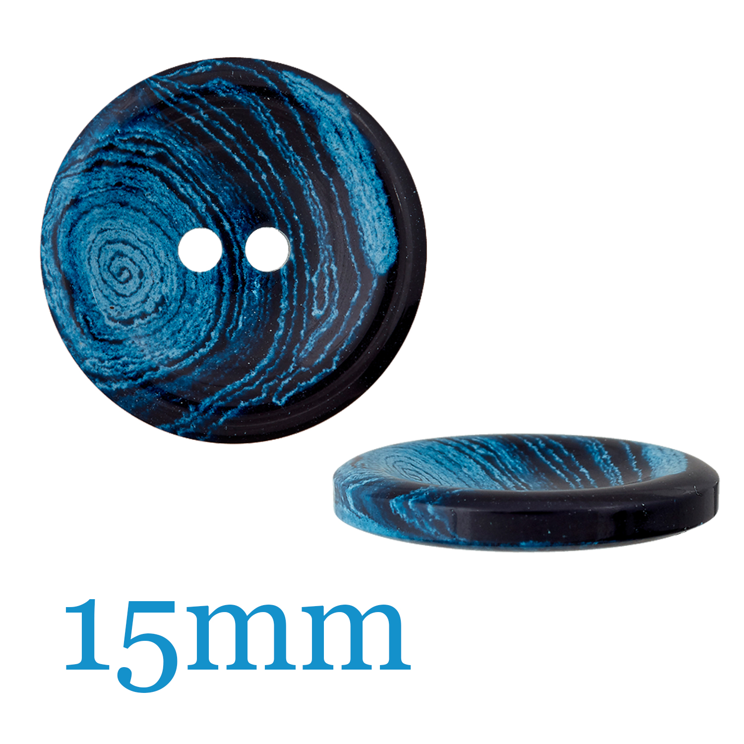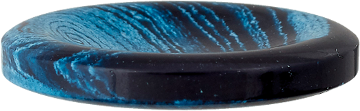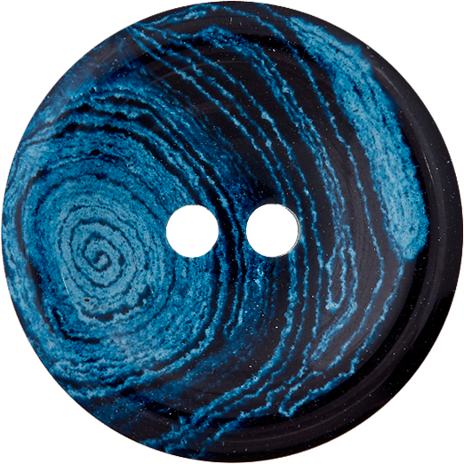 Denna speciella återvunna knapp imponerar med sin unika design: ljusa turkosblå, ringformade linjer löper över ytan som fina årsringar eller marmormönster på en djupt mörk bakgrund. Detta gör att varje knapp ser ut som ett litet konstverk.