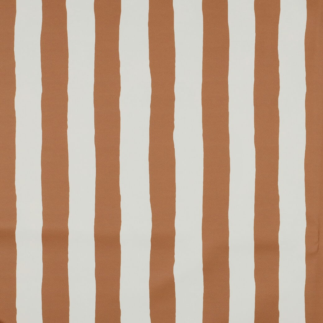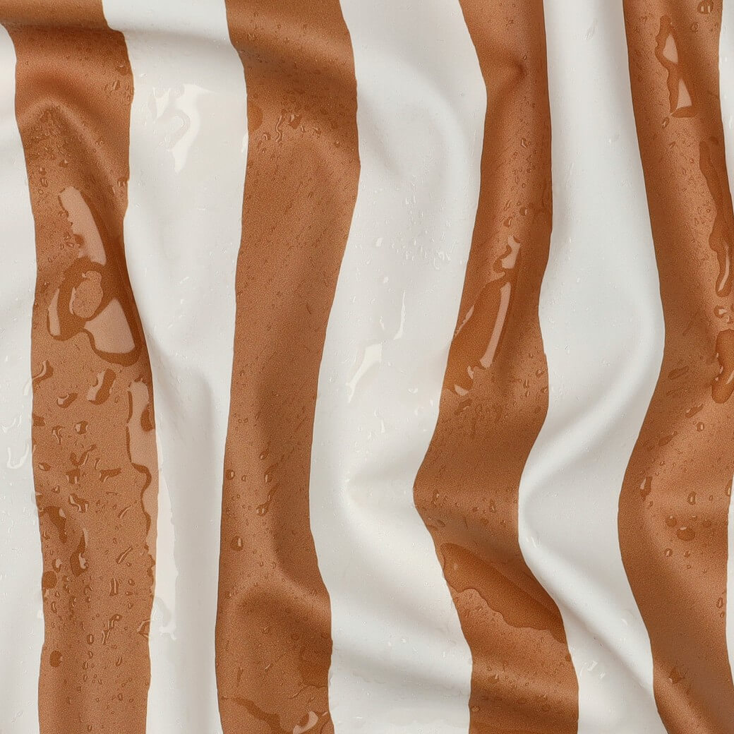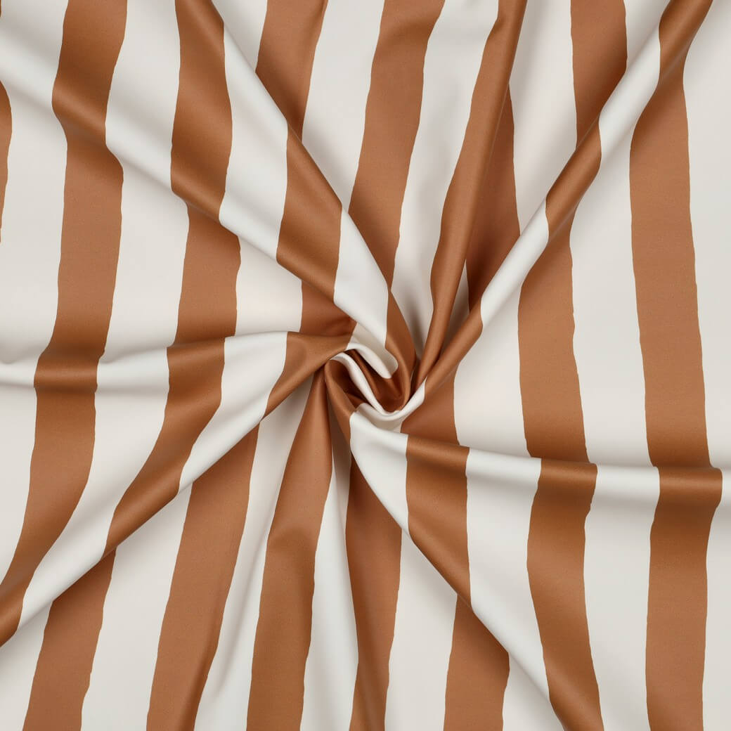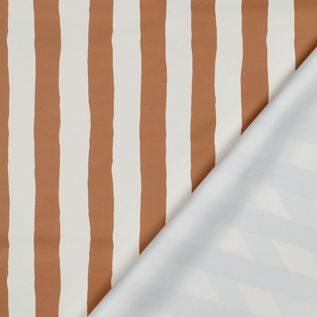 Detta regnjackstyg imponerar med sin fint randiga design i klarvitt och varmt ljusbrunt. De smala, jämna ränderna ger tyget en elegant, modern touch som också ser tidlös ut.
