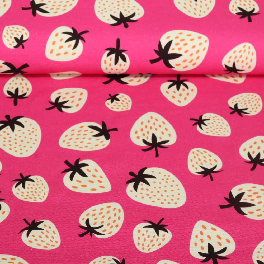 Saftiga jordgubbar, klara färger och en gnutta sommarglädje: den här glada organiska duken ger omedelbart ett gott humör till sybordet. Detaljerade teckningar av jordgubbar i olika storlekar ligger mot en intensivt rosa bakgrund, tillsammans med fina blad och fina accenter - precis som en kärleksfullt upplagd picknick i trädgården.