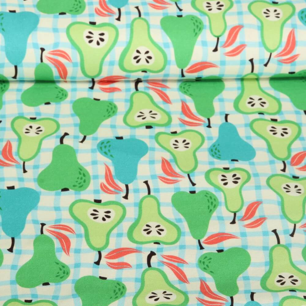 Saftigt, somrigt, helt enkelt aptitretande: stiliserade päron i friskt ljusgrönt, delikat gult och fina mörka konturer tumlar runt på denna glada duk. Frukterna är kärleksfullt illustrerade, ser nästan handritade ut och sprider sig löst över tyget - som en välfylld picknickkorg på en grön äng.