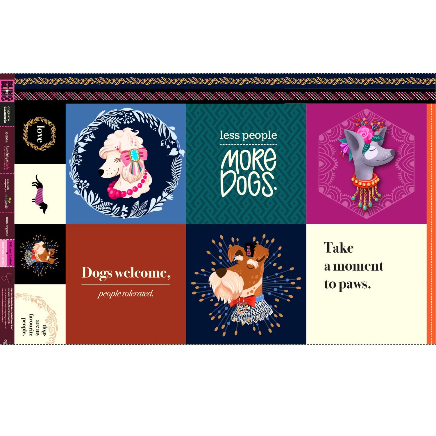 Designen har snygga hundar som är iscensatta som gnistrande diamanter: ibland med solglasögon, ibland med glittrande detaljer, inramade av grafiska element och typografiska uttalanden. De klara färgerna - från livlig rosa och turkos till gult och orange och rika nyanser av blått - skapar en modern, urban look som omedelbart får dig på gott humör.