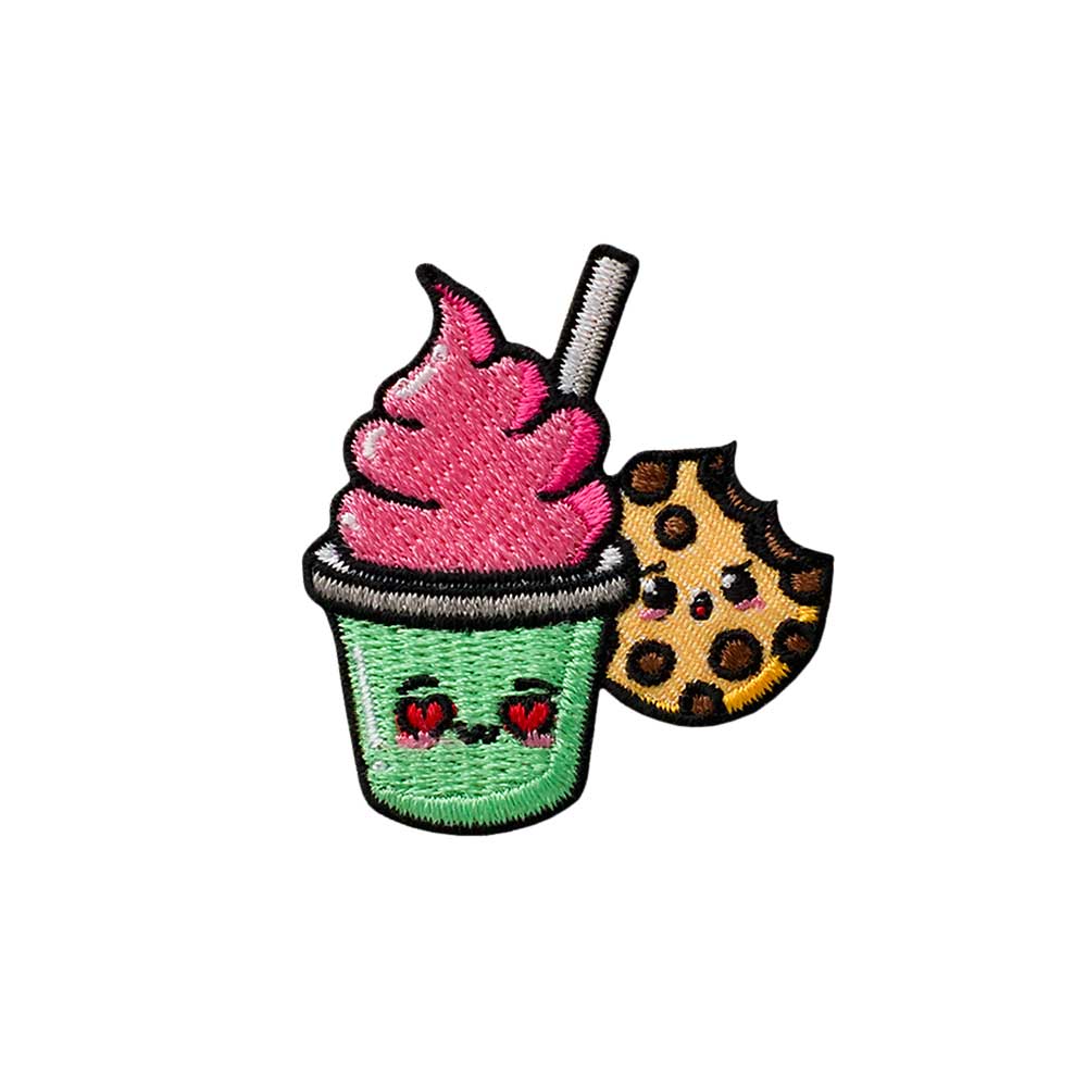 En söt patch med ett shake and cookie-motiv i en trendig kawaii-stil.