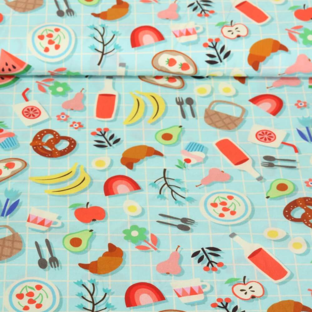 Poplin i ekologisk bomull - digitalt tryck picnic party turquoise