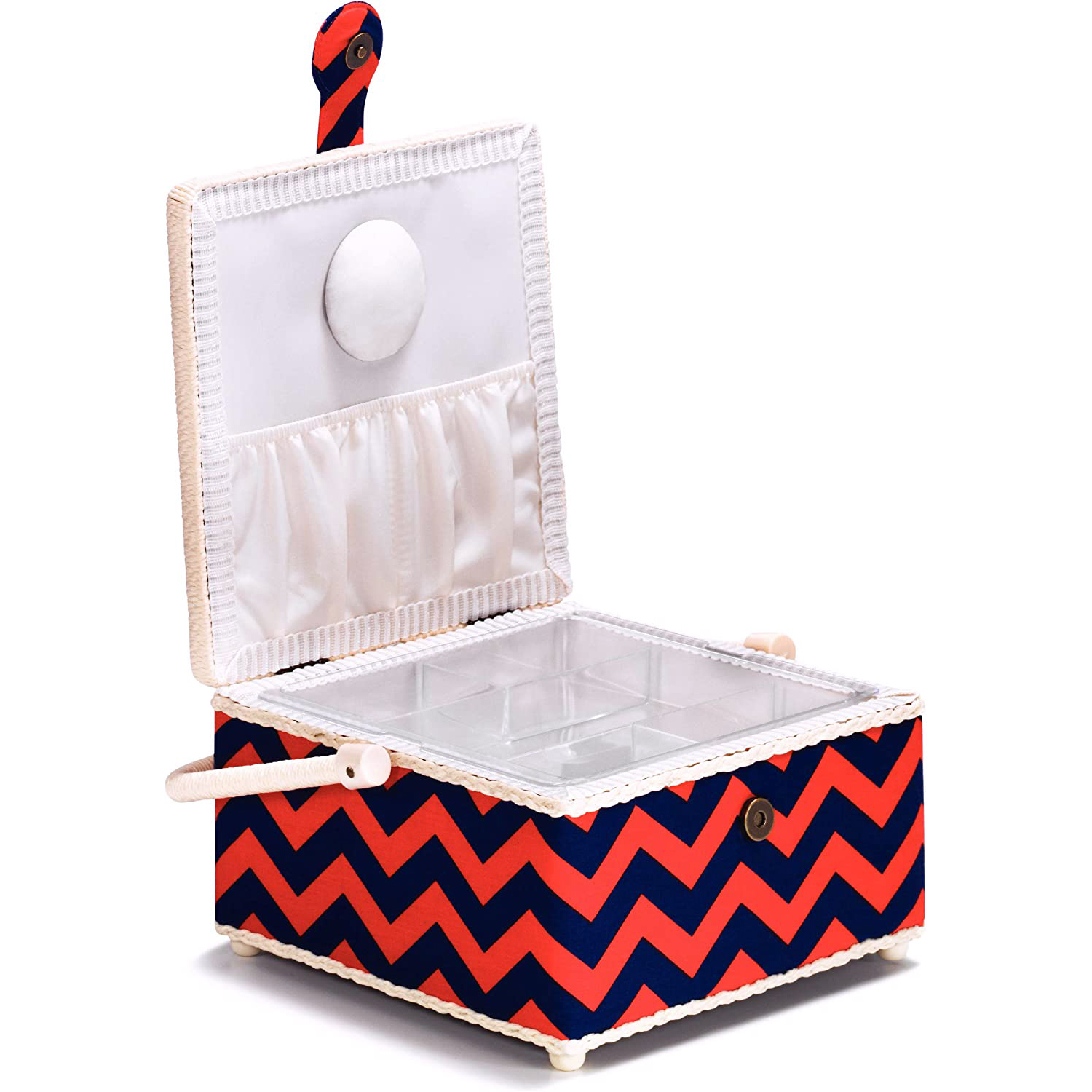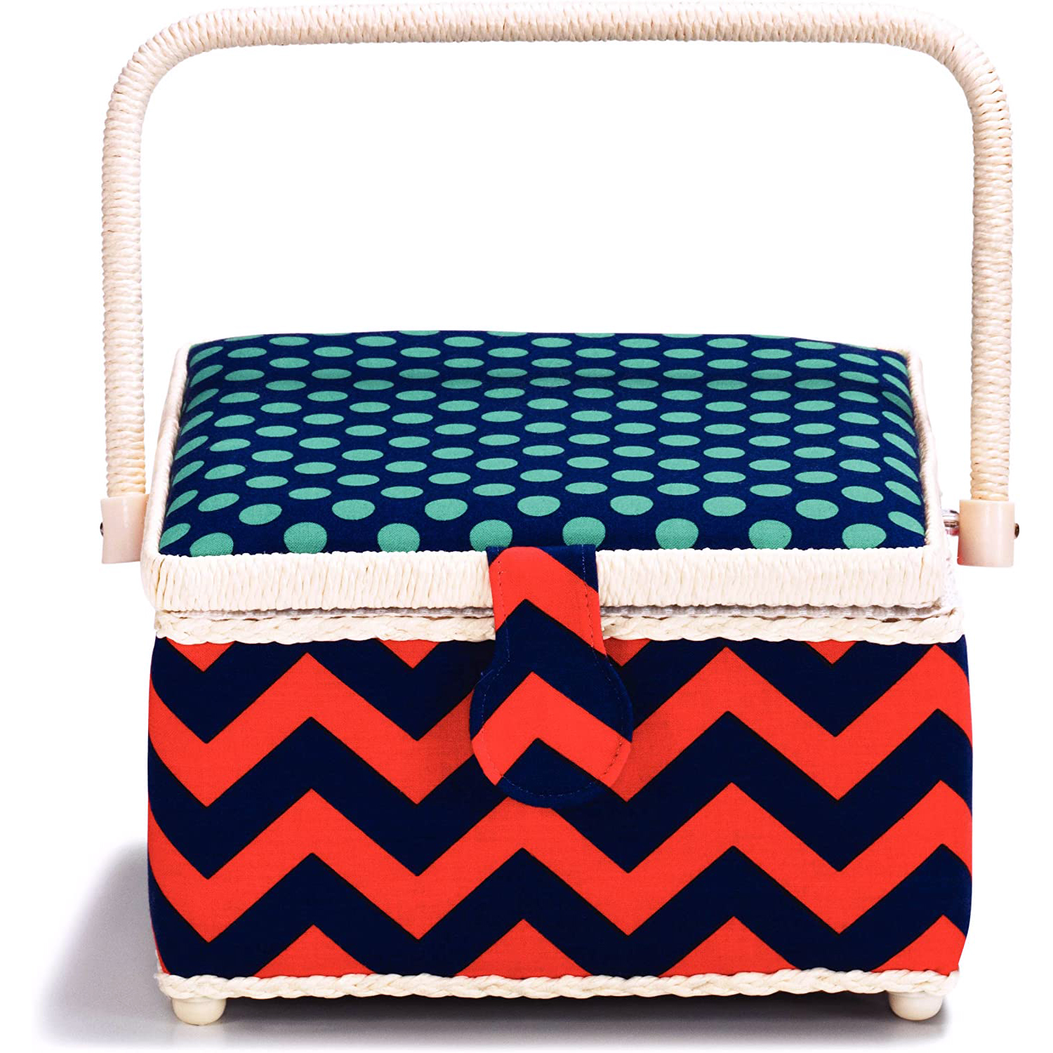 PRYM-sykorgen *Geometry* ger en frisk fläkt till din syhörna: locket är täckt med djupblått tyg och glada, mintgröna prickar, medan själva korgen fångar blicken med ett iögonfallande sicksackmönster i ljusorange och mörkblått. Det ljusa, lindade bärhandtaget och den matchande klaffen med magnetfäste avrundar den moderna, grafiska looken på ett elegant sätt.