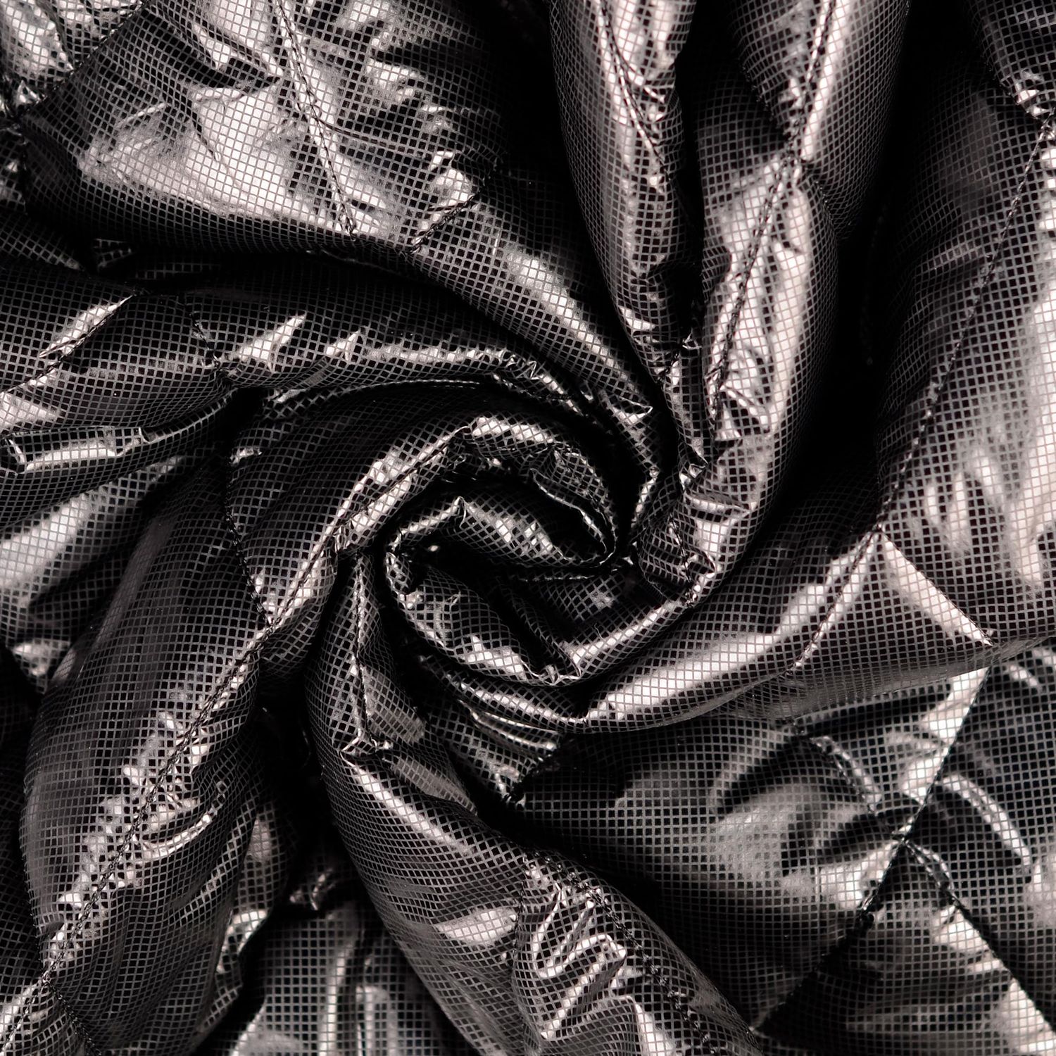 Sofistikerad glans, rena linjer och mysig värme - det här quiltade jacktyget är ett riktigt blickfång. De jämnt placerade diamanterna ger tyget en elegant, strukturerad look, medan den folierade, lätt glänsande ytan i djupsvart skapar en modern, urban look.