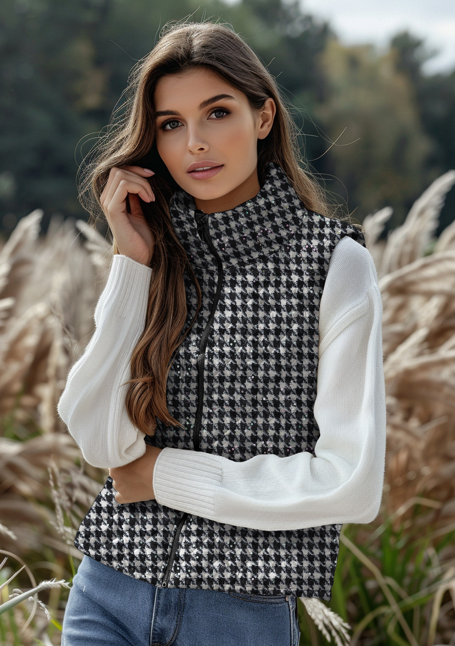 Den spännande kontrasten mellan klassiskt svartvitt hundtandsmönster och mjukt glittrande pastellpaljetter skapar en riktig blickfångare som förvandlar outfits till eleganta och individuella på nolltid – perfekt för alla som älskar eleganta mönster men ändå vill ha en touch av glamour.