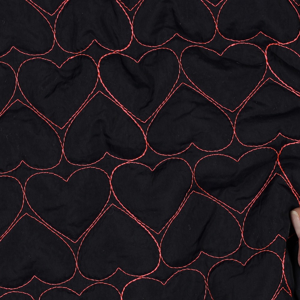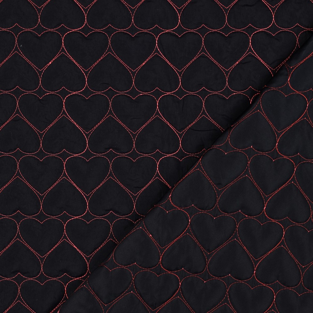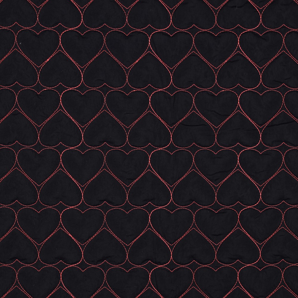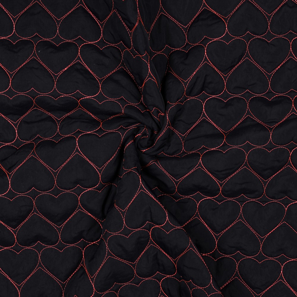 Detta quiltade jacktyg i elegant svart förtrollar med sitt romantiska mönster av quiltade hjärtan. De jämnt quiltade hjärtana ger tyget en vacker struktur och gör det till en blickfångare – diskret men ändå speciellt.