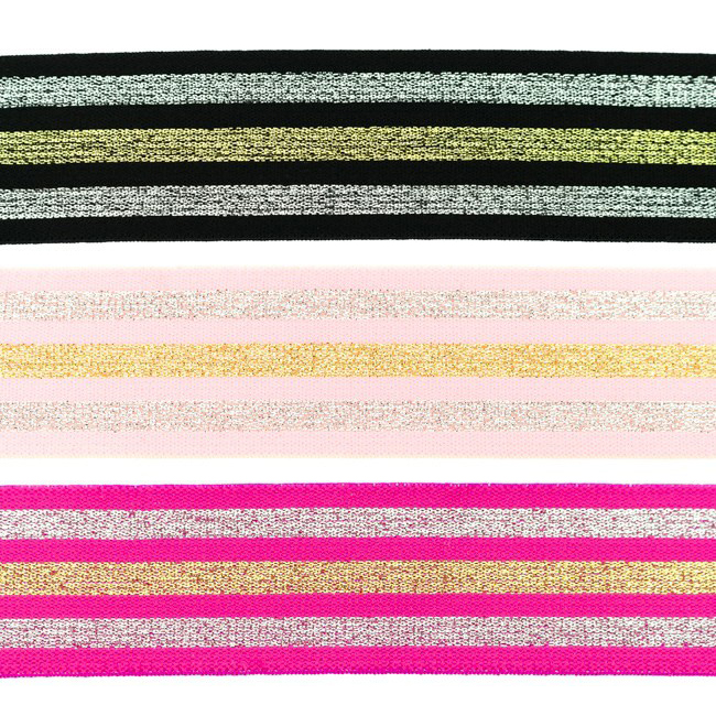 Med detta eleganta elastiska band med glittrande lurexränder kan du sätta en strålande accent på alla dina sömnadsprojekt. De fint skimrande ränderna i silver och guld är särskilt vackra på den färgade bakgrunden - oavsett om det är klassiskt på svart, fint på rosa eller starkt på rosa.