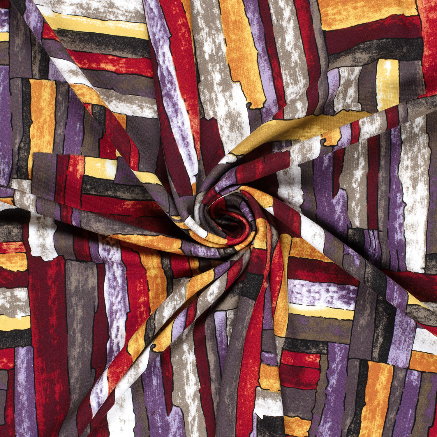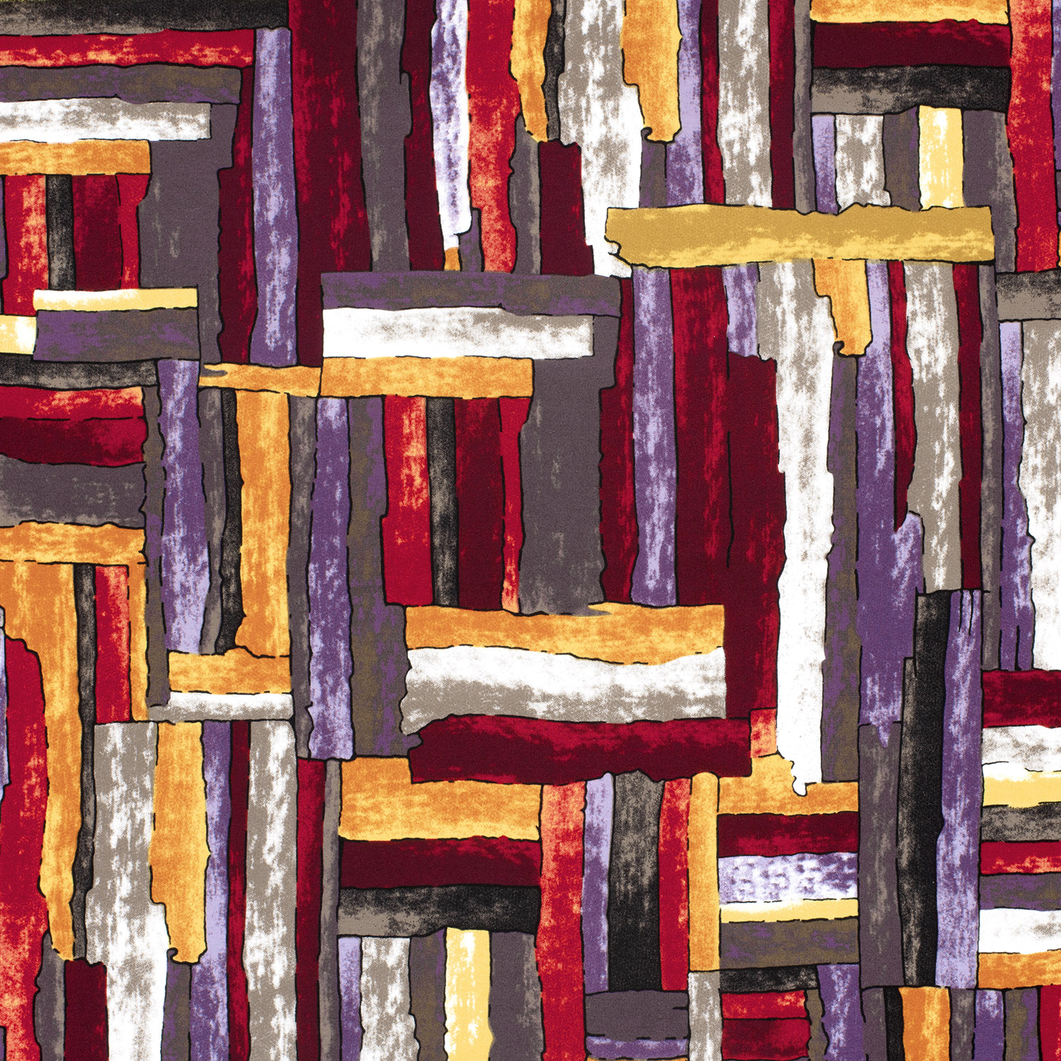 Ett tyg som en modern målning: På denna Romanit-jersey möts kraftfulla röda nyanser med mjuka rosatoner, varm beige och ädla mörka accenter. Det grafiska rektangelmönstret liknar små abstrakta färgytor som livligt följer varandra – ibland klart konturerade, ibland lätt suddiga, som om de målats med pensel.