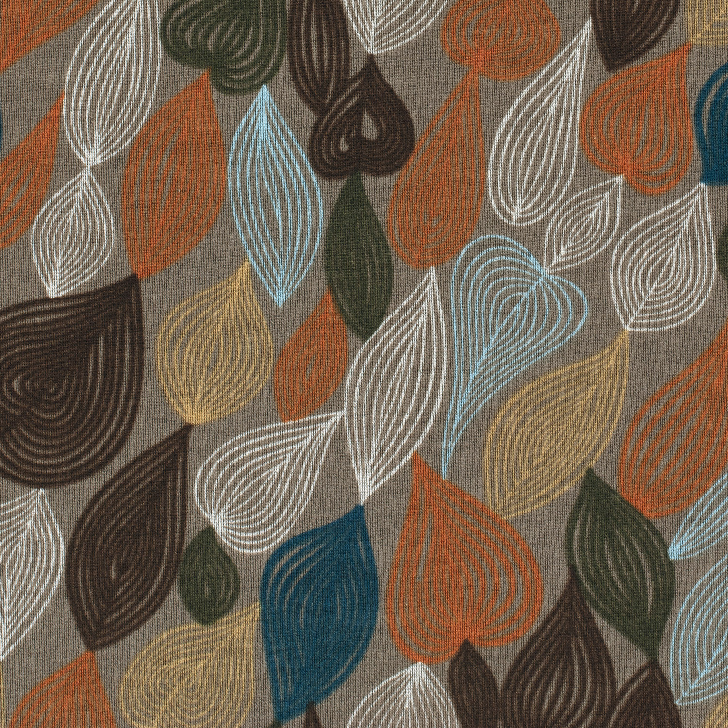 En modern dröm med blad i mjuka naturtoner: På den fint strukturerade jerseyn slingrar sig stiliserade blad i tunna linjer över en elegant taupe bakgrund. Bladen ser ut som om de är ritade med en fin penna – ibland tätare, ibland luftigare – och ger tyget en elegant, grafisk touch utan att vara påträngande.