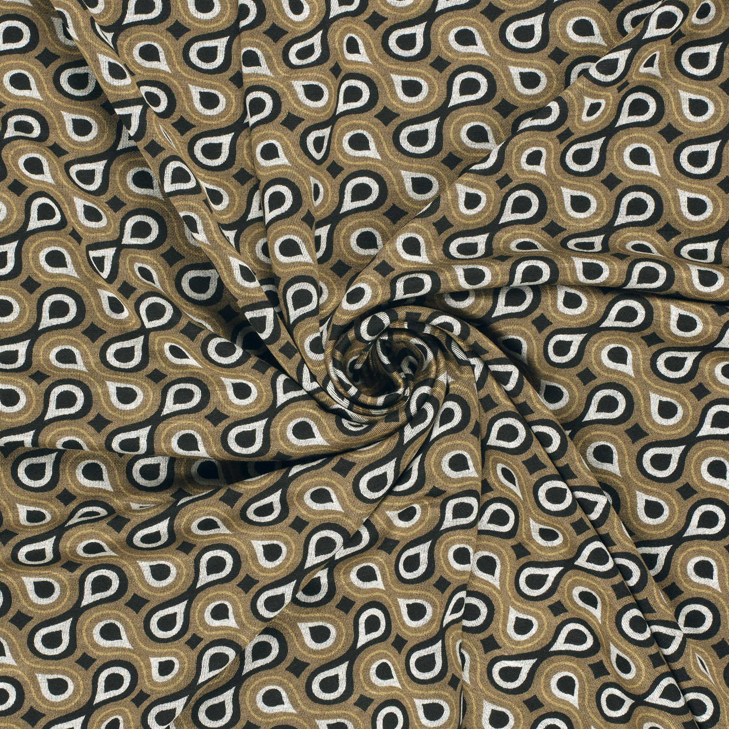 Ett tyg gjort för stilfulla framträdanden: på denna romanit-jersey dansar fina droppar i varma bruna och beige toner över en djup svart bakgrund. Det grafiska mönstret är modernt och samtidigt tidlöst elegant – perfekt om du vill kombinera enkla snitt med en speciell detalj.