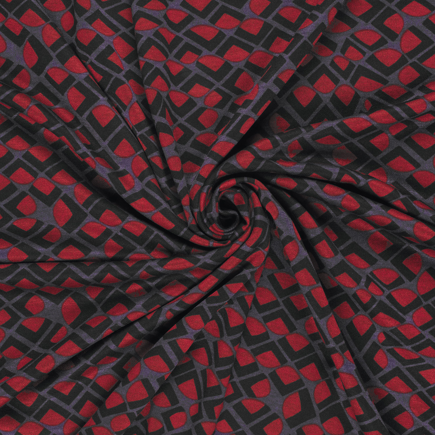 Tyg som ett fyrverkeri av former och färger: Denna romanit-jersey imponerar med ett levande bågmönster i kraftigt rött, genomfört av fina, krämfärgade linjer. Den lätt geometriska placeringen av bågarna påminner om stiliserade vågor eller fjäll och ger designen en modern, grafisk touch – perfekt för den som älskar iögonfallande men ändå eleganta mönster.