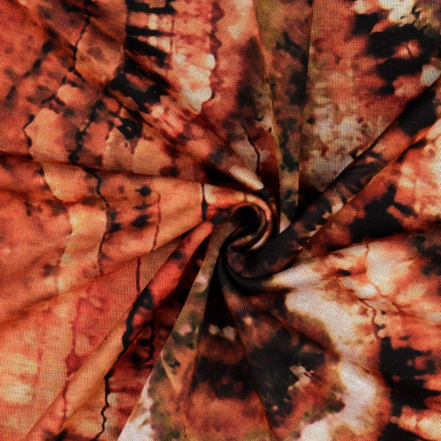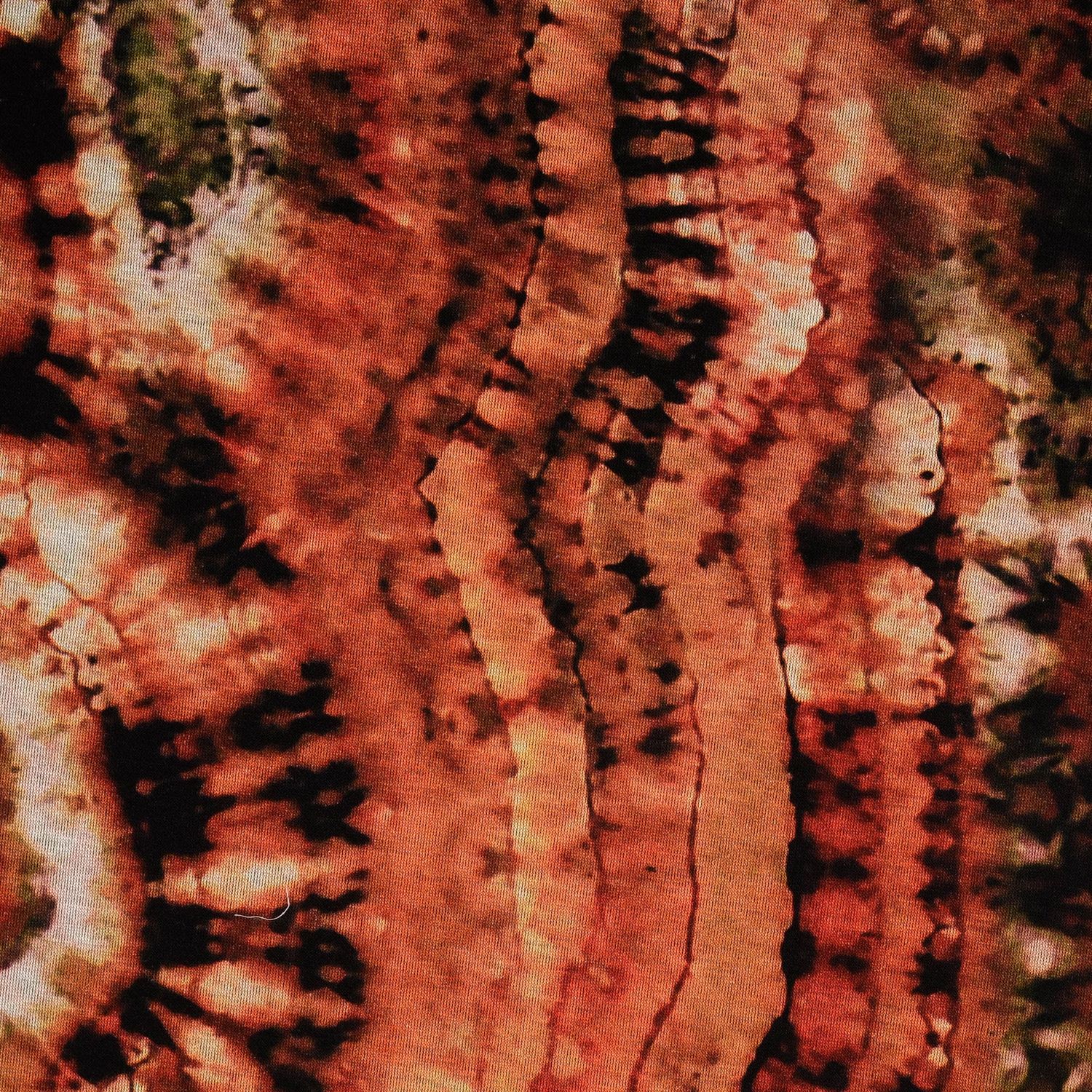 Tyg som en solnedgång på huden: Denna romanitjersey imponerar med en spännande batikdesign i varma rost- och kopparfärger, genomdragen av mjuka nyanser i beige, kräm och ljust grått. Färgerna ser ut som sammanflätade penseldrag – ibland intensivare, ibland mjukt utvattnade – och ger tyget ett levande, konstnärligt djup.