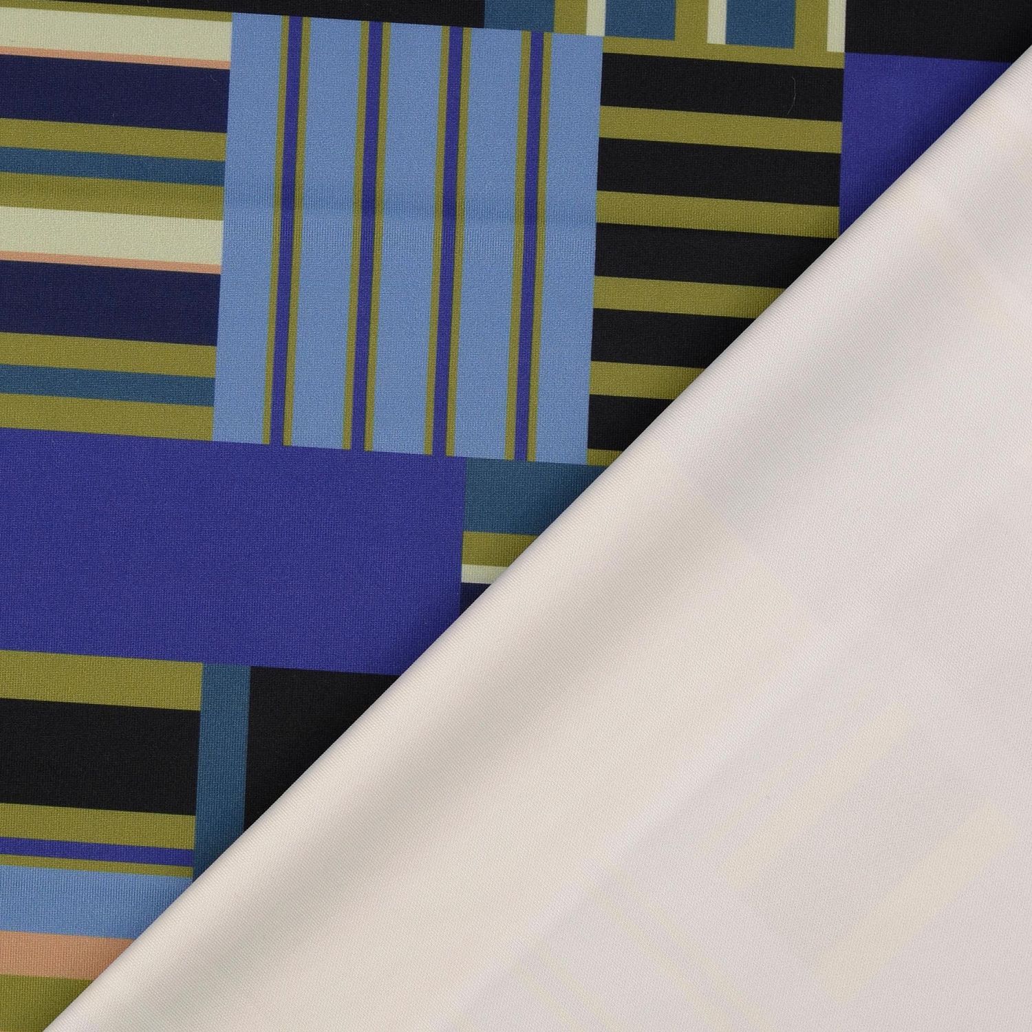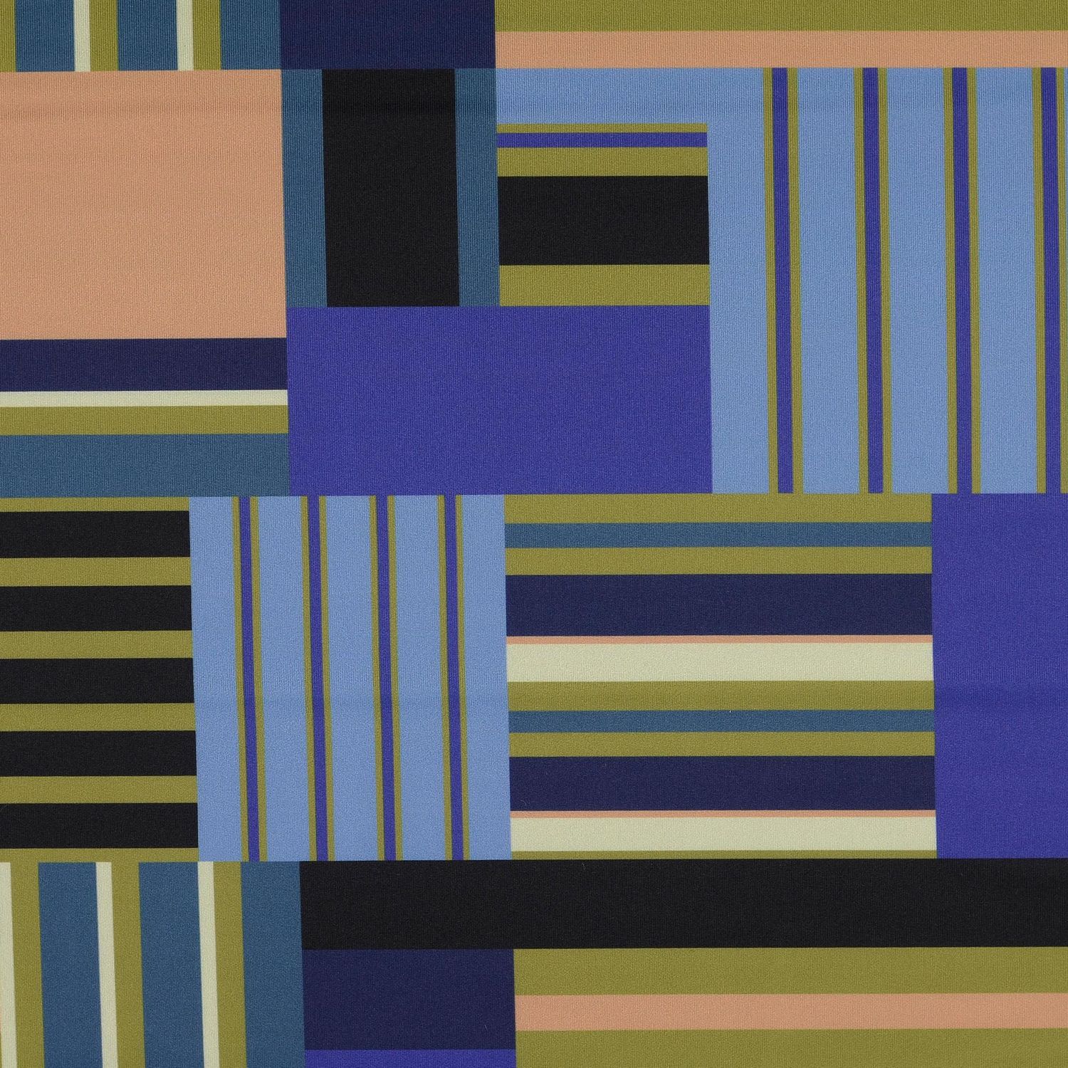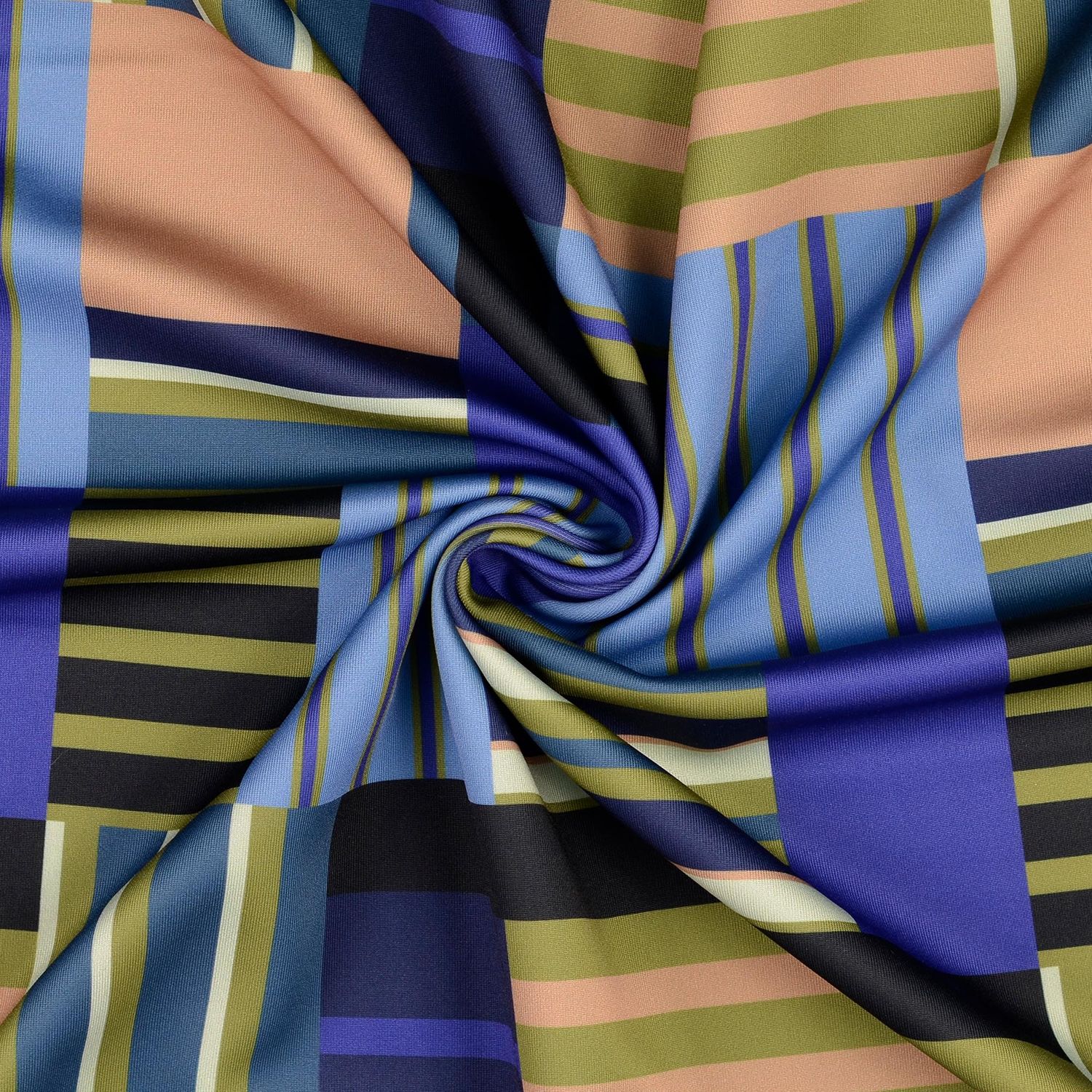 En modern blickfångare med tydliga linjer: Detta scuba-tyg visar ett spännande spel av rektanglar och ränder i olika blå nyanser – från djup marinblå till kall mellanblå och mjuka, nästan pastelliga toner. Däremellan sätter ljusa, nästan vitaktiga accenter och fina kontrastlinjer det grafiska mönstret perfekt i fokus.