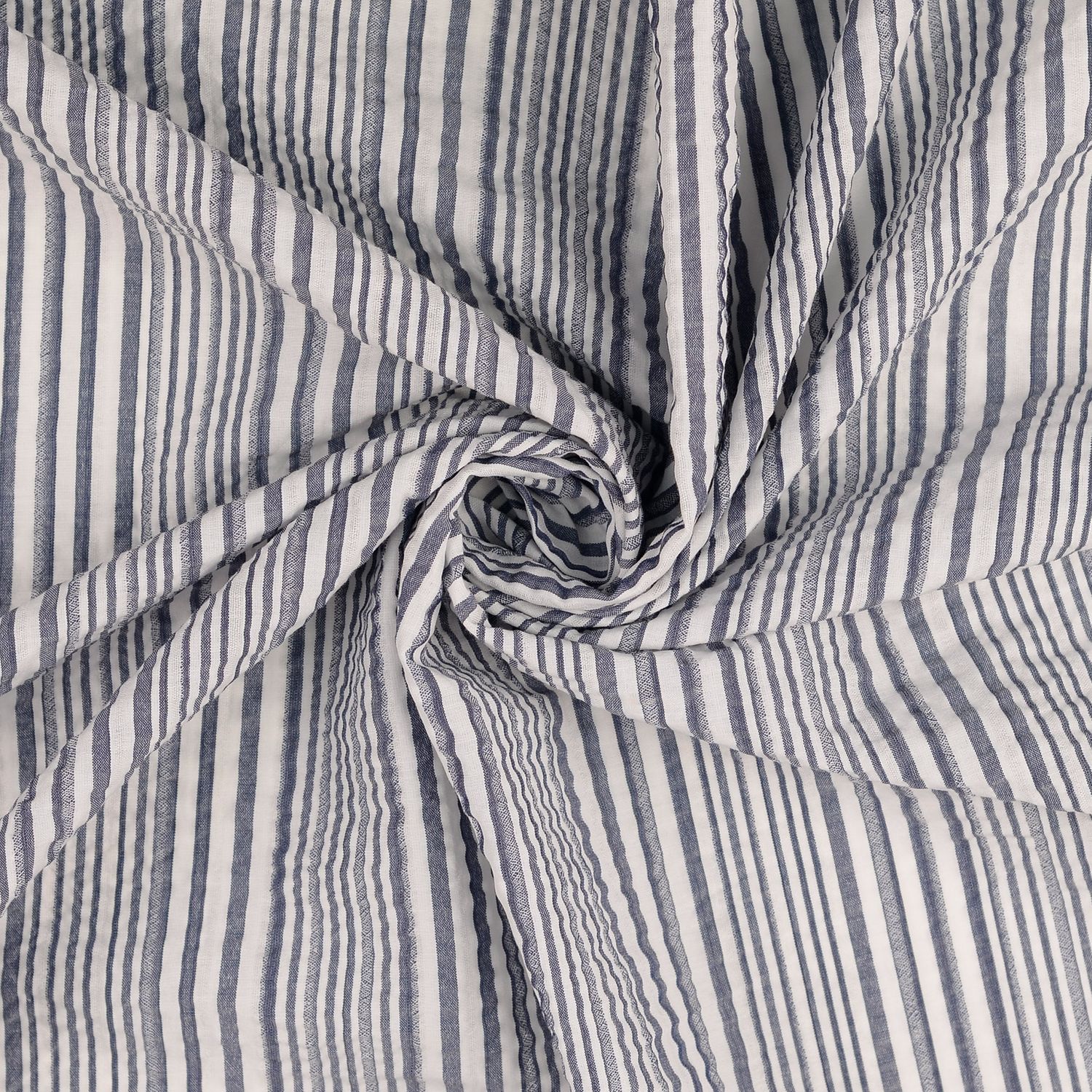 Denna tidlöst vackra seersucker med blå ränder ger omedelbart en frisk lätthet till dina syprojekt. Den fina, vågiga strukturen ger tyget dess typiska, lätt luftiga karaktär – perfekt för varma dagar och för alla som gillar bekvämt och stilfullt.