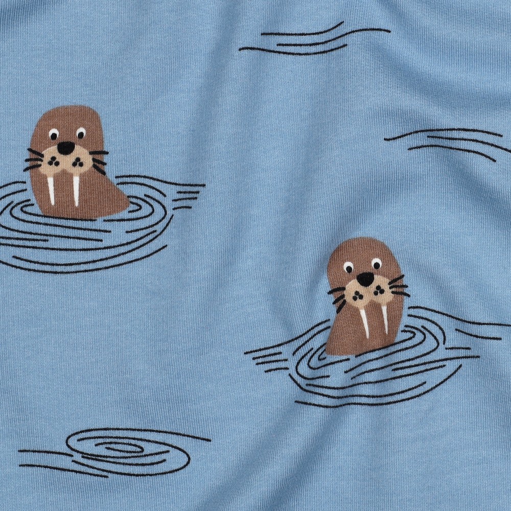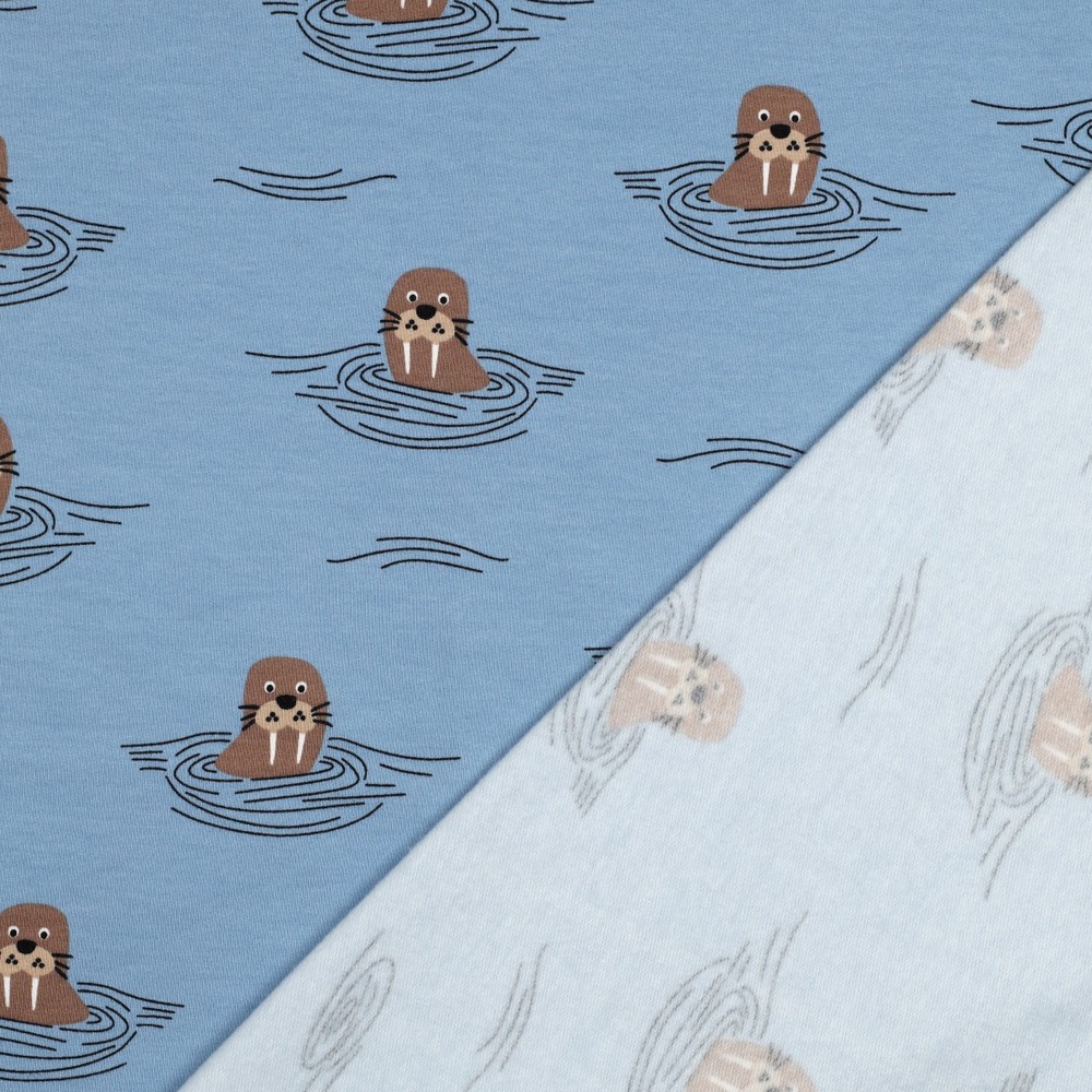 Lätt att bli förälskad i: På detta mysiga soft sweat-tyg leker små valrossar på en mjuk jeansblå bakgrund. De söta djuren med sina morrhår, fenor och betar är kärleksfullt tecknade och ser ut att glatt plaska i vattnet. Diskreta, ljusa accenter och fina detaljer ger designen en lekfull, maritim känsla utan att bli för färgstark.