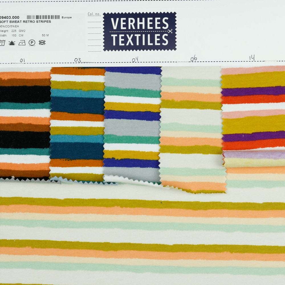 Denna mysiga soft sweat ger nytt liv till dina syprojekt med sin retro-randiga look. Fina, olika breda ränder i ljusgrått, varm rostorange, mjukt beige, ljust mint och en mjuk blå ton ligger harmoniskt bredvid varandra och påminner om avslappnade vintage-stilar – modernt tolkade och underbart tidlösa.