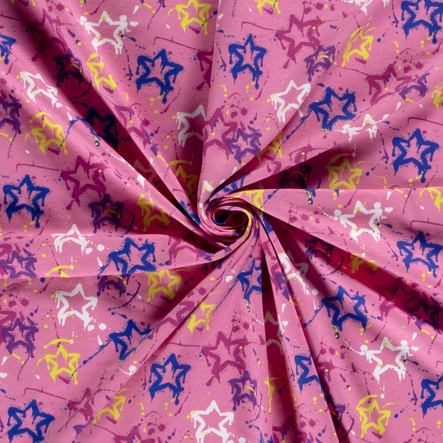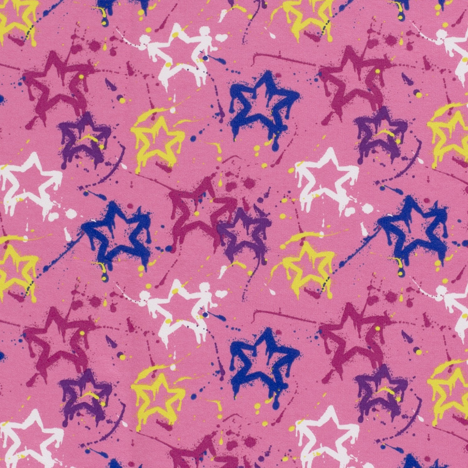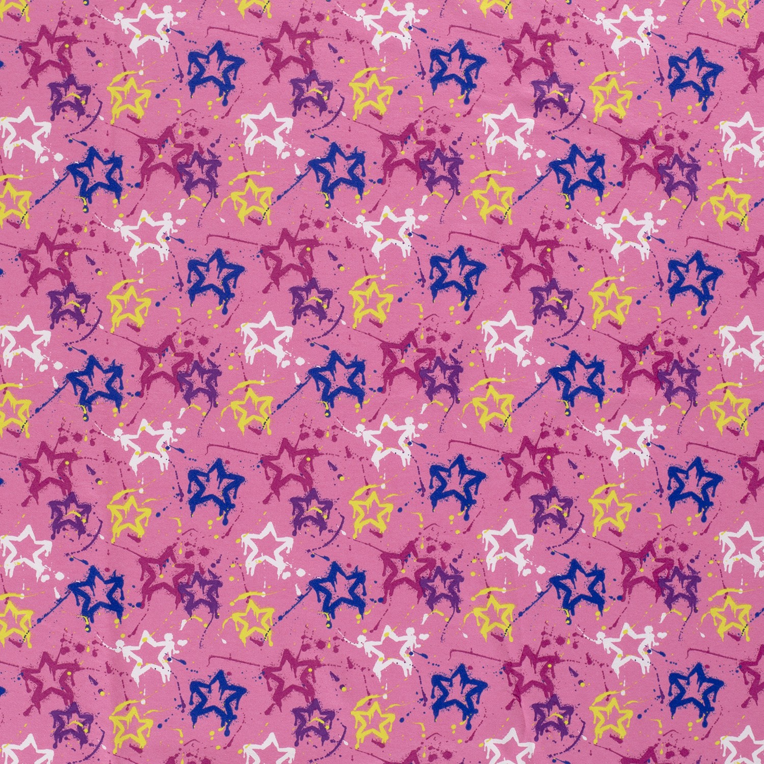 En dröm för små och stora stjärnfans: På en mjuk rosa bakgrund leker glada färgglada stjärnor i olika storlekar – från pyttesmå stjärnor till stora, lysande stjärnor. Däremellan skapar färgade fläckar och prickar en livfull och lekfull look som genast gör en glad.