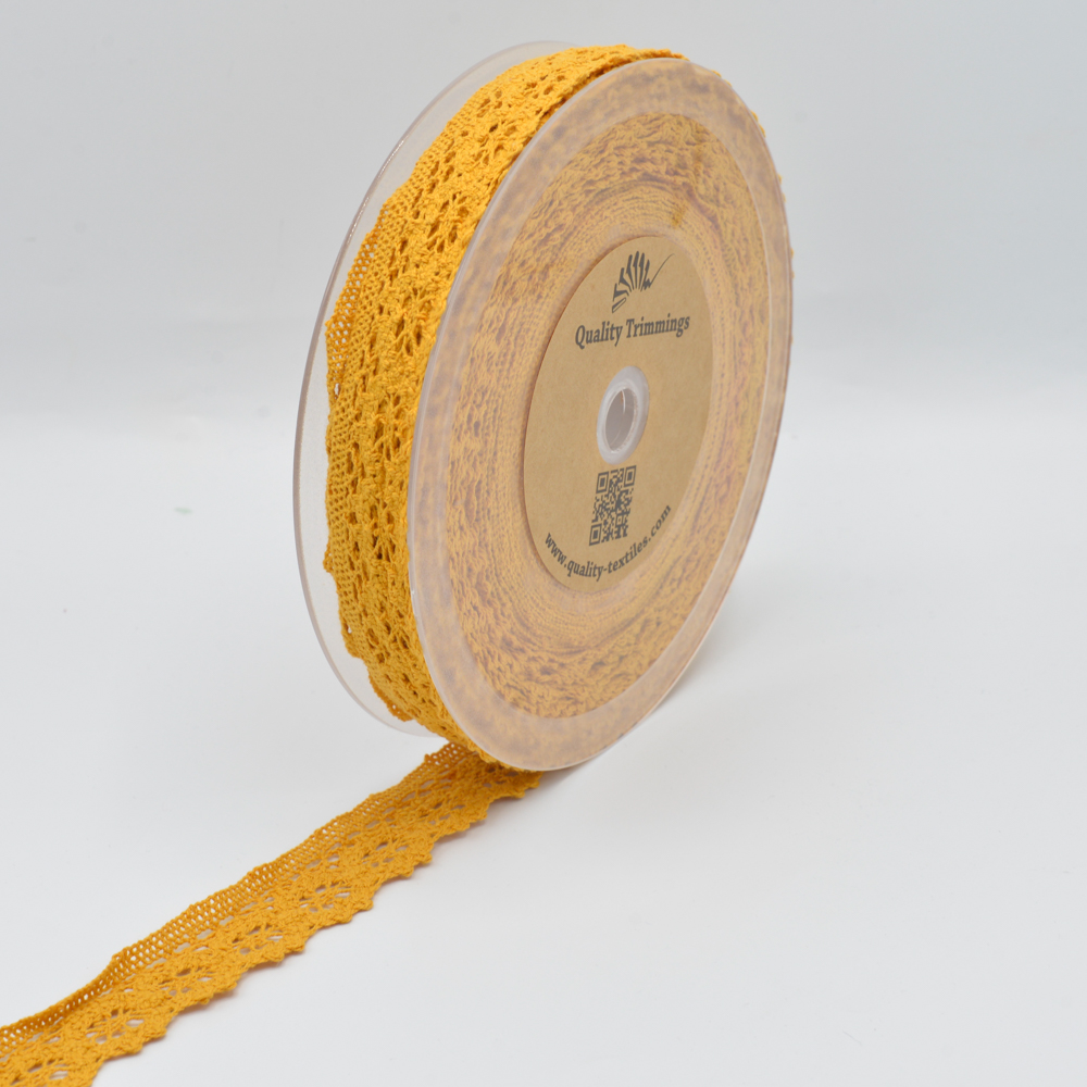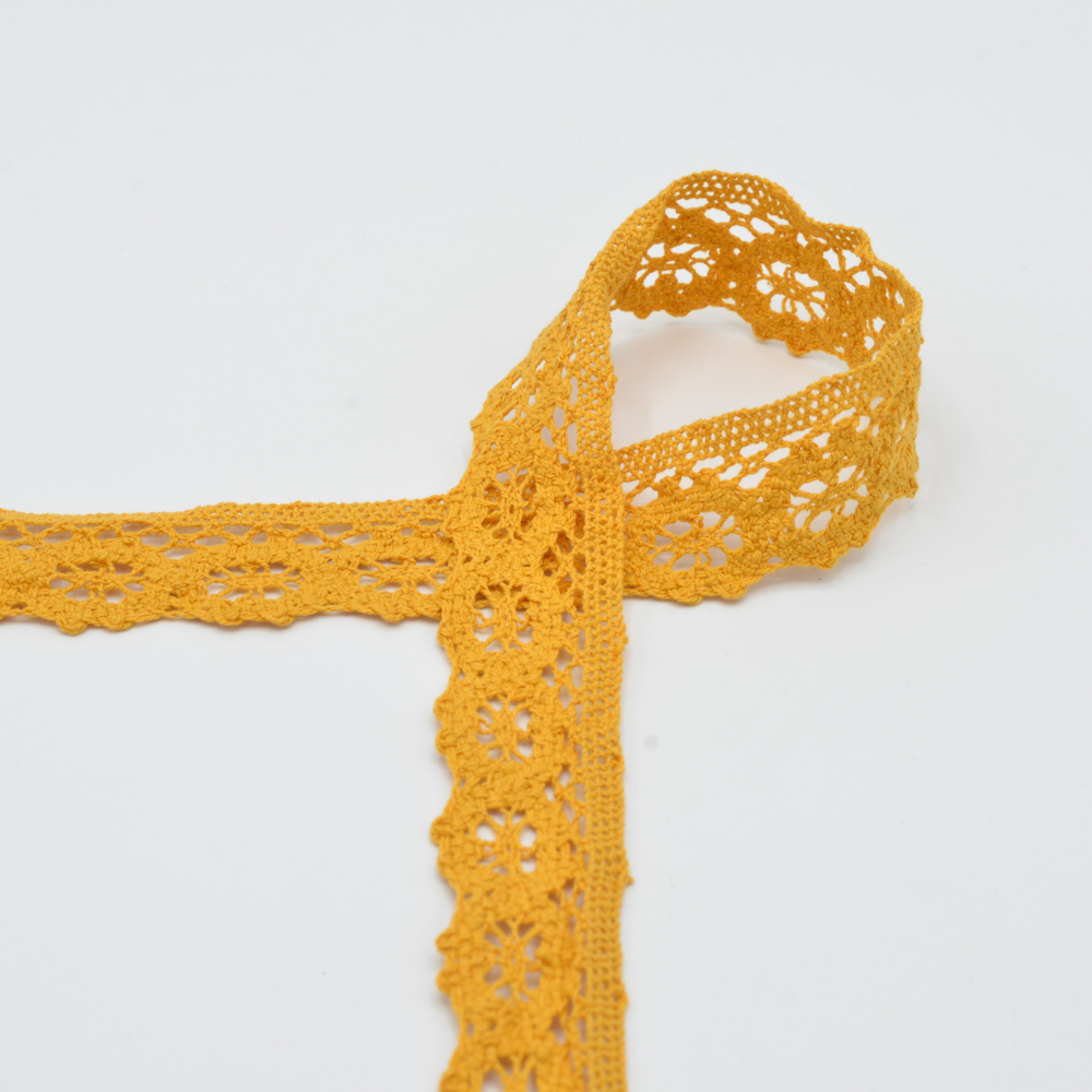 Delikat, lekfullt och ändå underbart naturligt: detta fina spetsband i bomull i varm majsgul färg ger en touch av sommar till alla projekt. Det filigrana ögonbroderiet påminner om små blommor och rosetter, som står dekorativt uppradade och utstrålar en kärleksfull, handgjord karaktär. Den mjuka gula tonen ser vänlig och fräsch ut utan att vara för ljus - perfekt för att lysa upp neutrala tyger eller stilfullt framhäva färgade tyger. Spetsbandet kan användas som dekorativt avslut, romantisk detalj eller lekfull bård och ger en charmig, lätt färgklick var som helst.