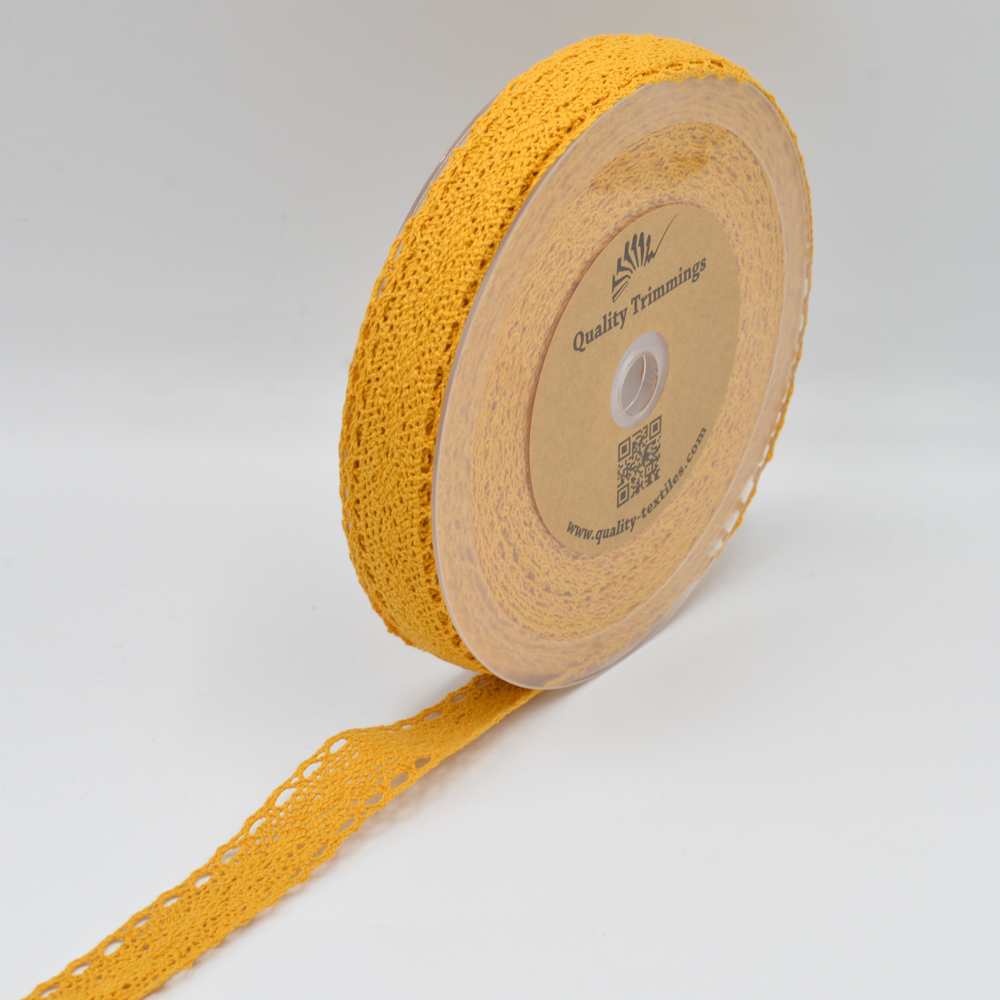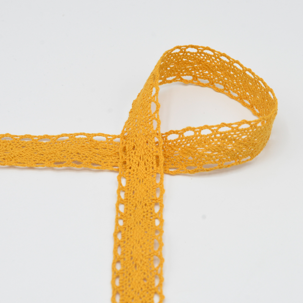 Fin spets i en delikat majsgul färg: detta kärleksfullt tillverkade spetsband i bomull ger varje sömnadsprojekt en romantisk och lekfull look. De filigrana bågarna och det detaljerade hålmönstret ser lätta och luftiga ut, medan den varma gula färgen påminner om soliga sommardagar.