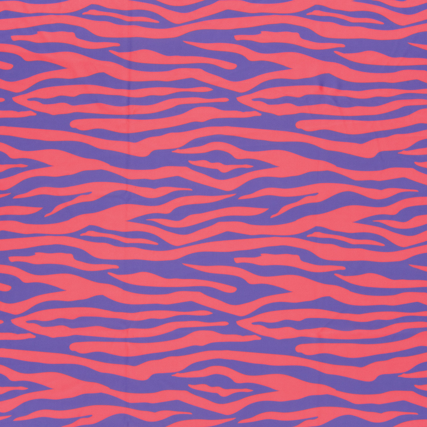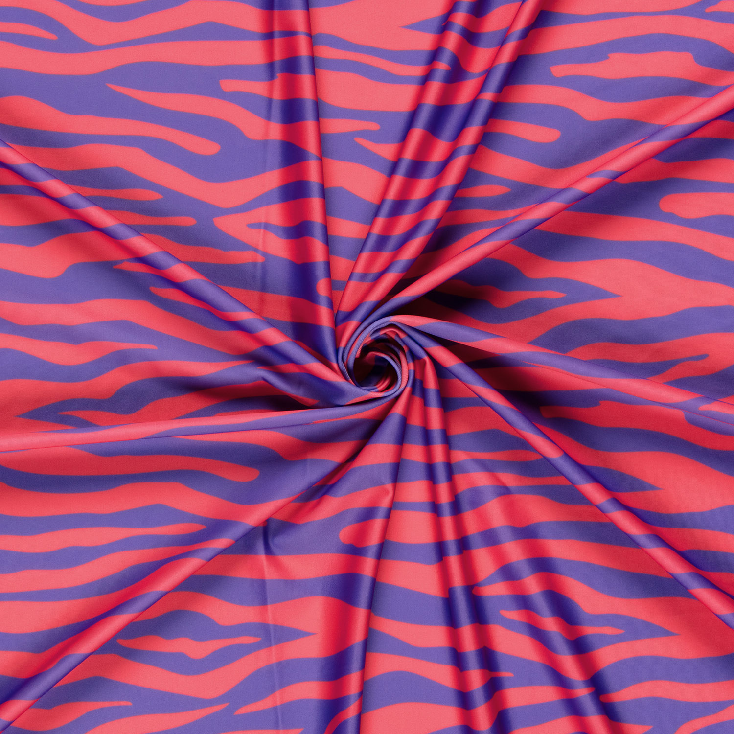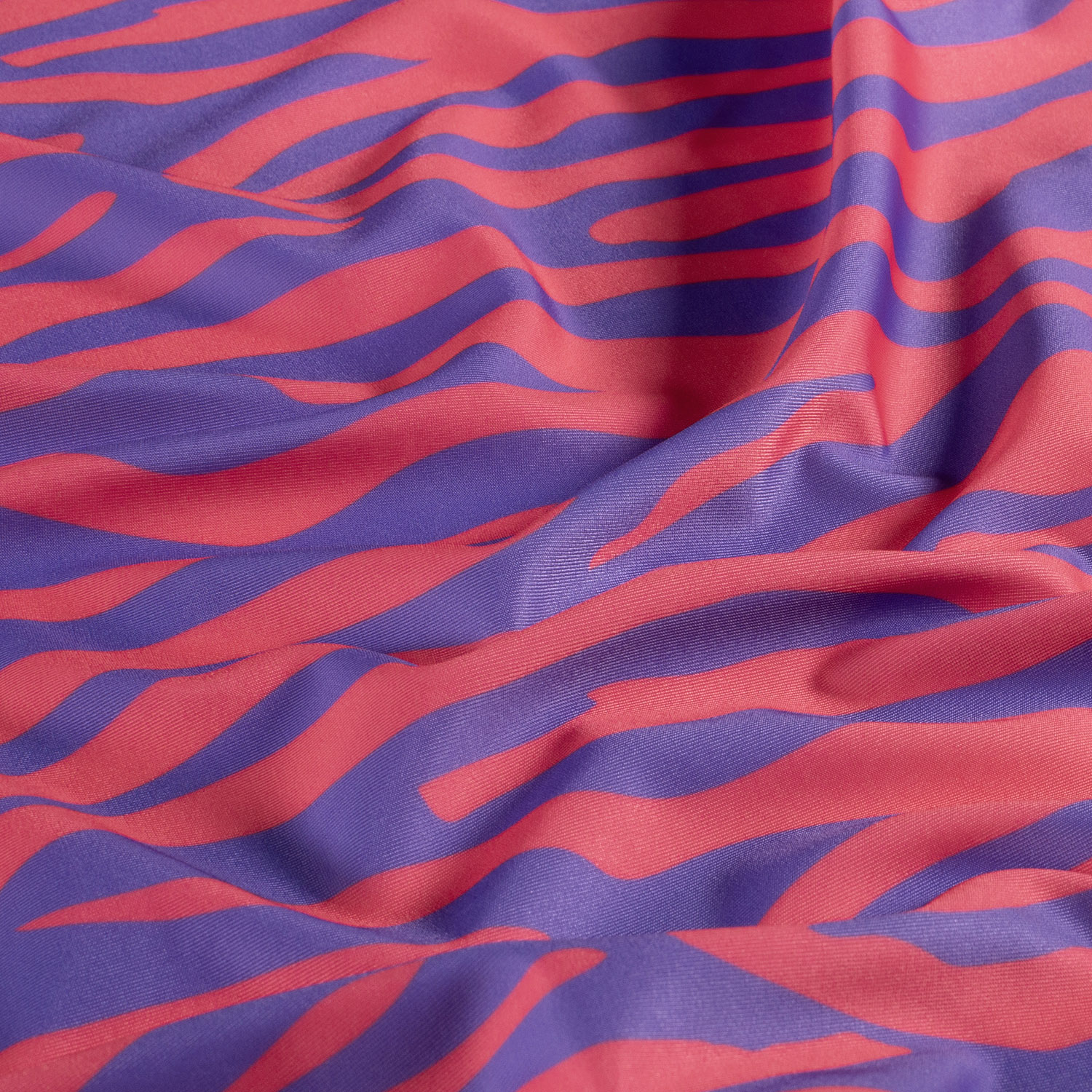 Detta sport- och badtyg drar allas blickar till sig: det moderna zebramönstret är digitaltryckt i fascinerande lila och violetta toner och fungerar som en stilfull blandning av djurprint och trendfärger. De dynamiska ränderna ger dina projekt en sportigt elegant touch – perfekt för dig som vill sticka ut modemedvetet på stranden, i simhallen eller vid träning.