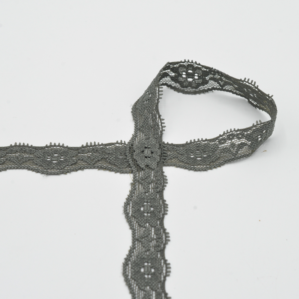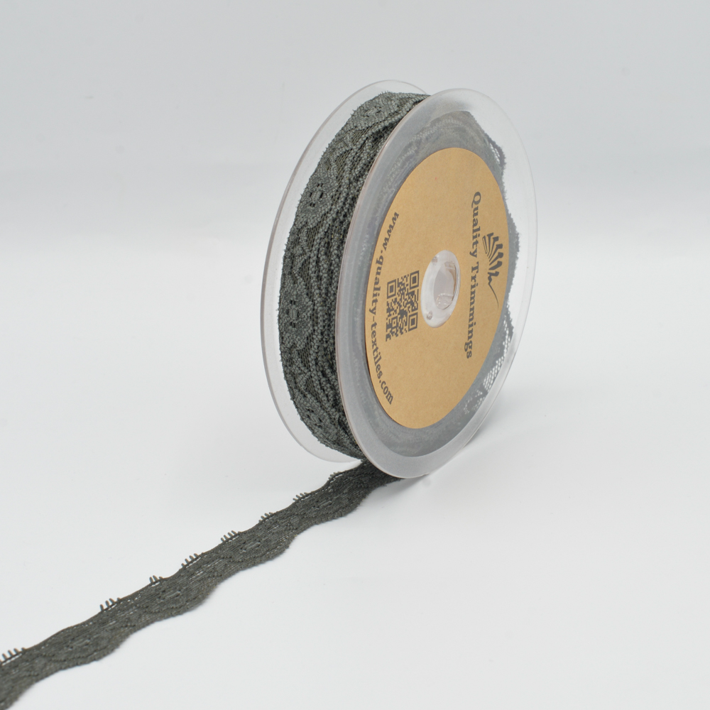 Fin spets i en trendig army-nyans: detta fina spetsband i dämpad olivgrön färg ger dina sömnadsprojekt en sofistikerad men ändå avslappnad touch. Det fina mönstret med små rosetter på kanterna har en romantisk men modern look - perfekt för att snyggt lyfta fram enfärgade tyger.