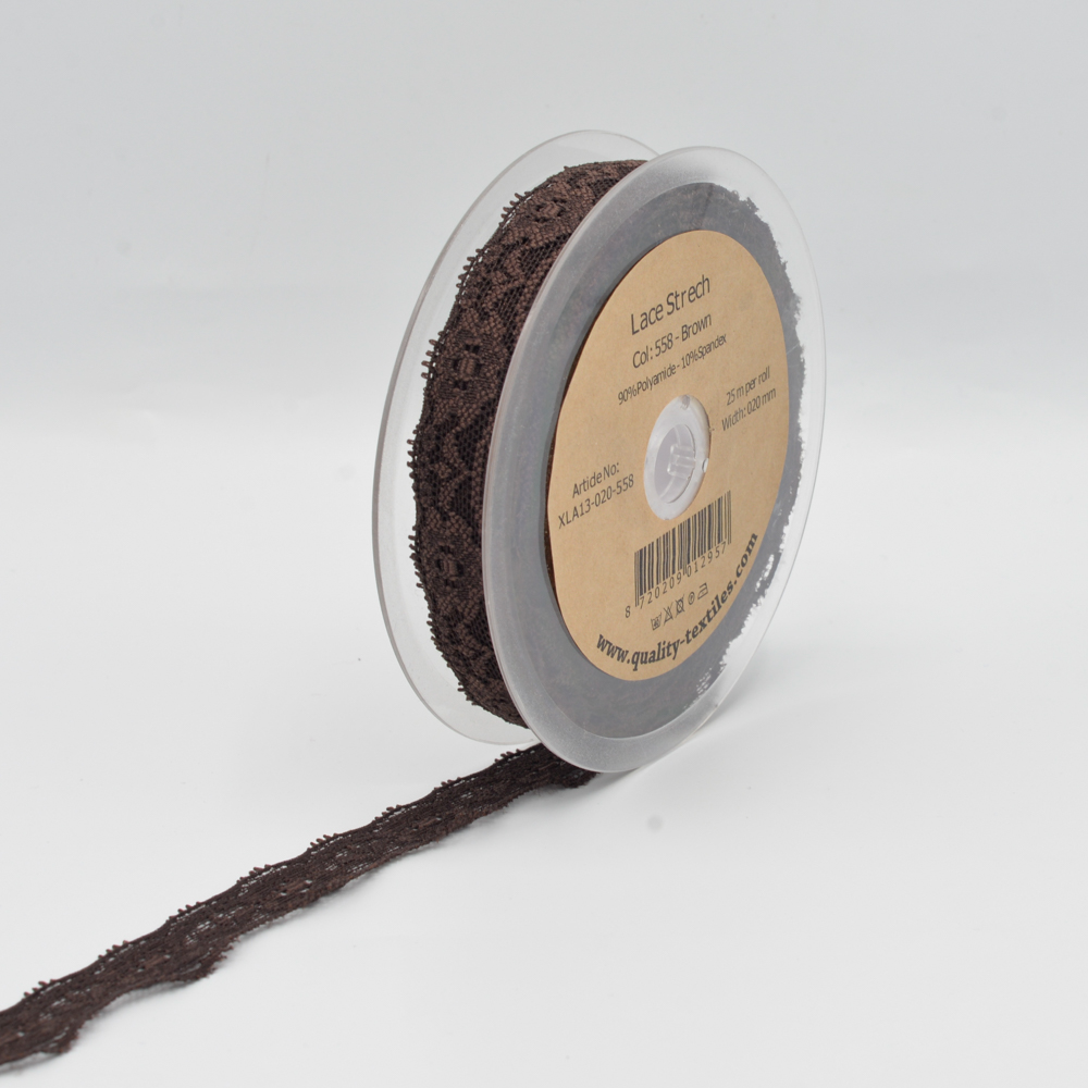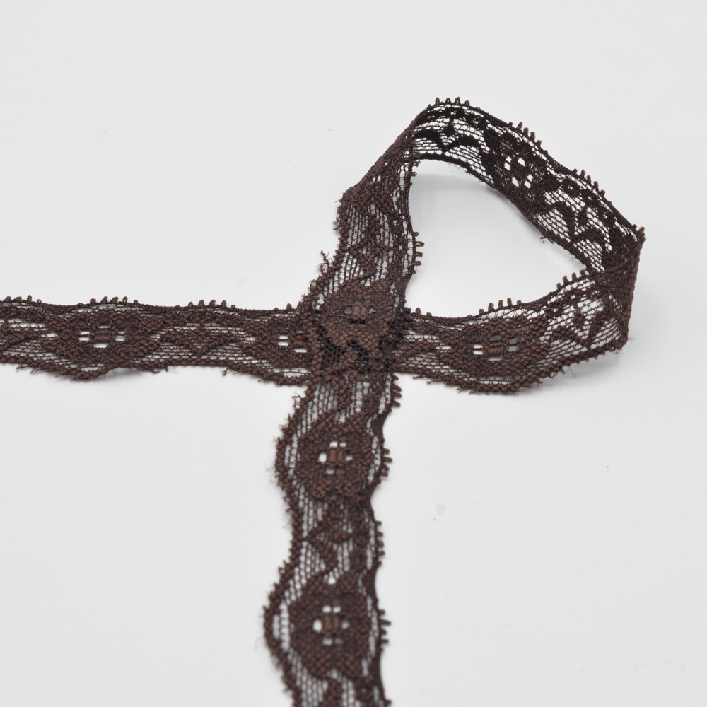 Fin, elastisk spets i en varm, mellanbrun nyans som ger en sofistikerad men ändå naturlig touch till alla sömnadsprojekt. Det delikata spetsmönstret ser fint och feminint ut, med mjukt svängda bågar i kanterna som gör bandet extra dekorativt.
