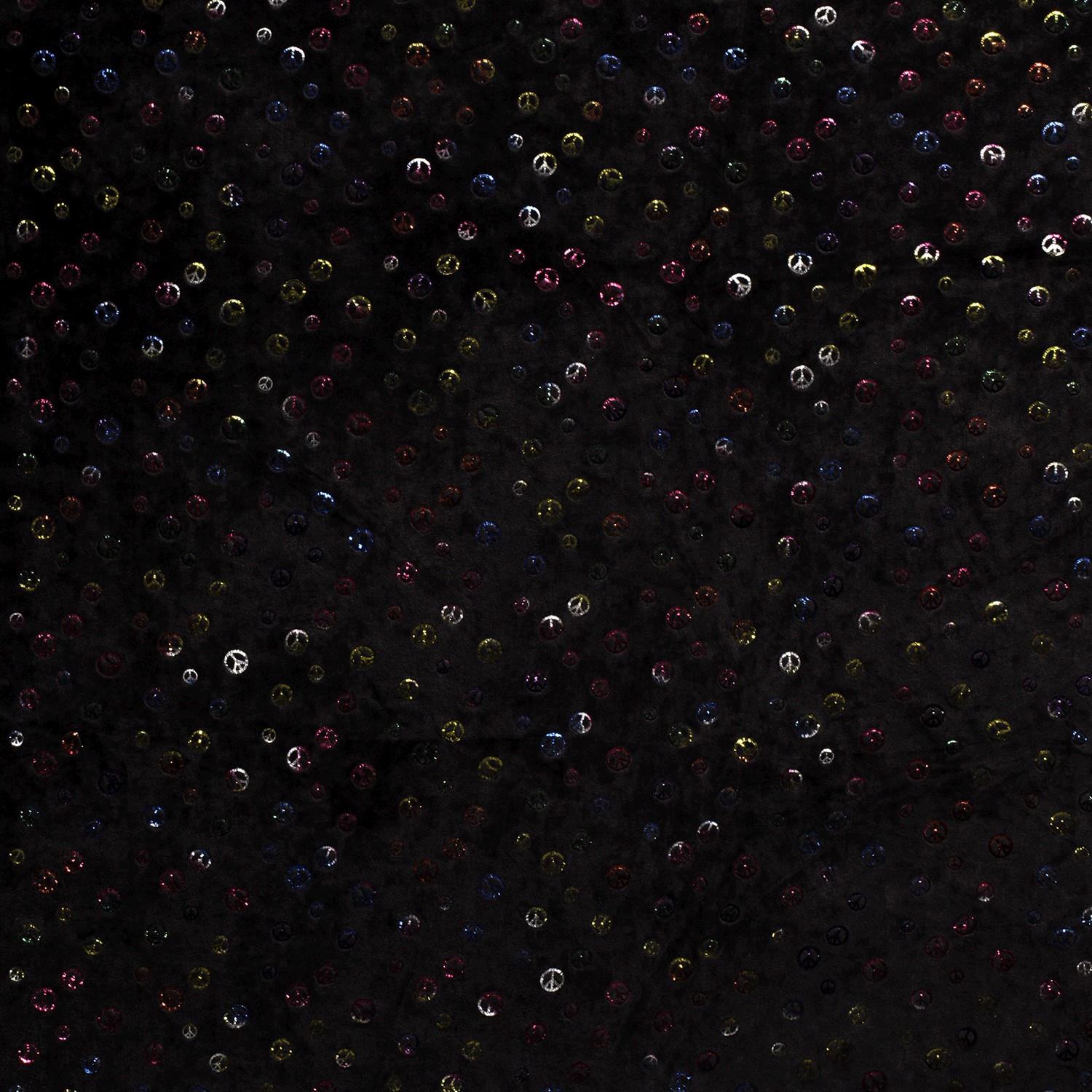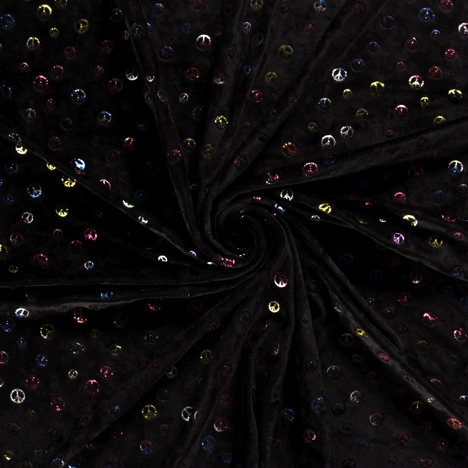Glamoröst, uttrycksfullt och med ett tydligt budskap: Denna exklusiva stretchsammet i djup svart blir en riktig blickfångare med en glänsande "Peace" folietryck. Den präglade ytan får motivet att skimra beroende på ljusets infall och ger tyget en spännande 3D-effekt – ibland diskret, ibland spektakulär.