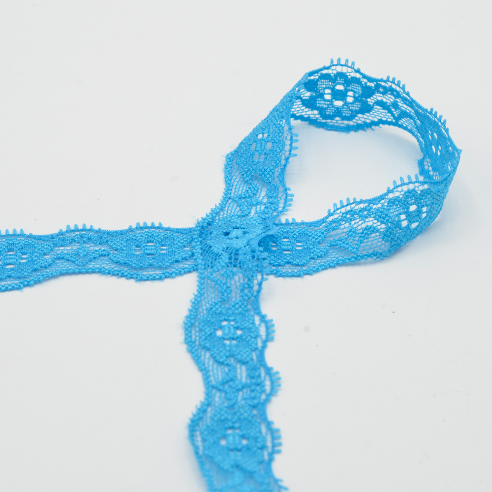 Delikat, fint och ändå elastiskt - det här stretchiga spetsbandet i ljus turkos ger en speciell touch till alla projekt. Det fina mönstret med små blommor och vågmotiv har en romantisk och lekfull effekt, medan den klara, fräscha färgen ger en modern accent.