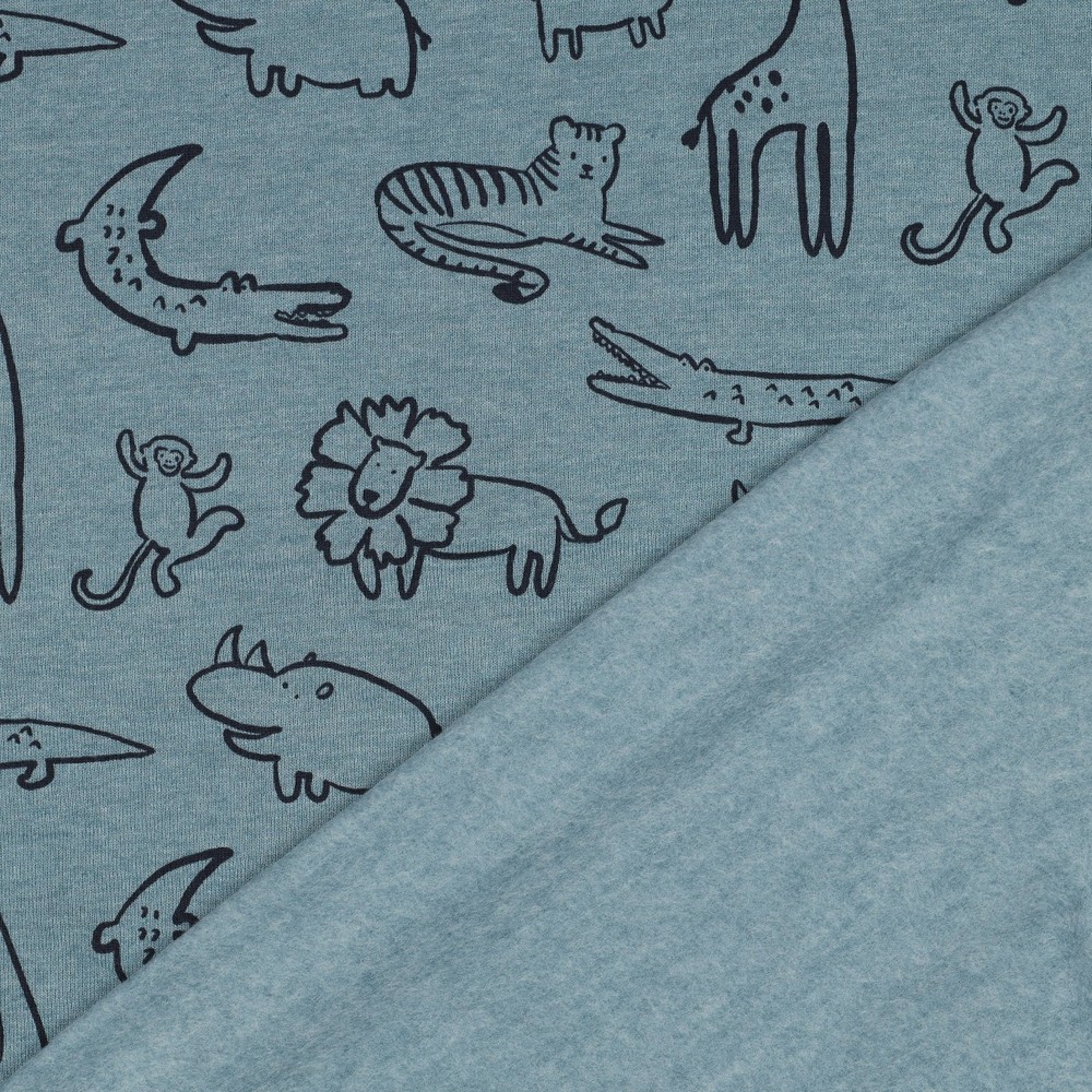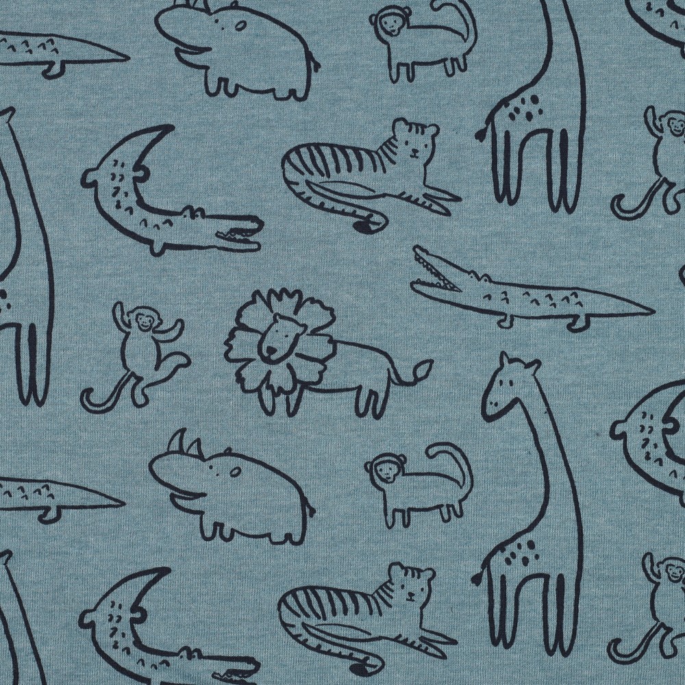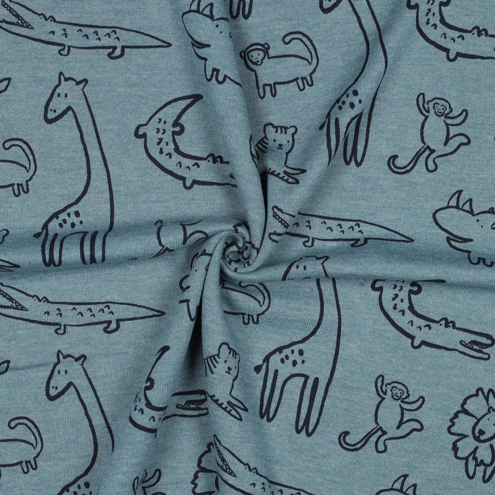 Ett tyg som en liten resa i det vilda: den melerade petrolbakgrunden pryds av kärleksfullt illustrerade djur som omedelbart fångar blicken. Lekfulla lejon, zebror, elefanter, giraffer och andra djungel- och savannvarelser hålls i varma naturtoner - från mjuka beige och bruna nyanser till delikat grått och subtila accenter i orange och gult.