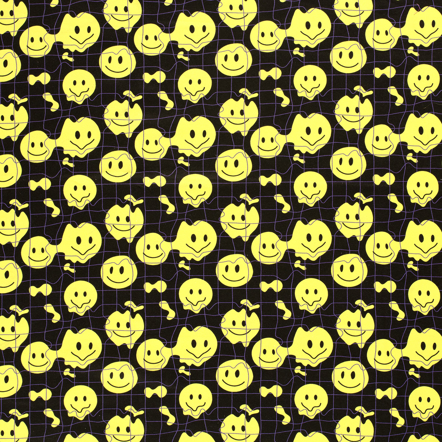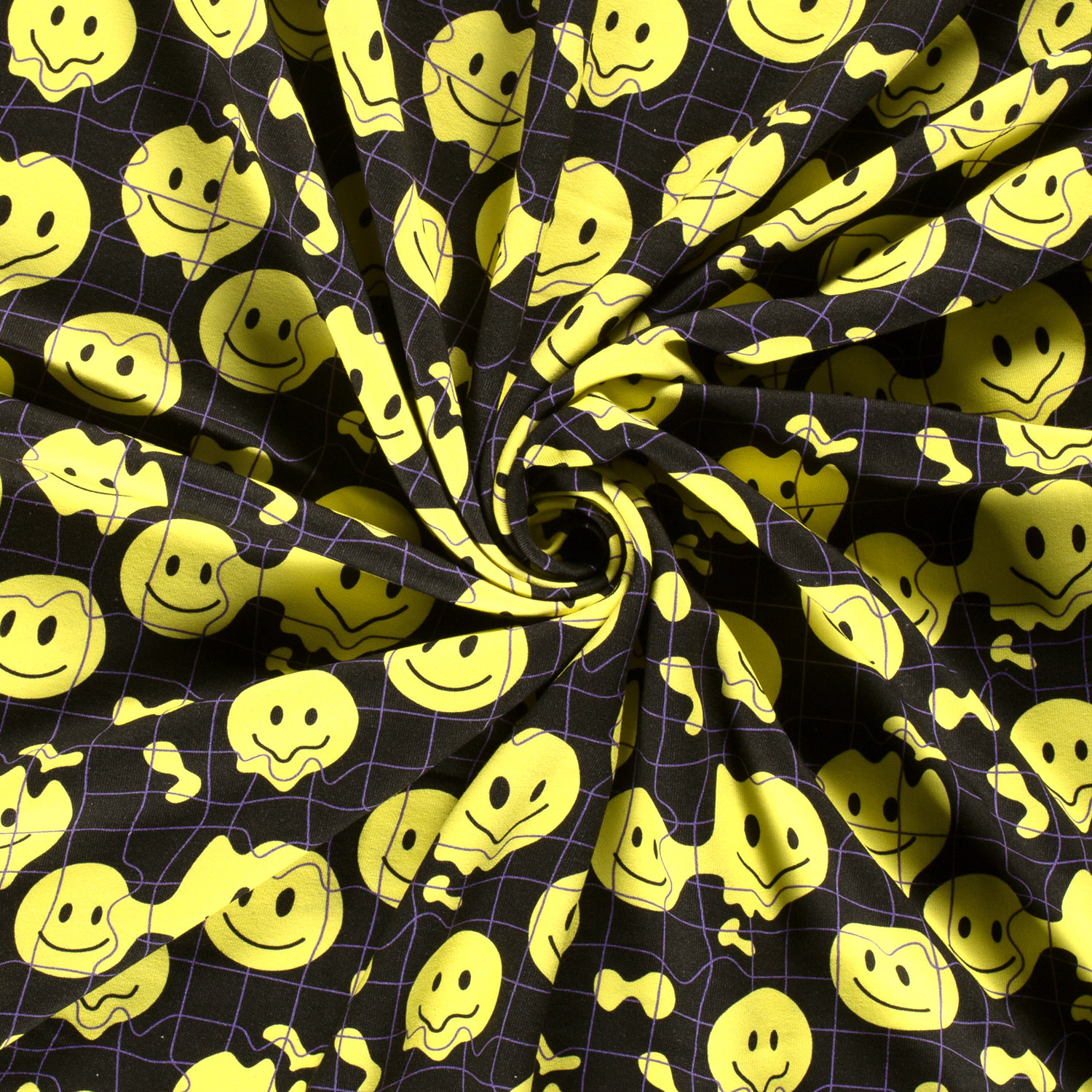 Denna mysiga borstade sweatshirt ger massor av gott humör till dina syprojekt! På en djup svart bakgrund leker glada smileys i lysande gult – ibland brett leende, ibland coola, ibland bara för att le åt. Den starka kontrasten mellan svart och gult gör designen modern, iögonfallande och samtidigt lätt att kombinera med många enfärgade tyger.